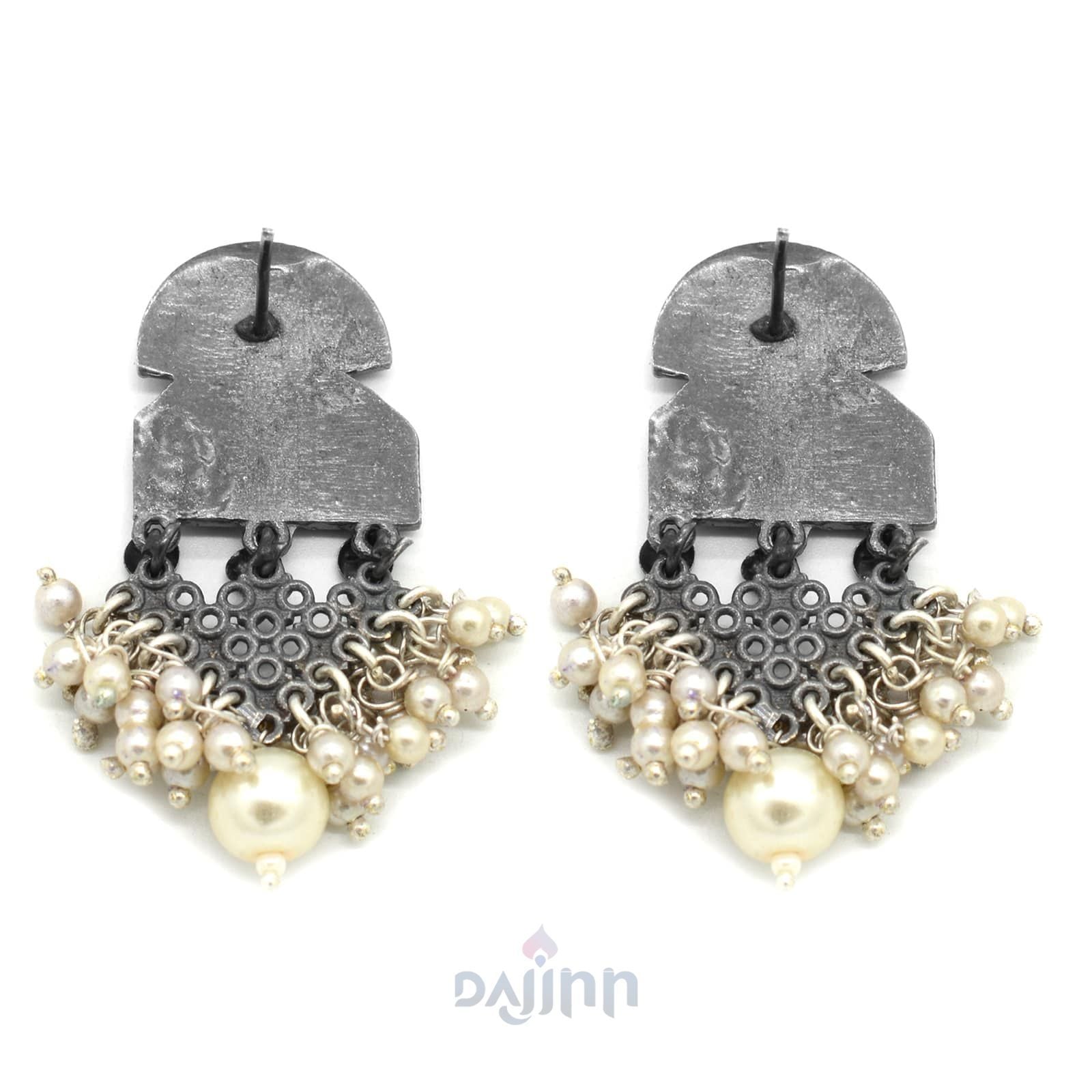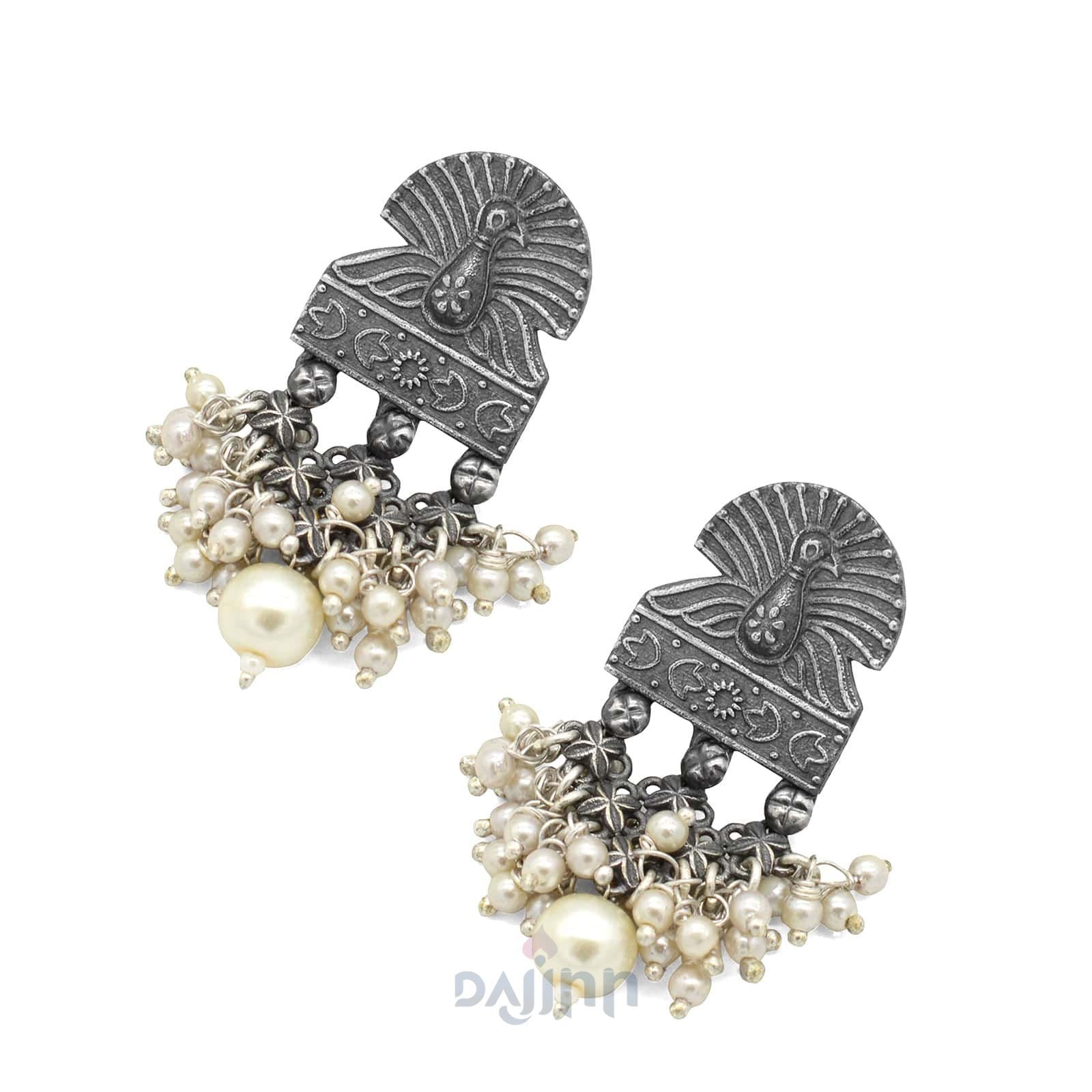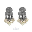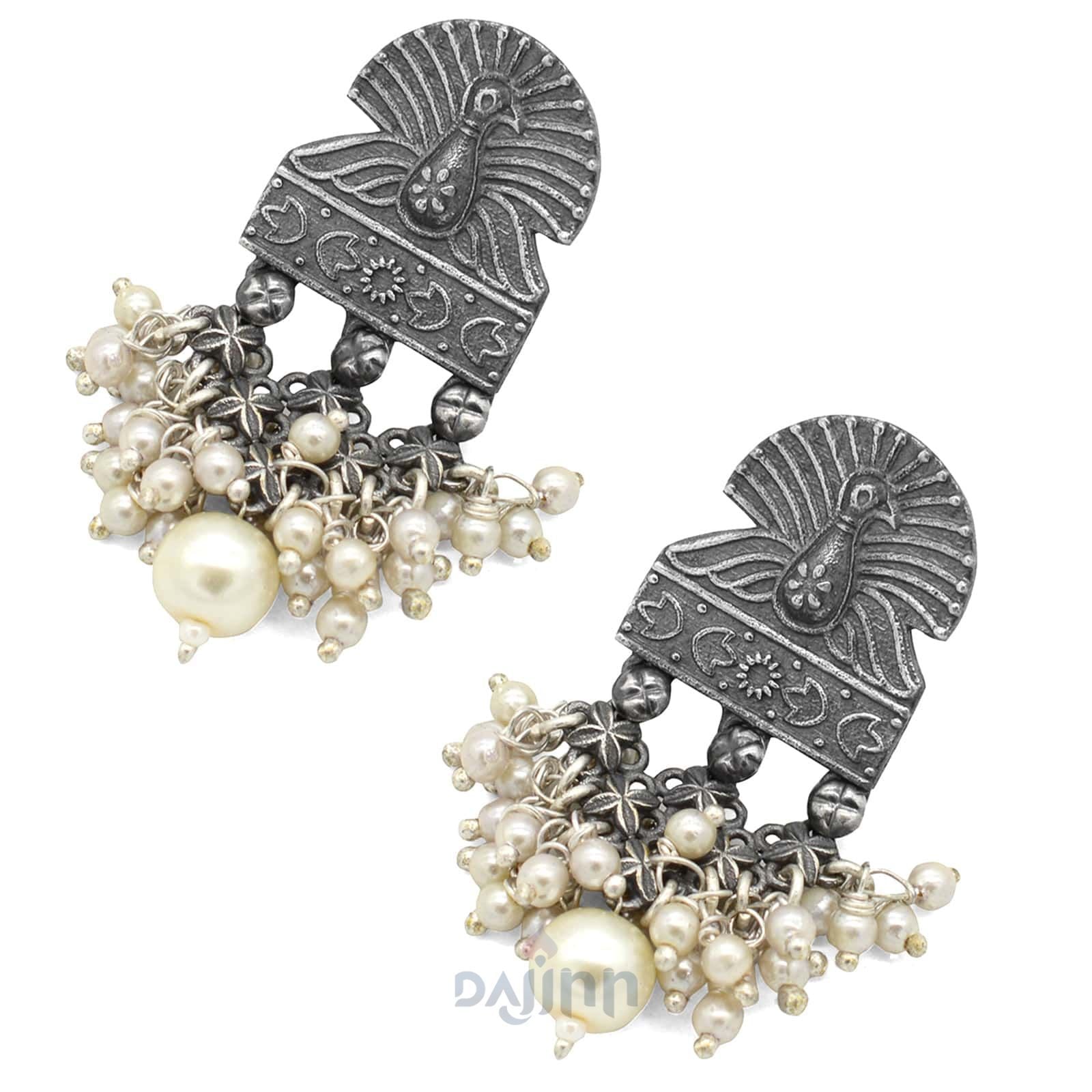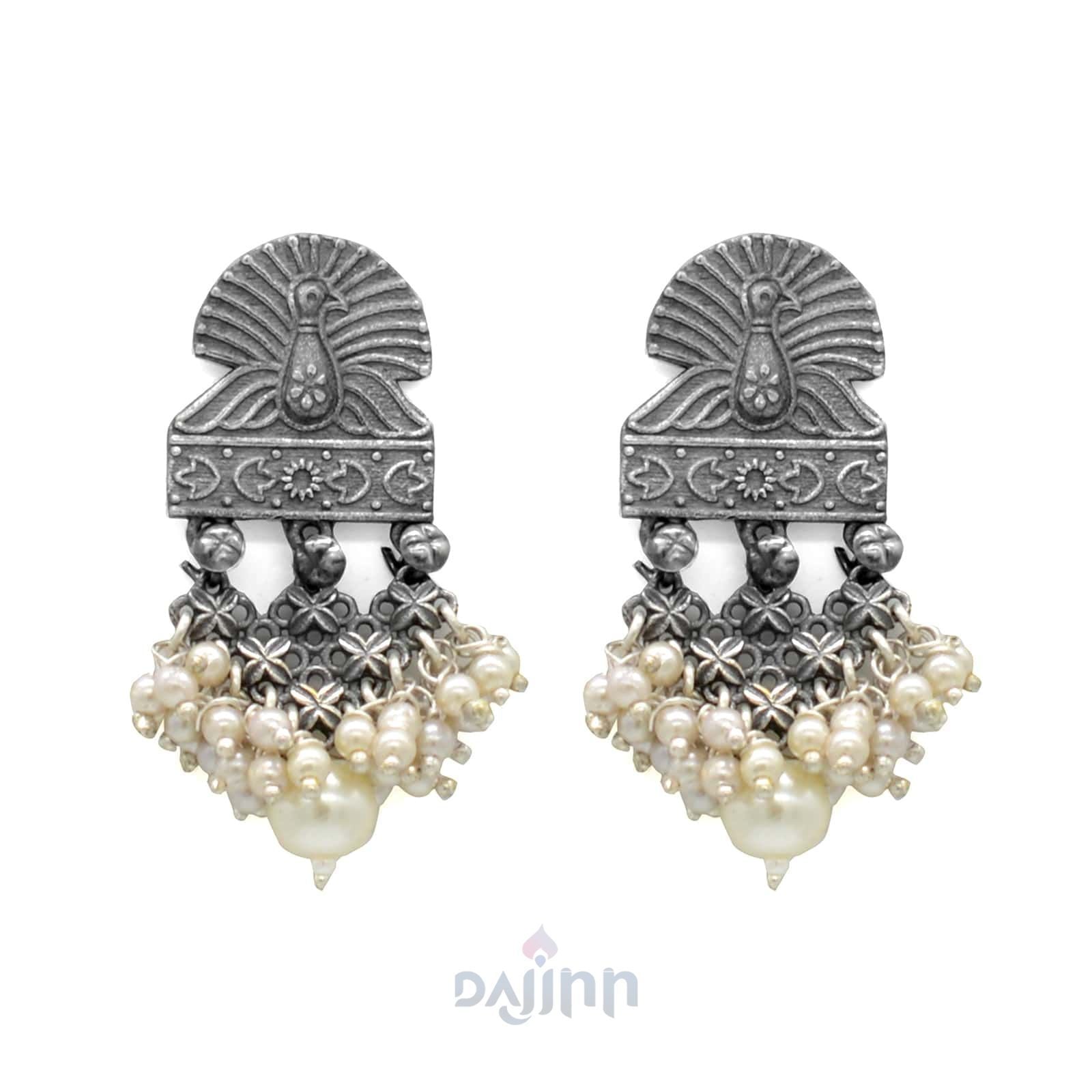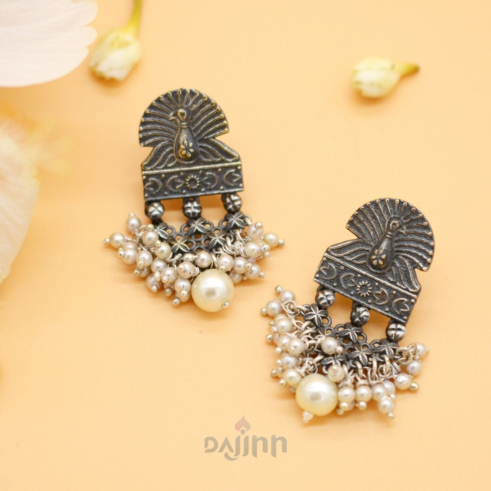 Delve into the world of finely crafted classics that powerfully capture the beauty of modern?ÿIndian craftsmanship. This elegant pair of oxidised silver plated stud earrings dressed up with tinkling pearl hangings and delicate filigree & peacock details, is one of our personal favourites. These earrings make effortless addition to your white hued attires, be it indian or western. A funky pair that can be used practically everyday and with various outfits and will definitely add to your style story.