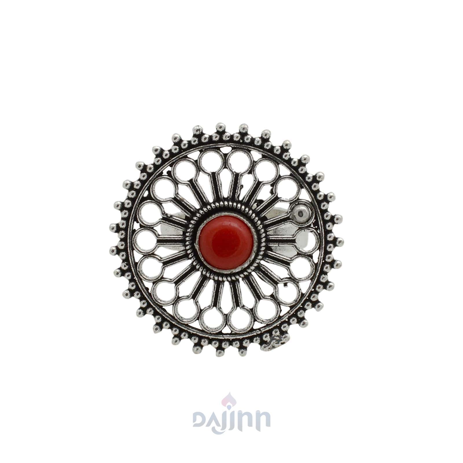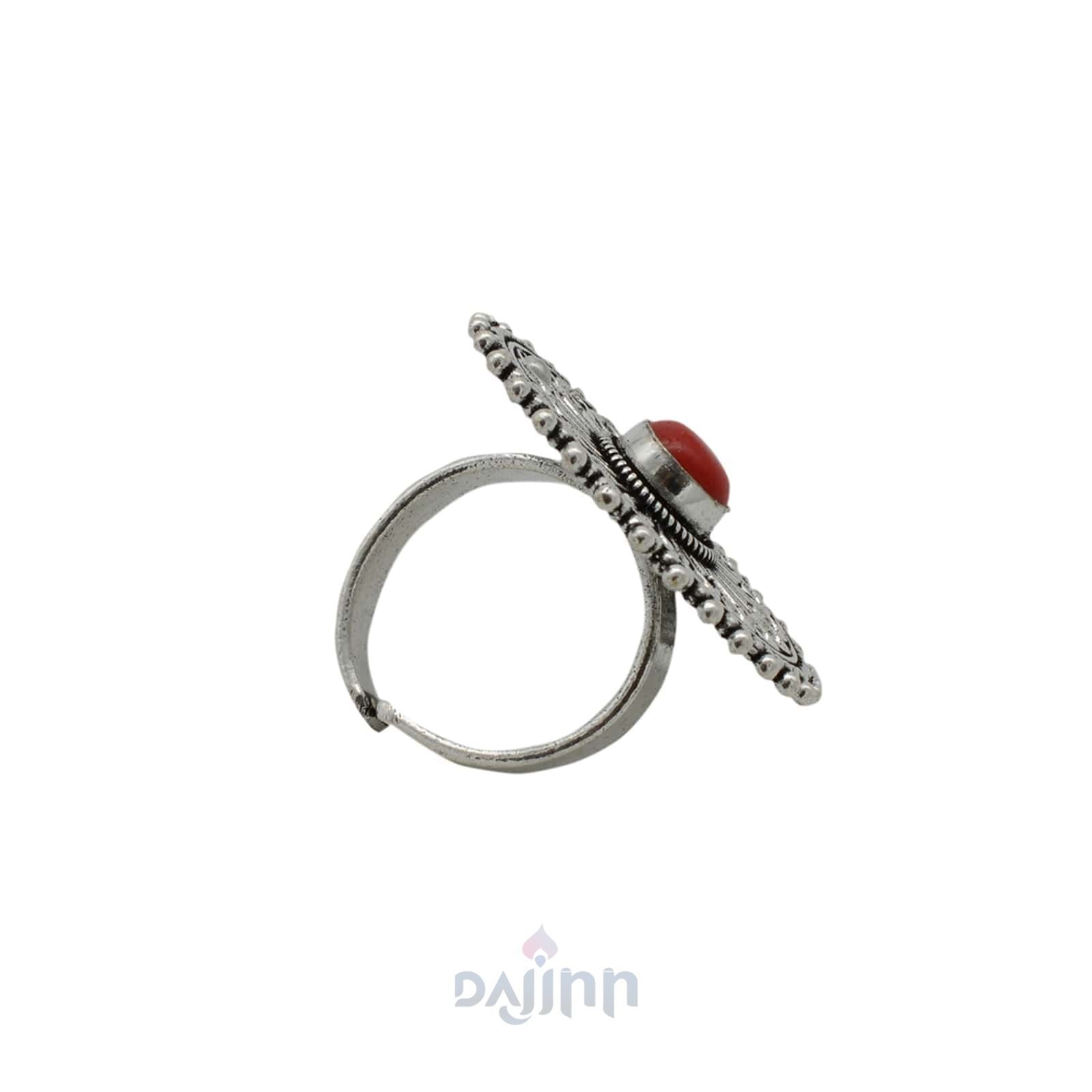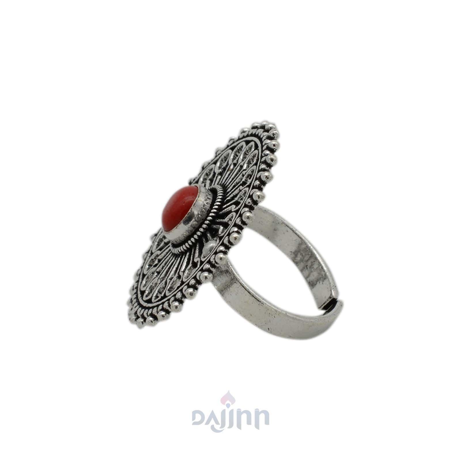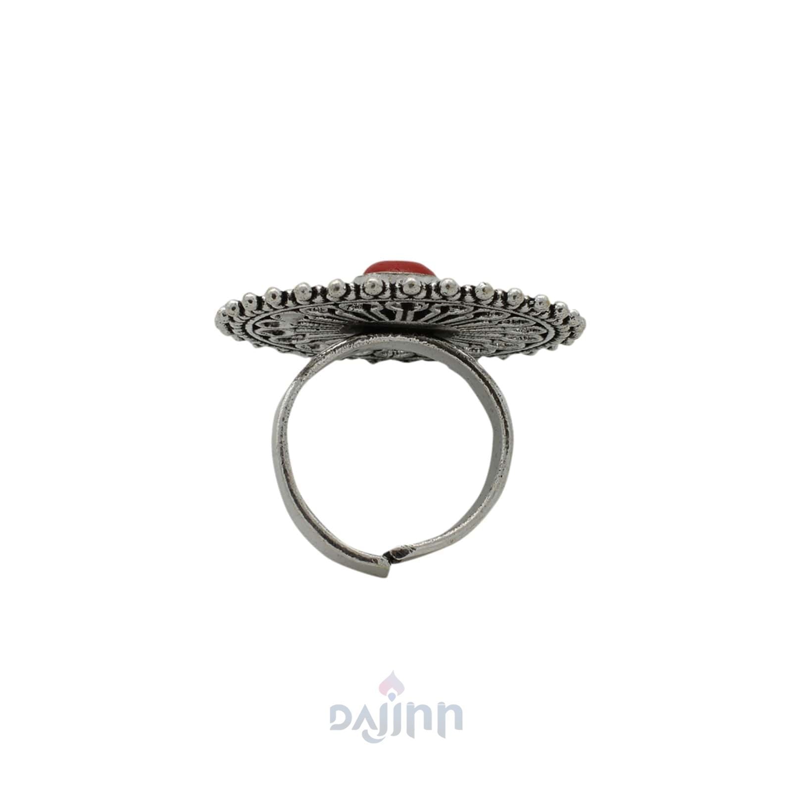 Aruna Red Silver Oxidized Ring, a simple ring that adds a touch of pretty with its floral motif that is imbibed with red stone. The ring is just the right size when you are looking for something elegant, polished, and pretty. Works wonderfully as an accessory that does not take over your outfit – sometimes that is just what you need.
