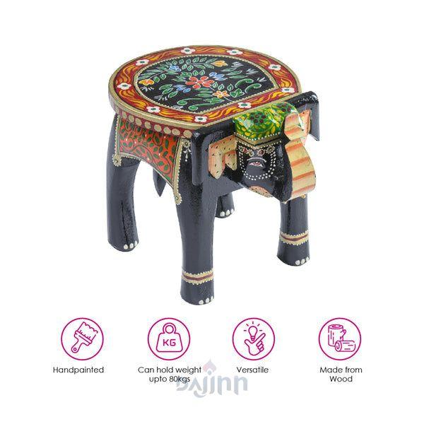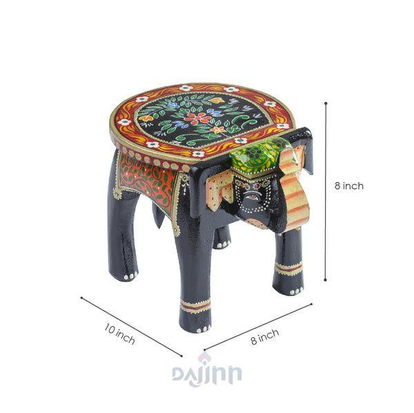 The Black Colourful Handpainted Wooden Elephant Stool combines bold black tones with vibrant detailing, adding charm to your Diwali decor and living spaces.