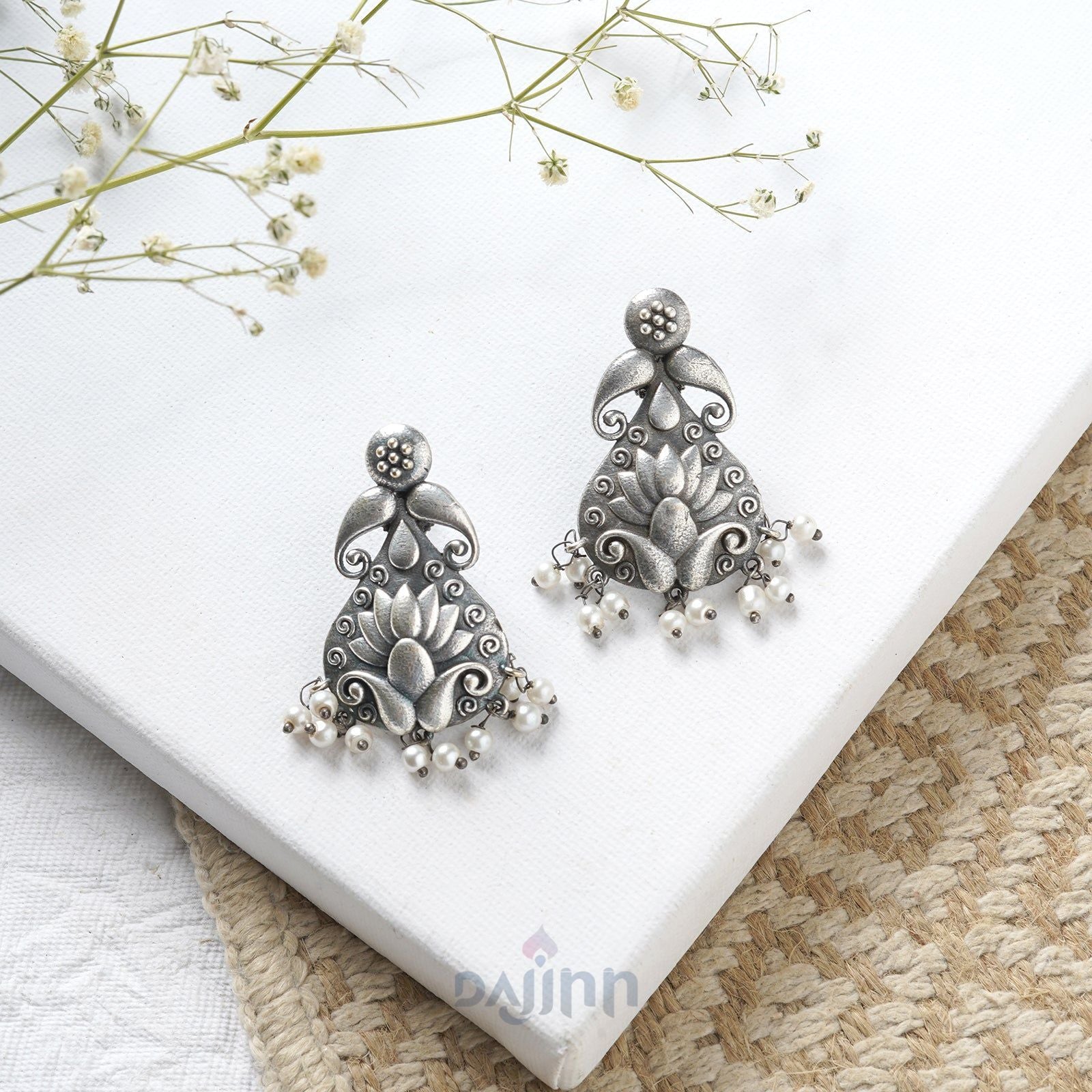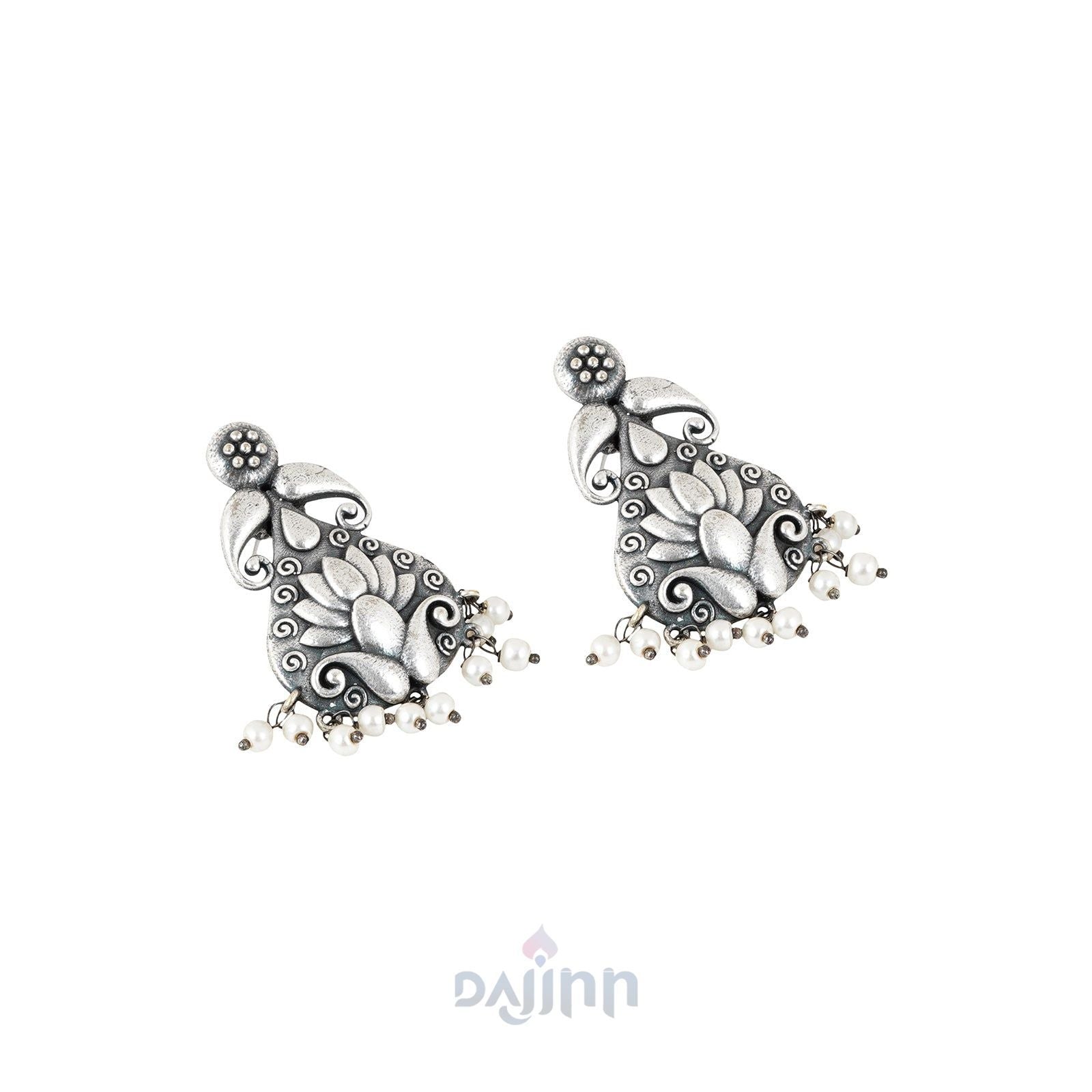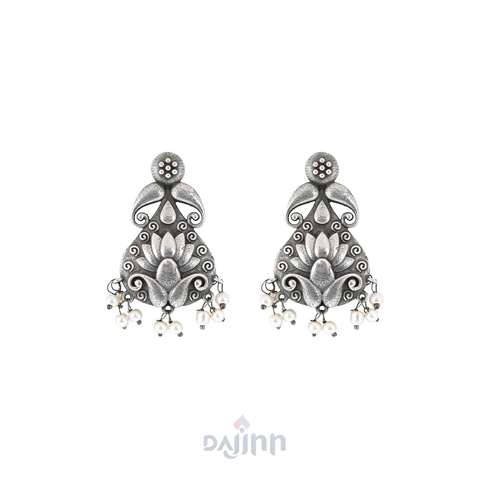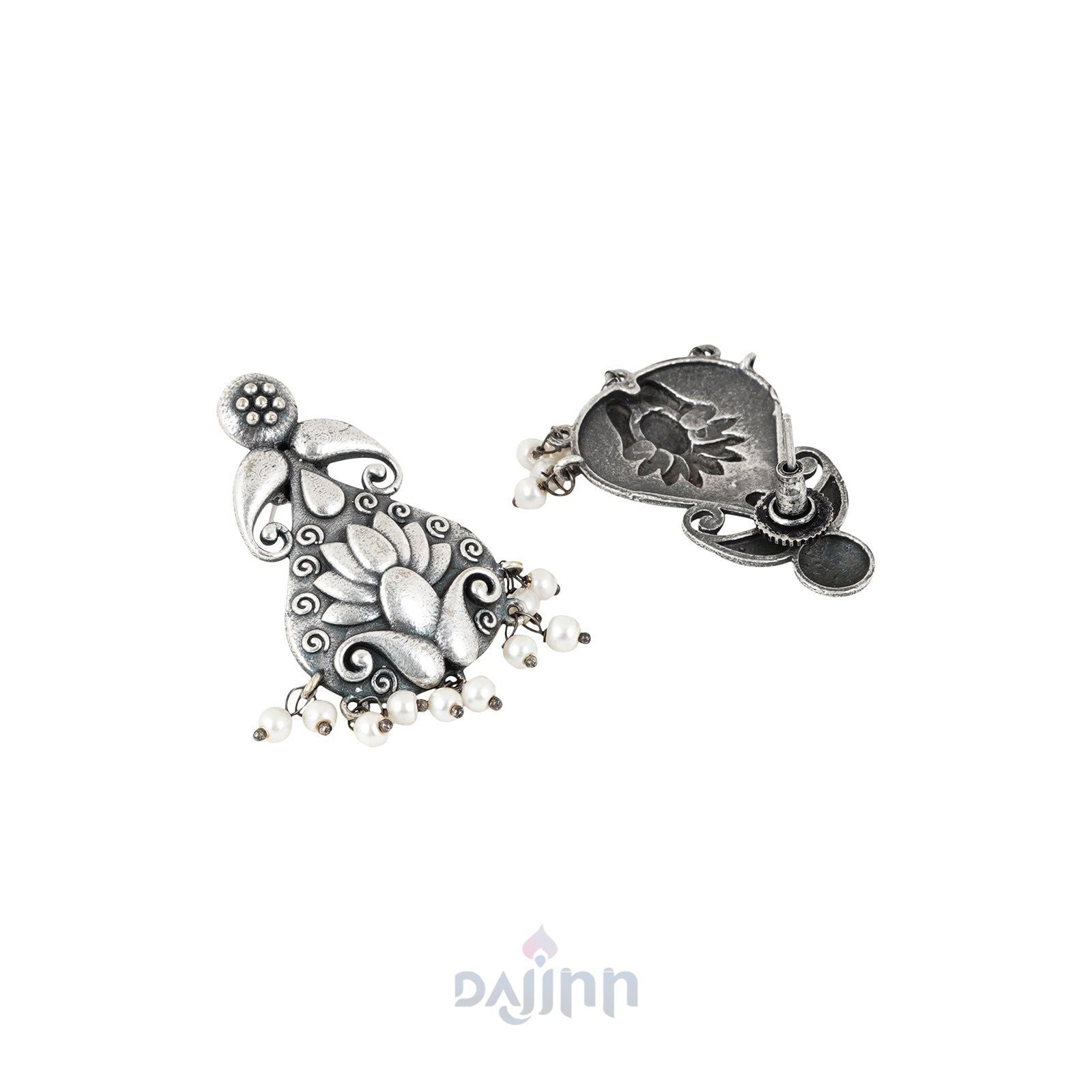 A pretty pair of earrings that you'd always pick no matter what the occasion is. This pair of earrings is crafted in silver oxidized featuring intricate floral motifs with tiny pearl drops that adds an instant flair of royalty to your looks.