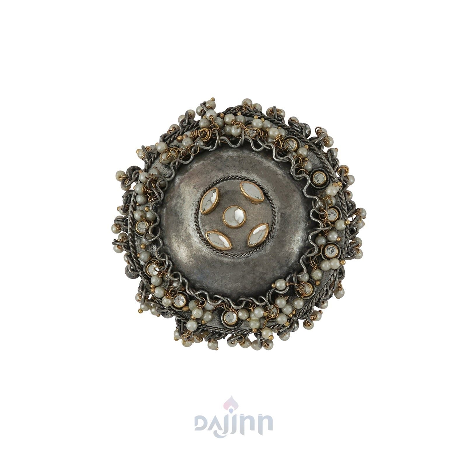 Our Dajinn Aajita Silver Oxidized Ring is brimming with details that add to its elegance. The ring is the kind you�d want to slip into, all day every day and the muted oxidized finish makes it possible to do so.