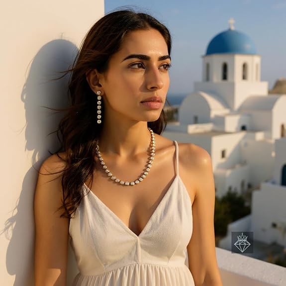 - Graceful Dangling Earrings – Long, light-catching earrings that complement the necklace with movement and allure.