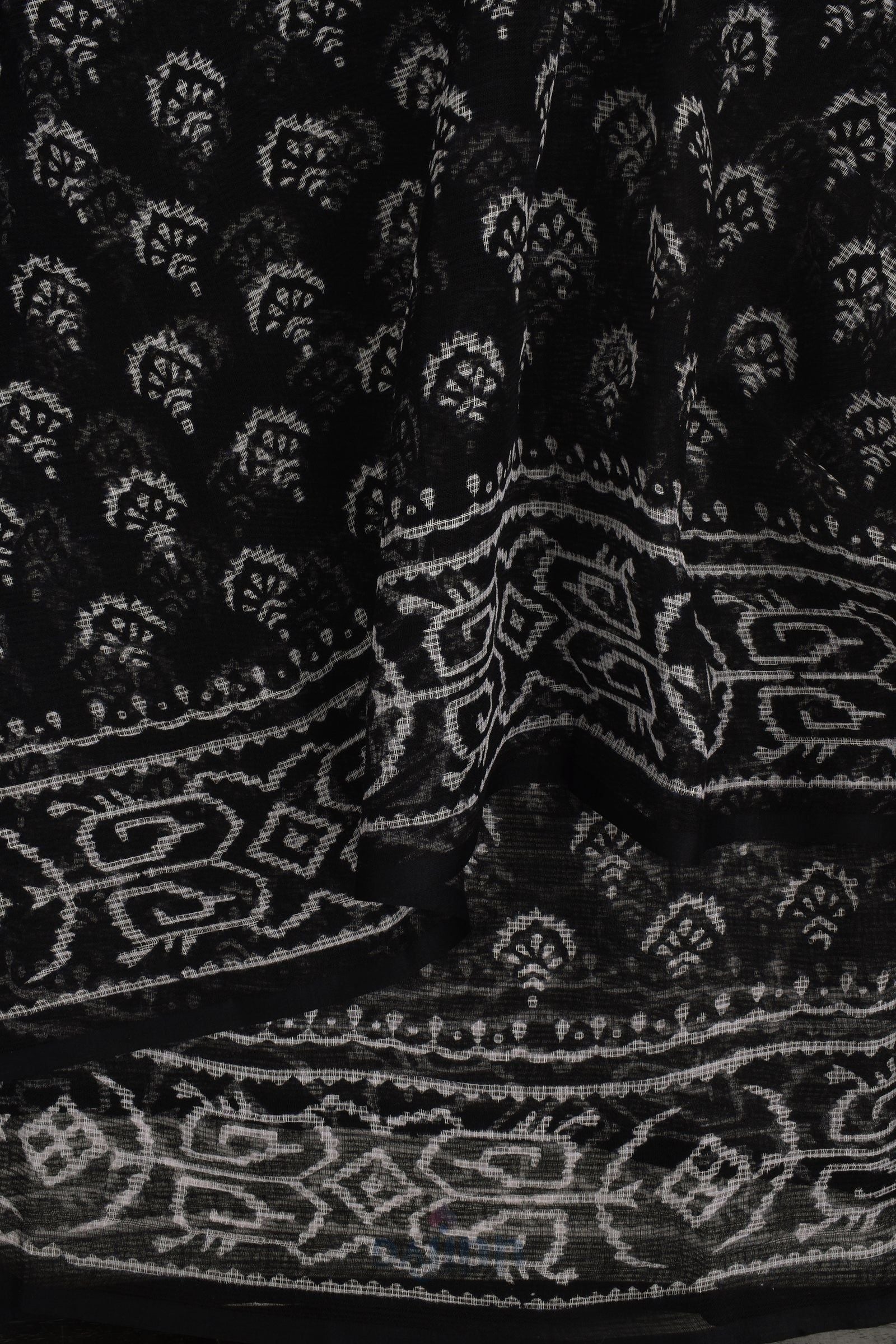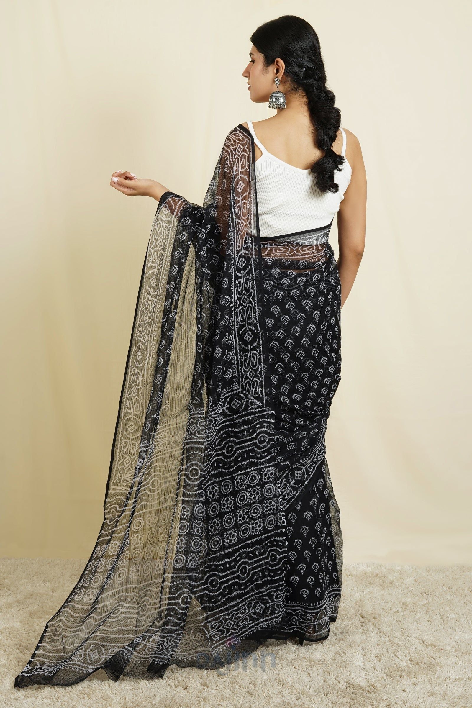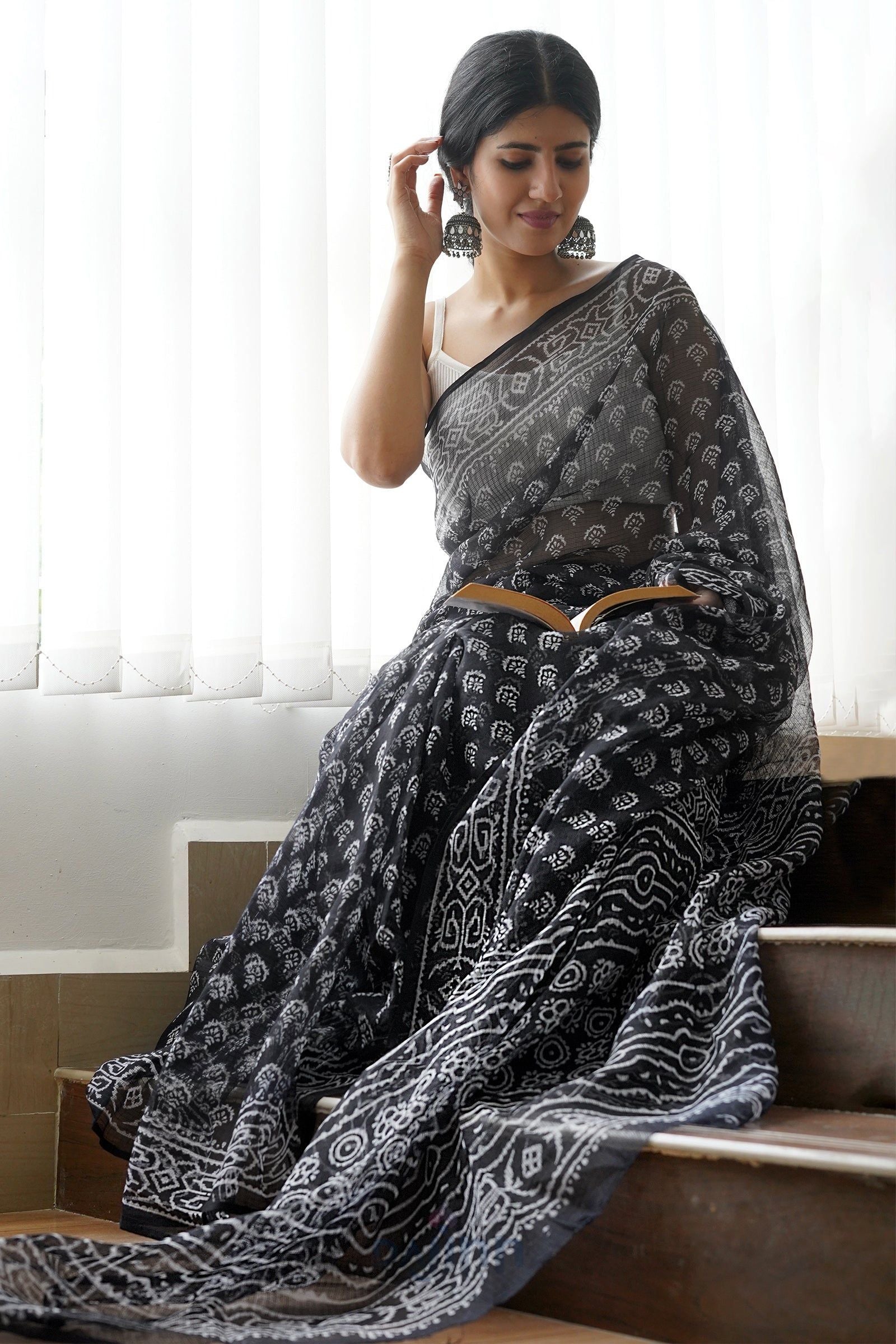 AYSR Boutique Aesha Black and White Block Print Kota Saree With Blouse Piece