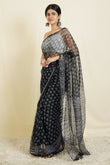 Black always creates a mystical tale! Our Aesha Black Kota Doria Saree features a rich silhouette that will be a major head-turner! Style this up with oxidized jewelry, a sleek hairdo, and your favorite heels, and you are good to go!