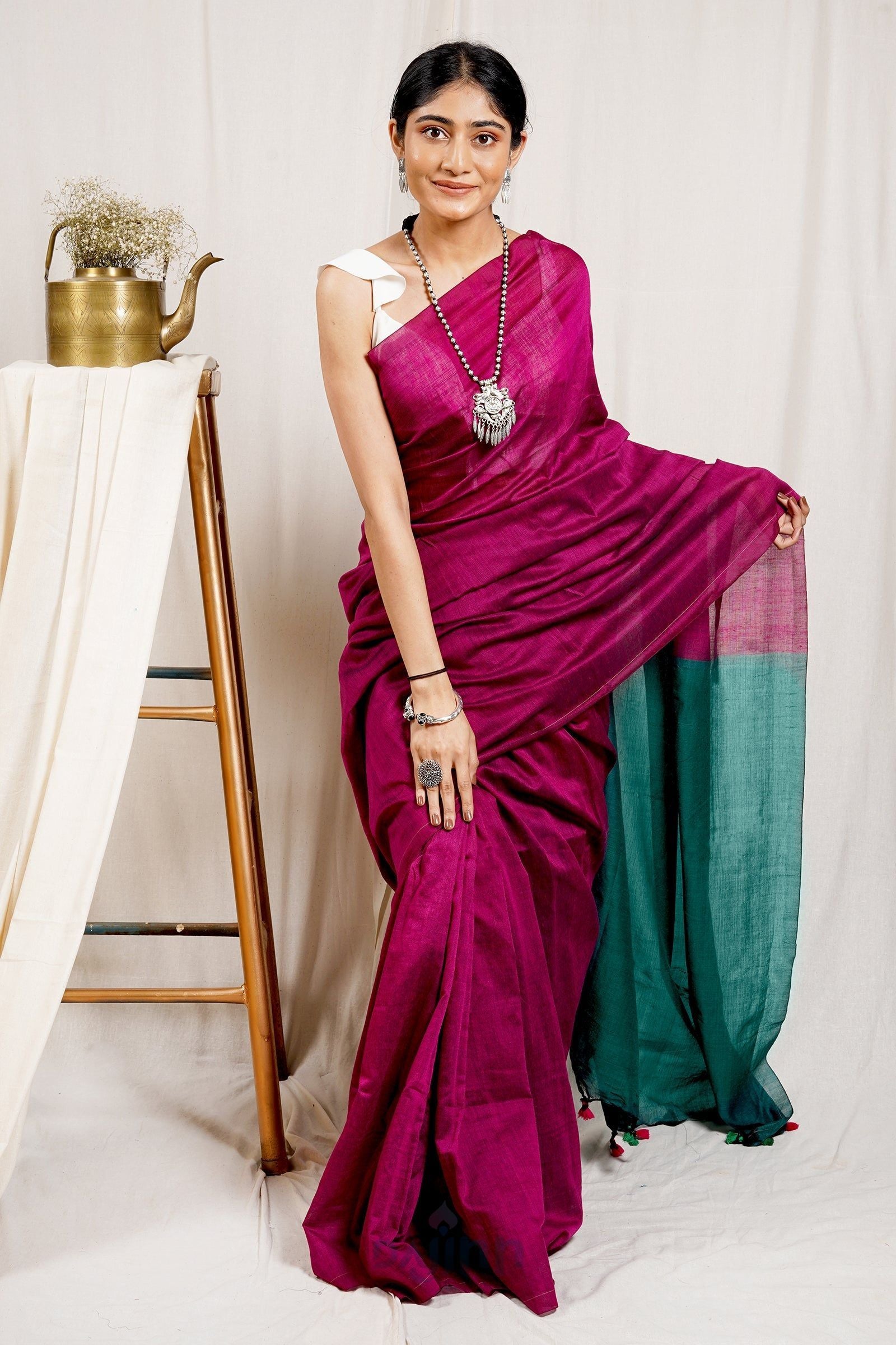 A unique blend of Pink and green that will make all heads turn this season! This saree is crafted in the most traditional fabrics- Mulmul. It hugs you gracefully to give you a charming look. Style this up with our banjara collection for a classy boho look!