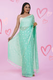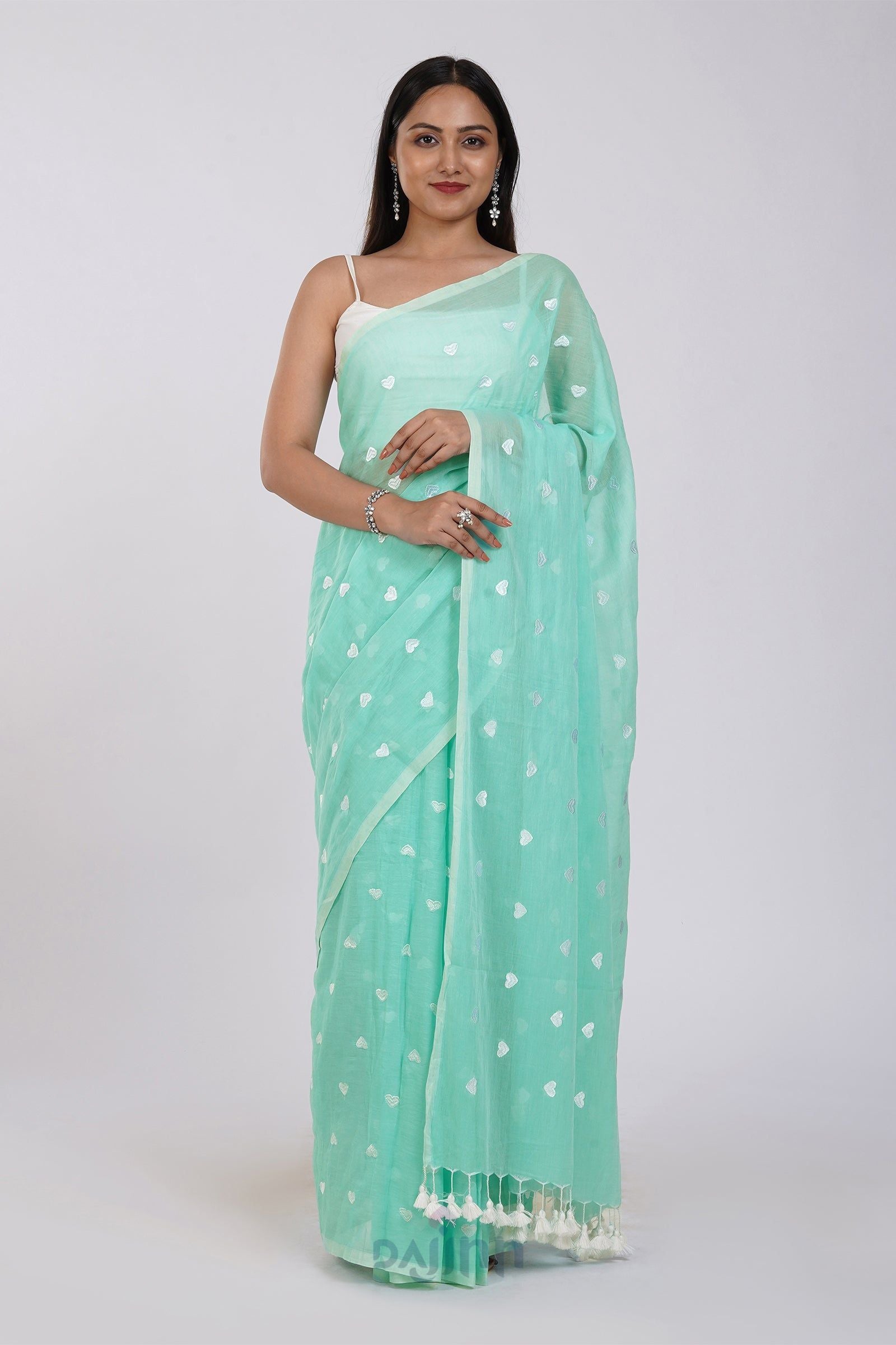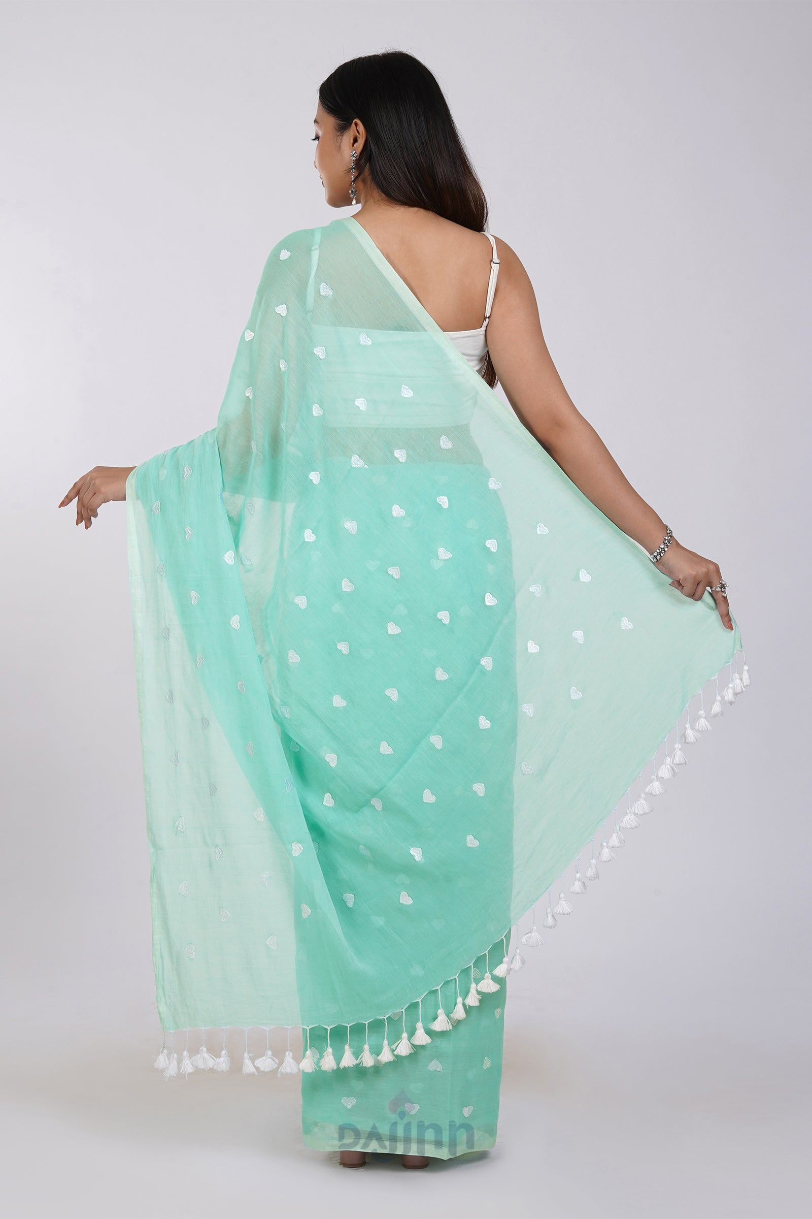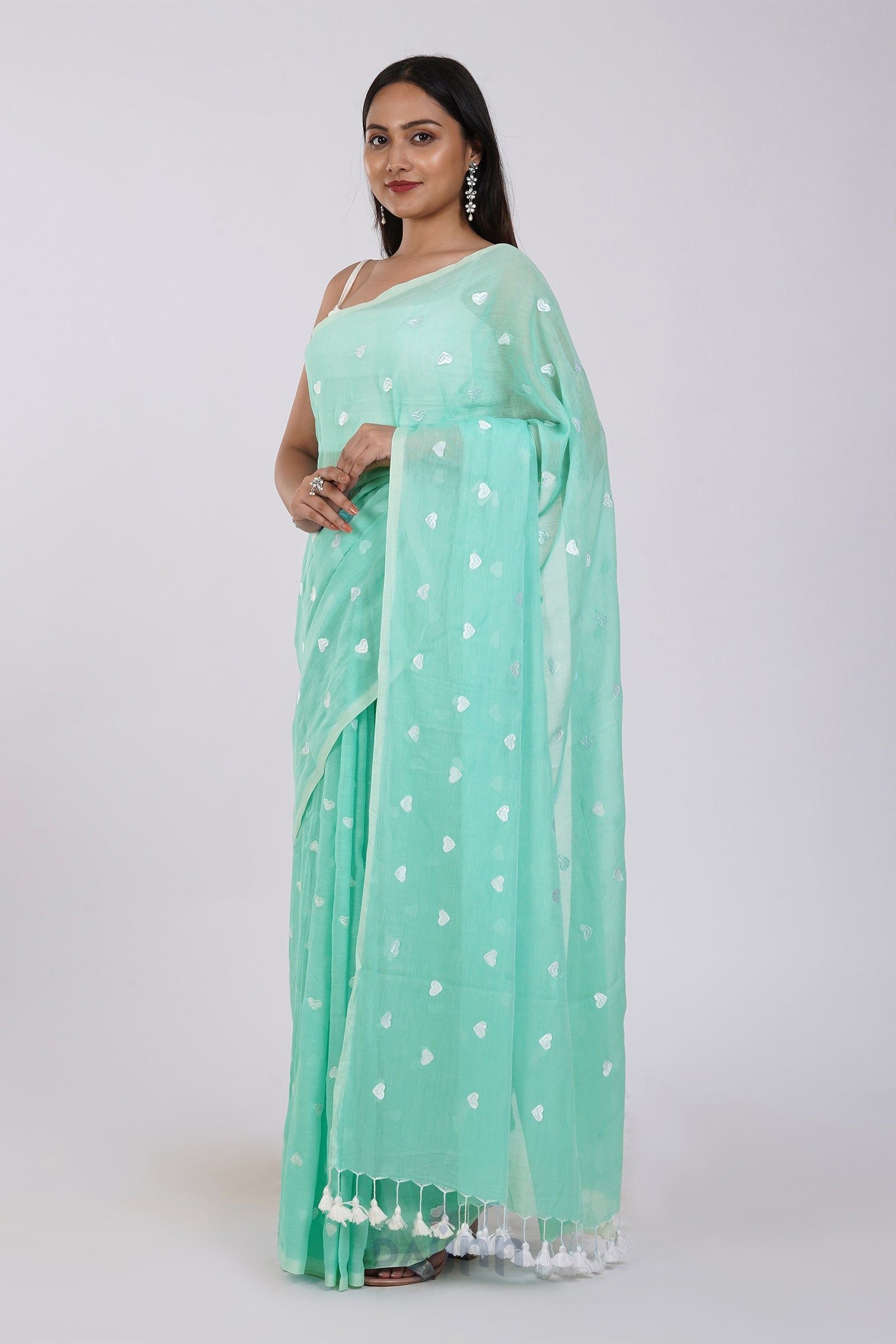 AYSR Boutique Chahna Sea Green and White Mul Cotton Heart Embroidery Saree