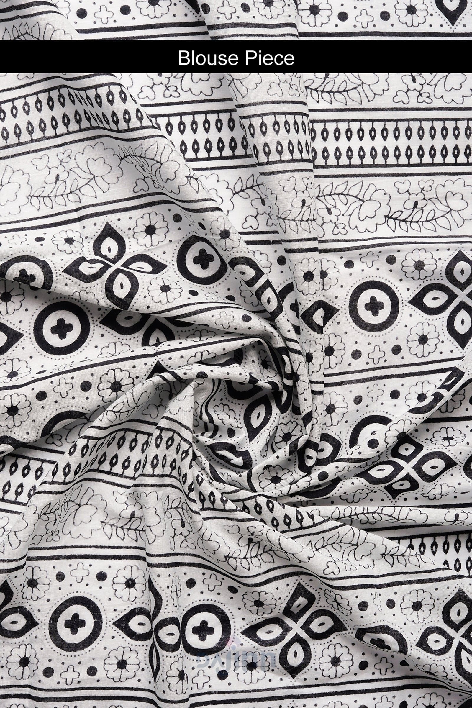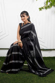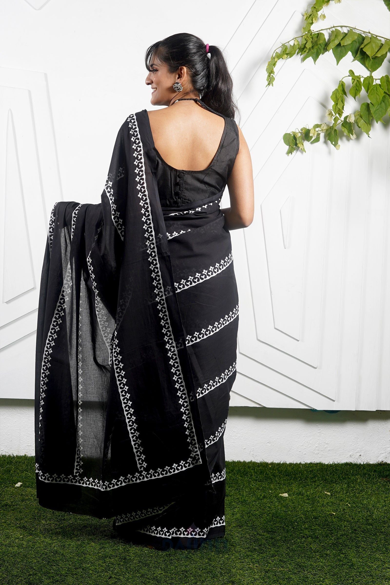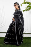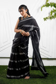 Black saree is perhaphs most adorned and prettifies your look for any occassion instantly. Our Chameli Black & White Print Mulmul Cotton Saree is simple with its white intricate designs and extremely lighweight with its flowy fabric and makes dressing effortless. Style this up with your favourite oxidised jewelry for a bold look!