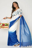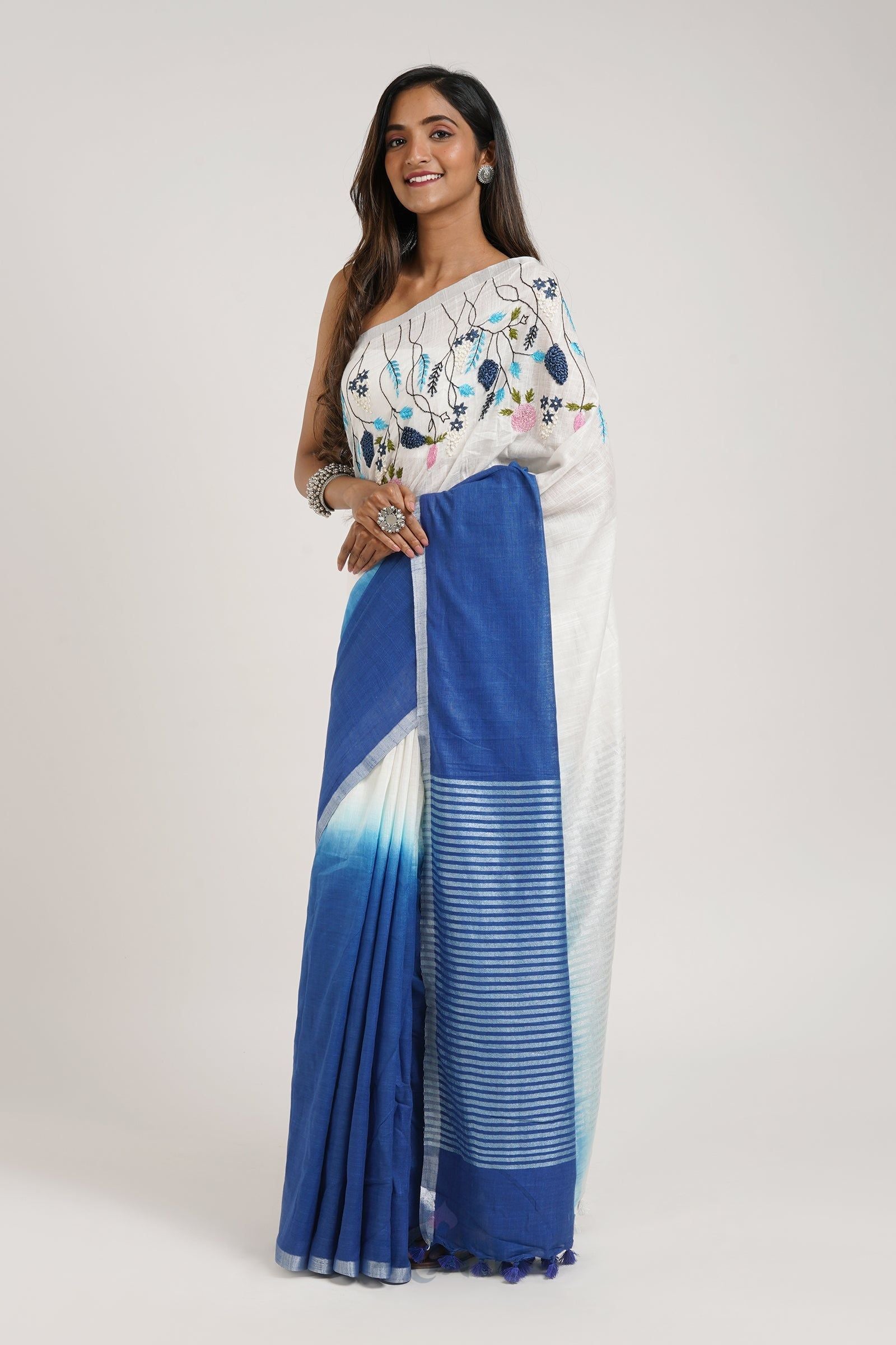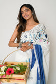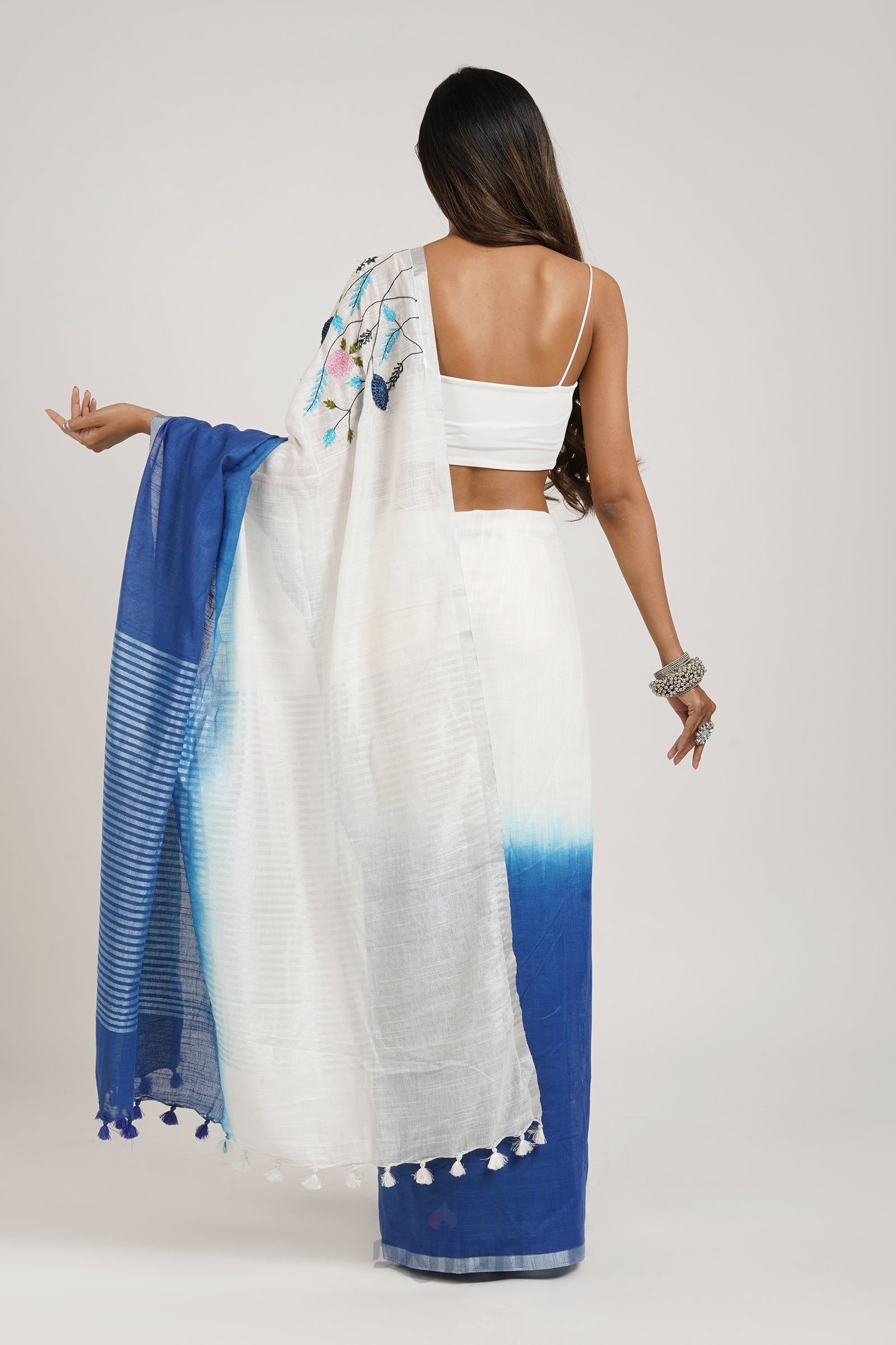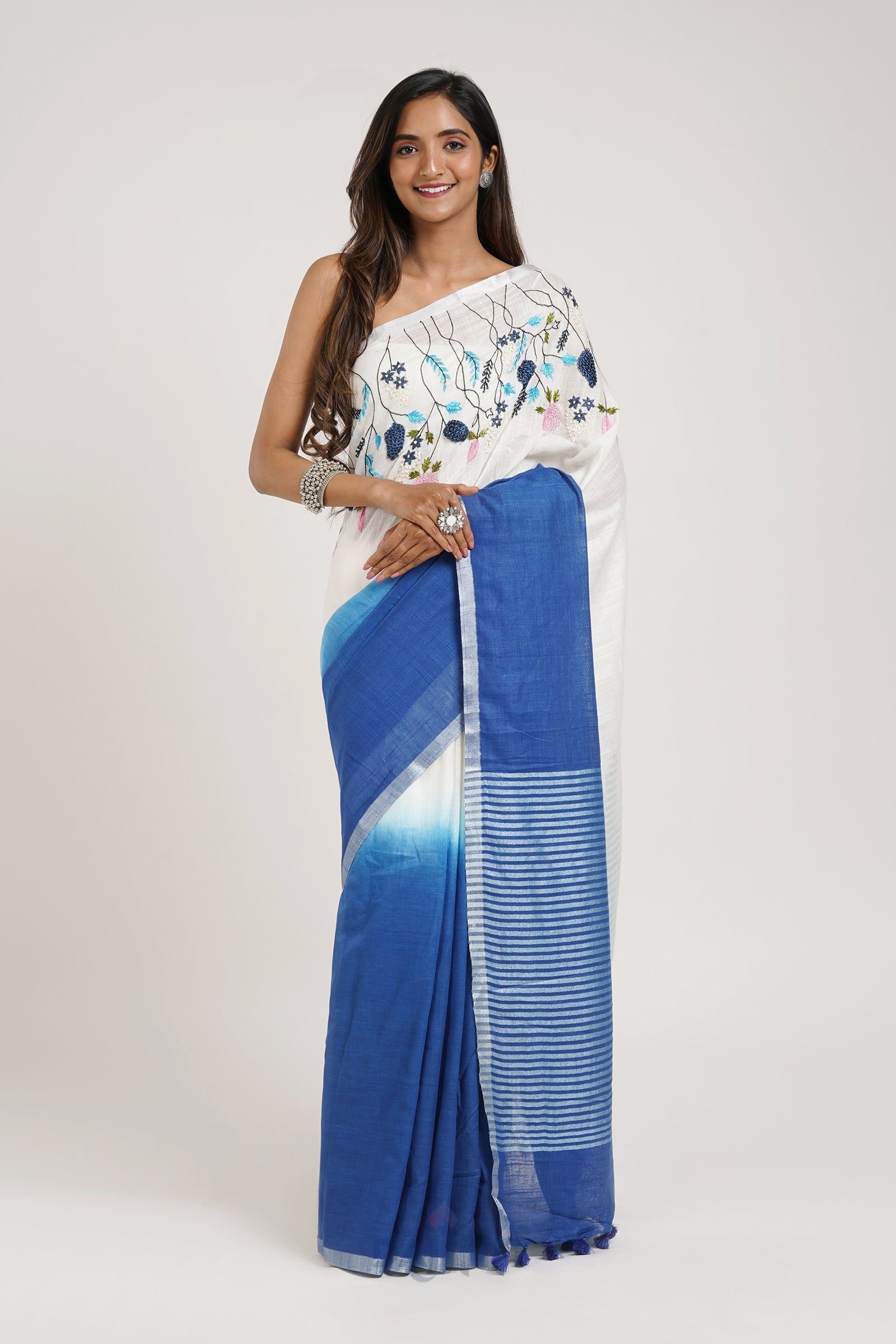 AYSR Boutique Floral Wave Blue and White Linen Saree with Blouse Piece