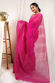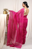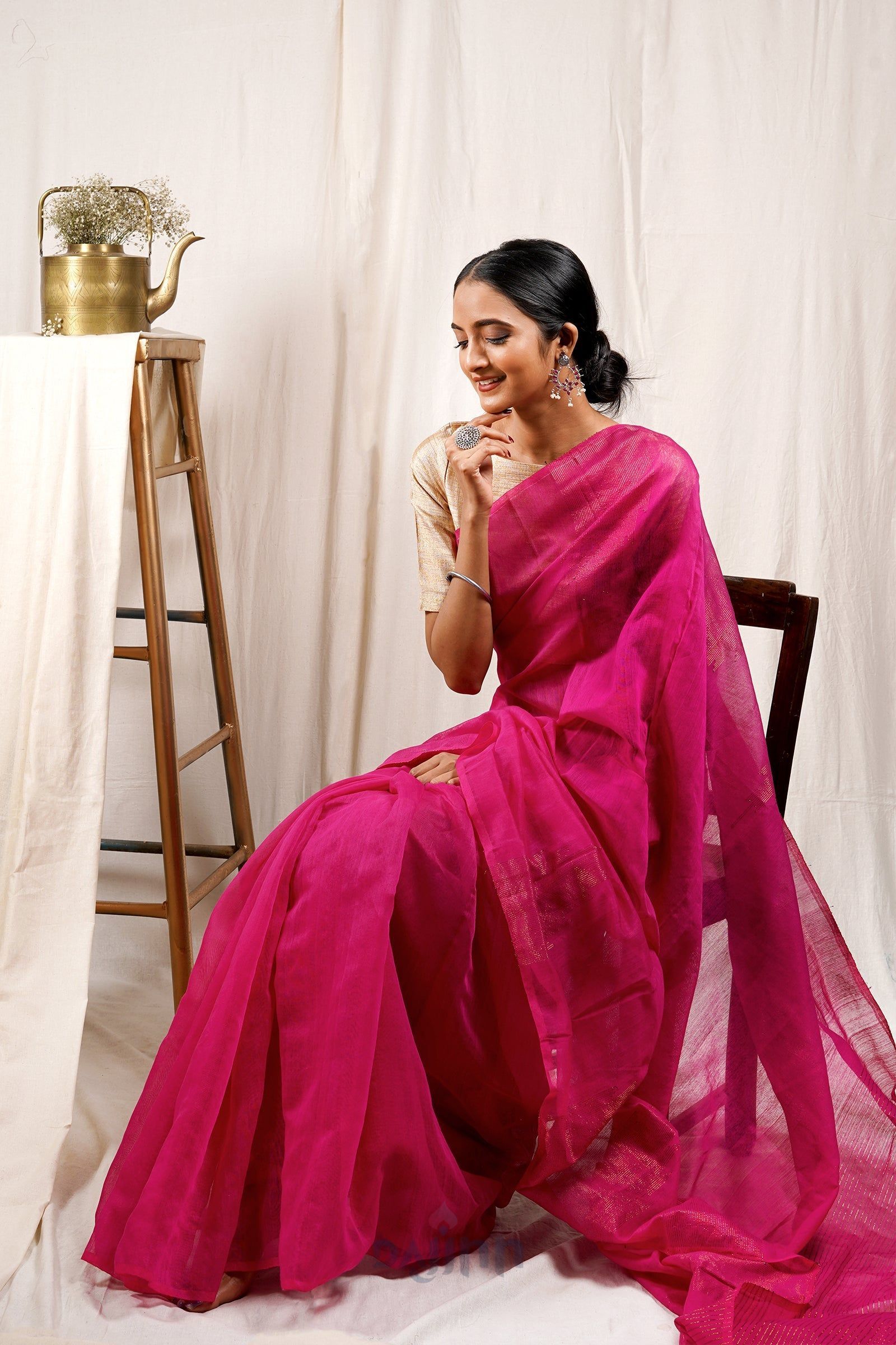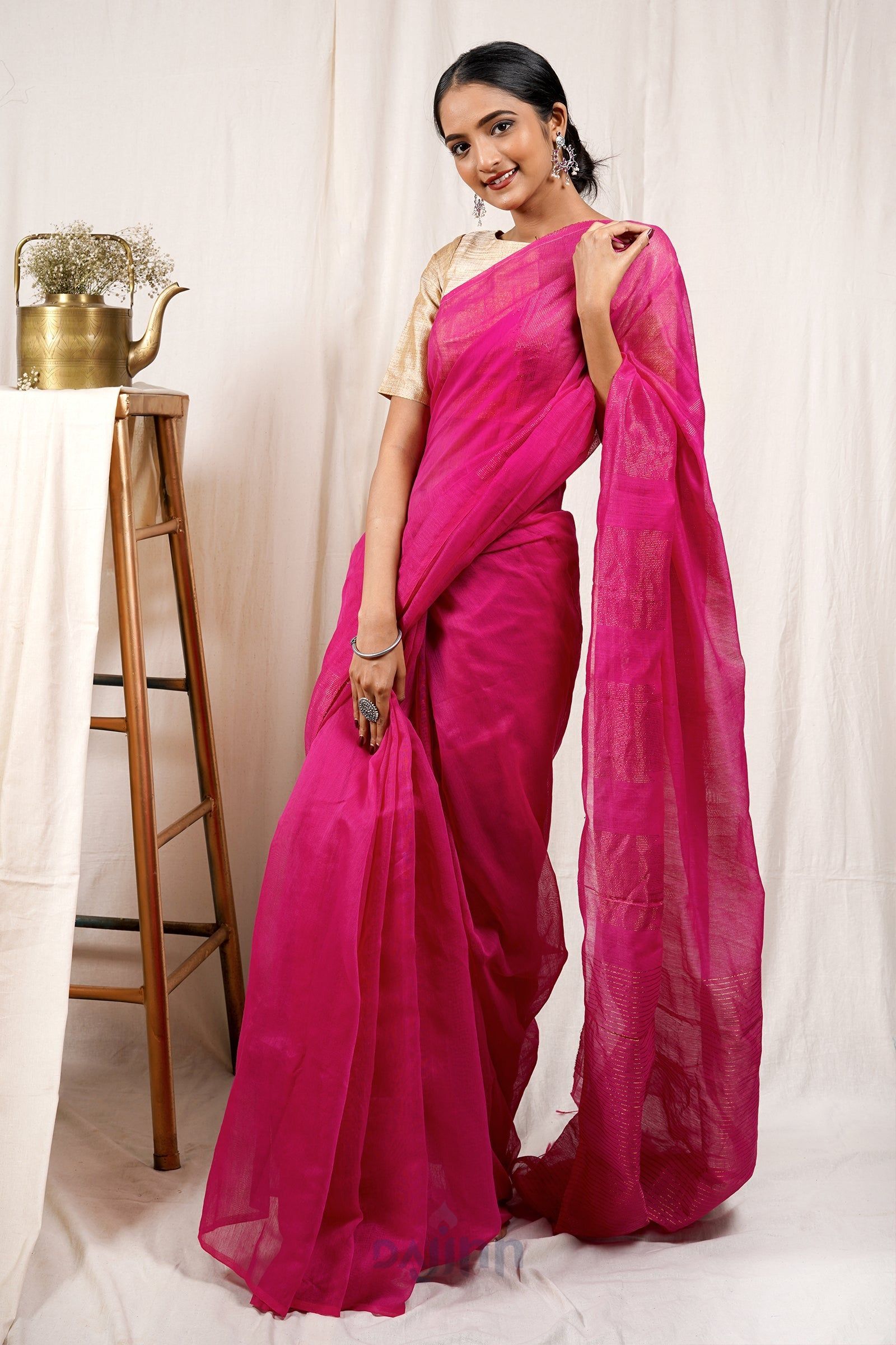 Flaunt simplicity and grace with this Fuschia Love handloom cotton silk zari saree. This saree gracefully combines soft cotton and shiny zari to give you a rich and vivid look. A perfect pick for your casual day events. Style this up with our oxidized jewelry, sleek hairdo and strappy heels for an alluring look!