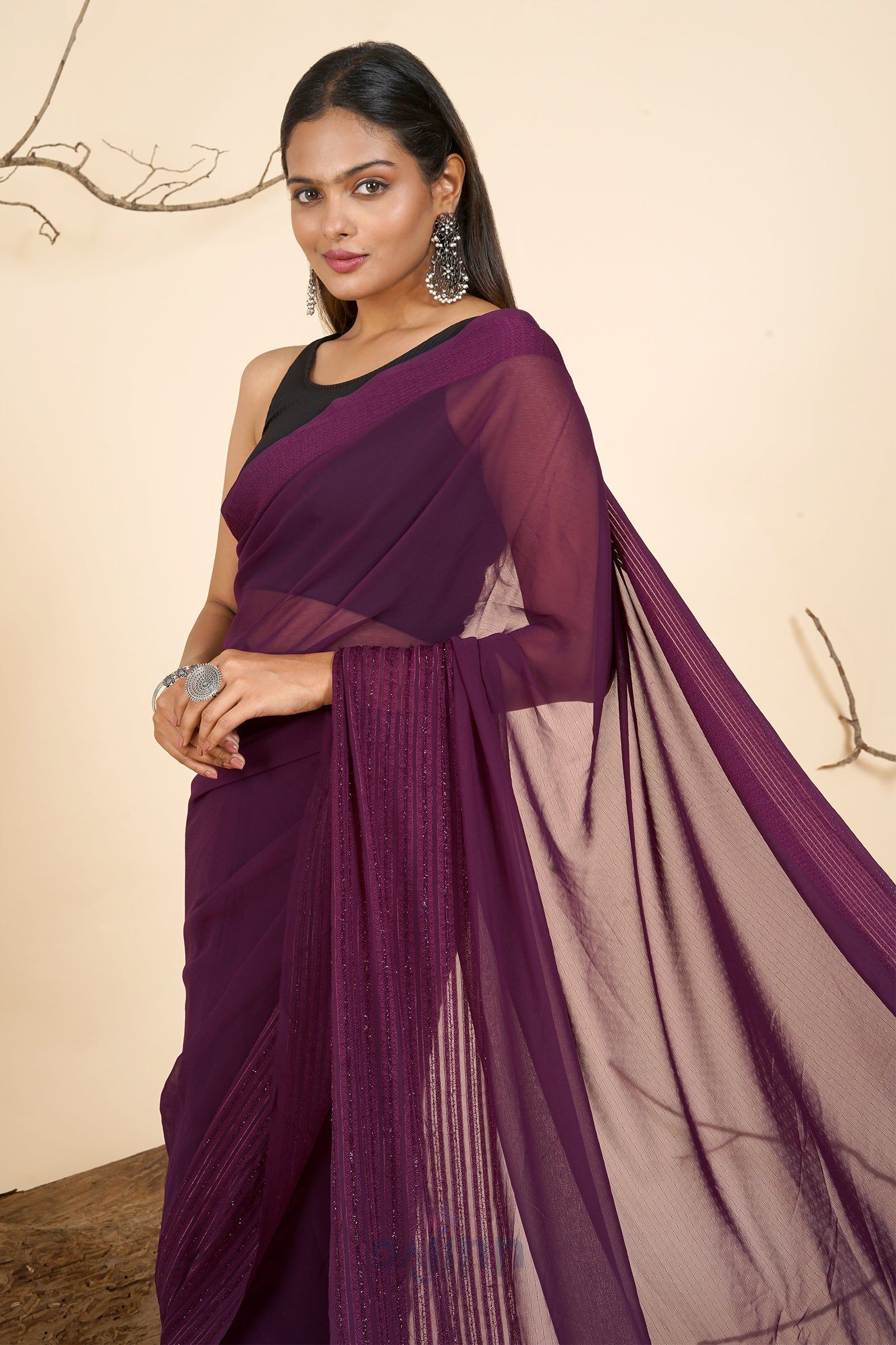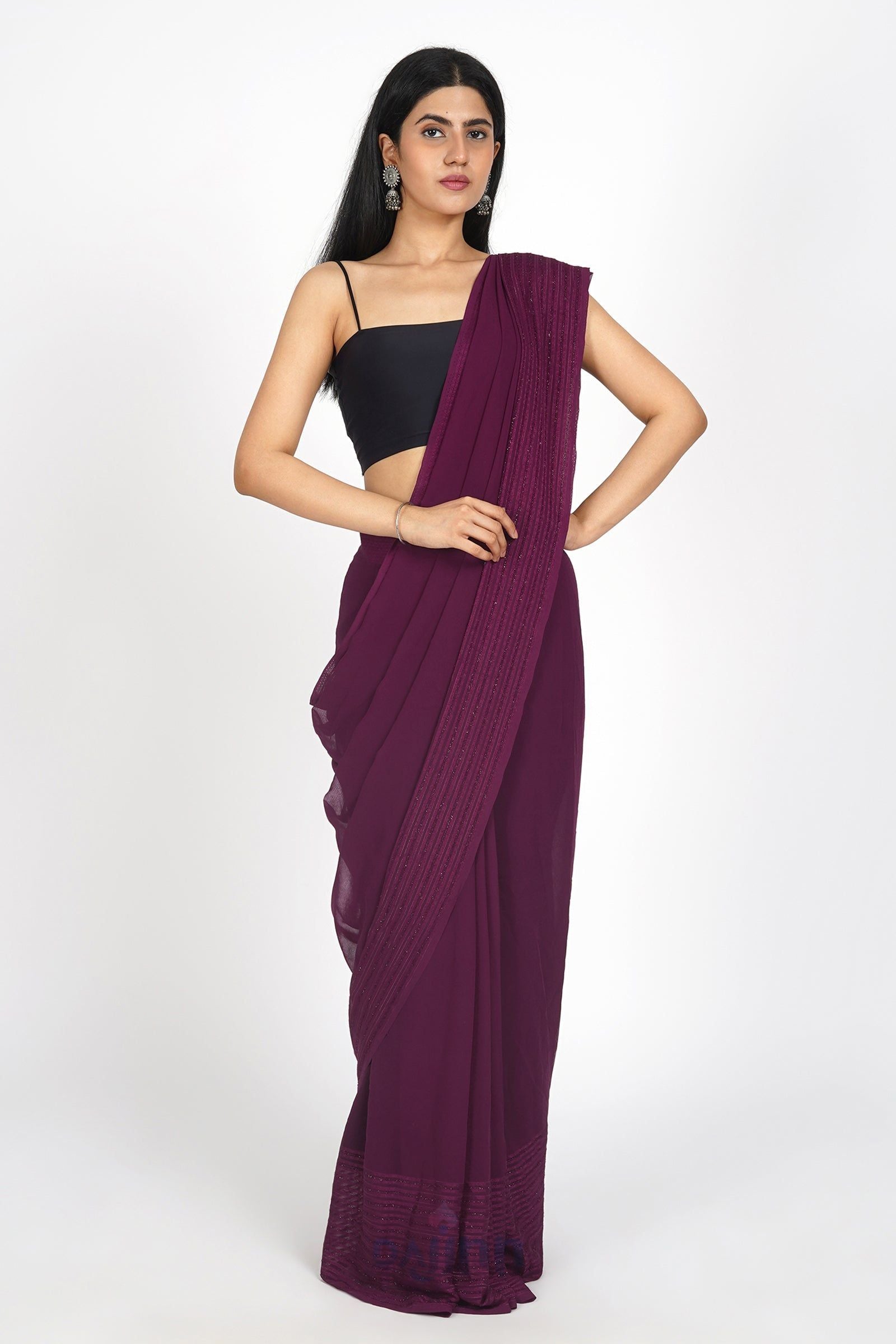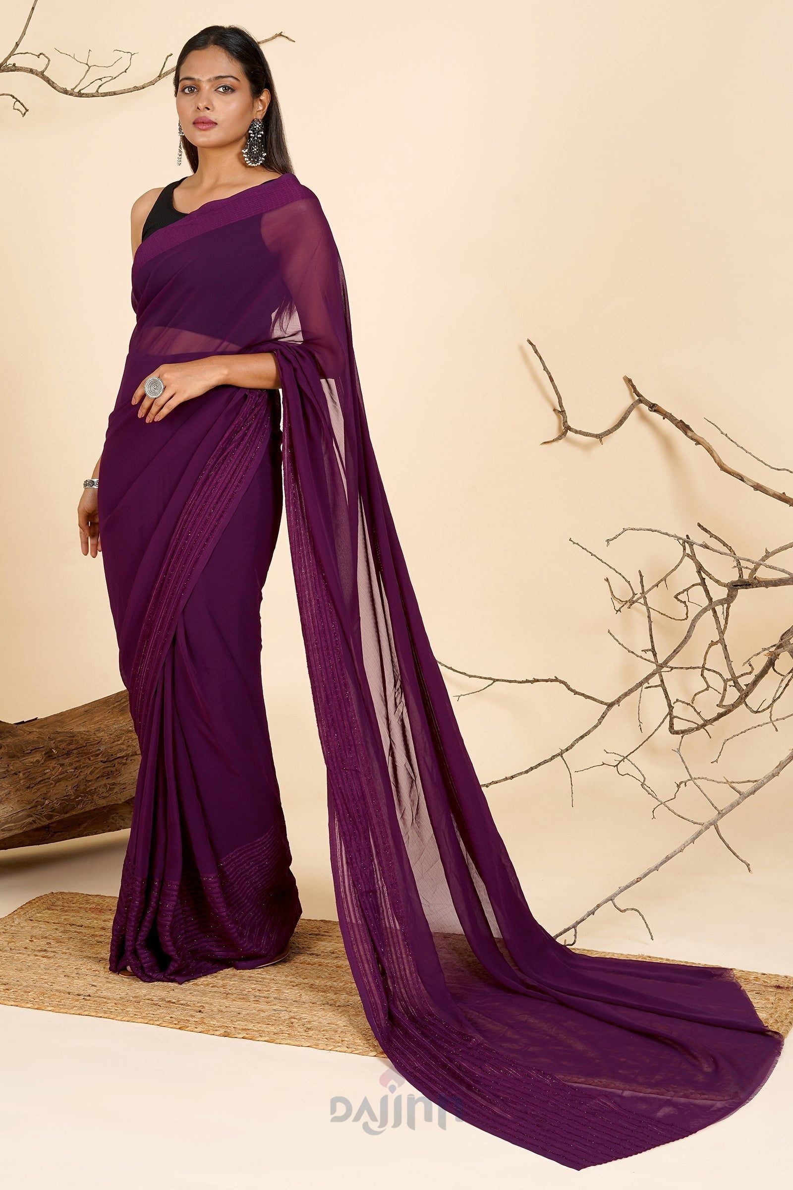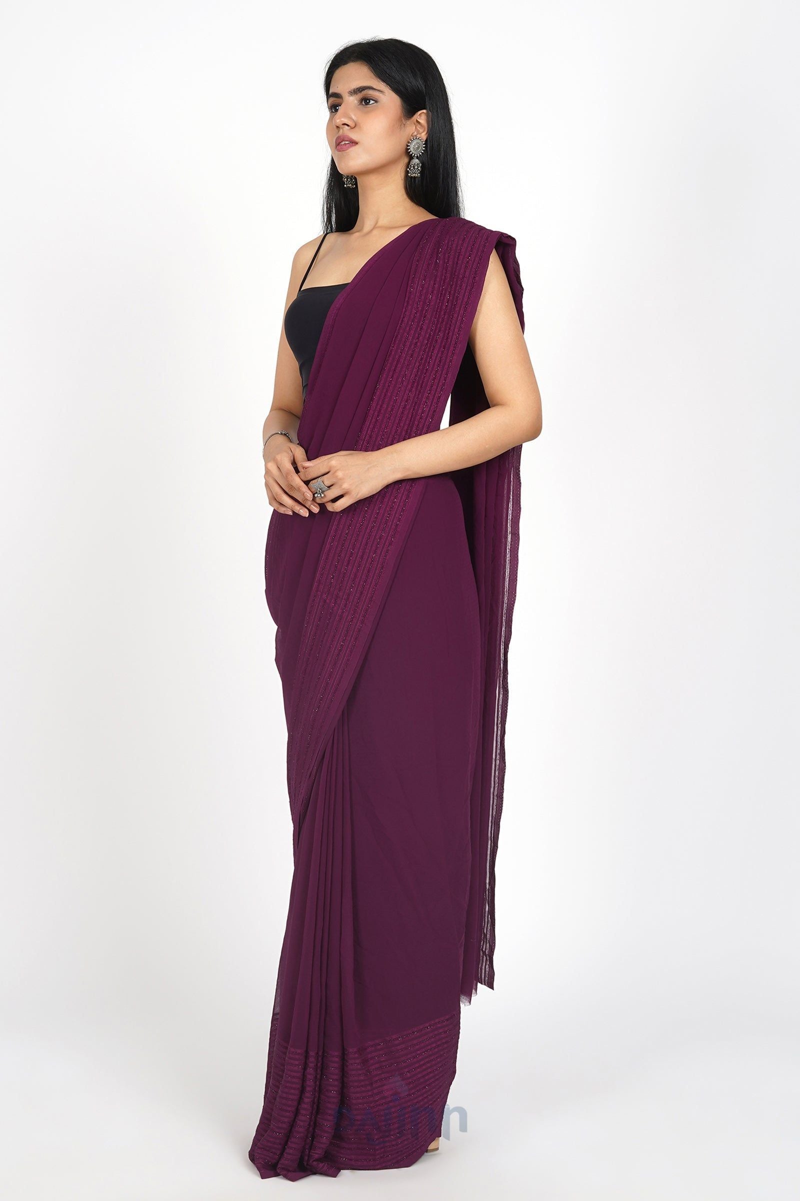 Unearth the perfect blend of tradition and modernity in the AYSR Boutique Mulberry Mist Pre-Draped Saree. Play with contrasting colors for accessories to add a vibrant twist to your ethnic ensemble.