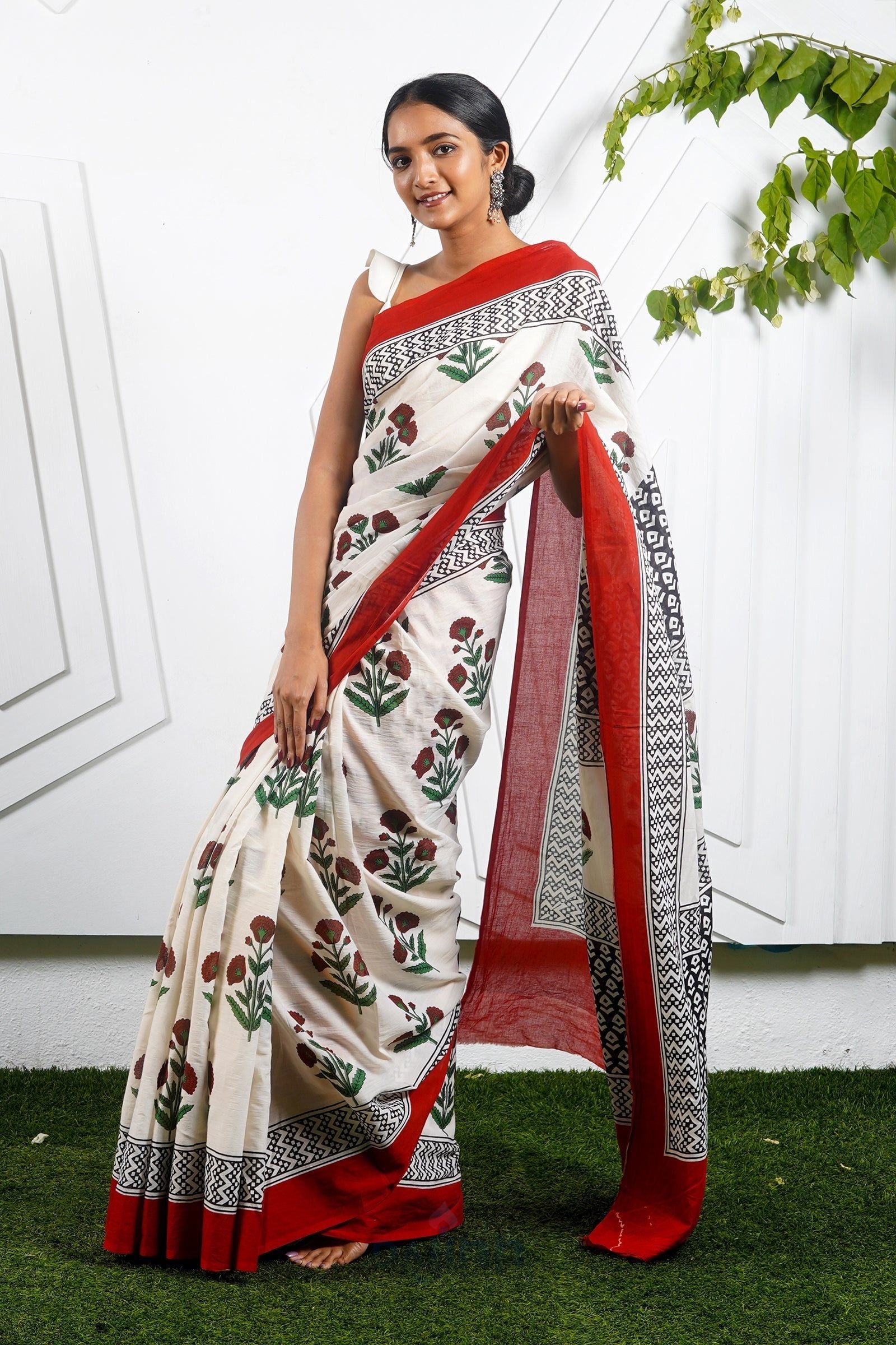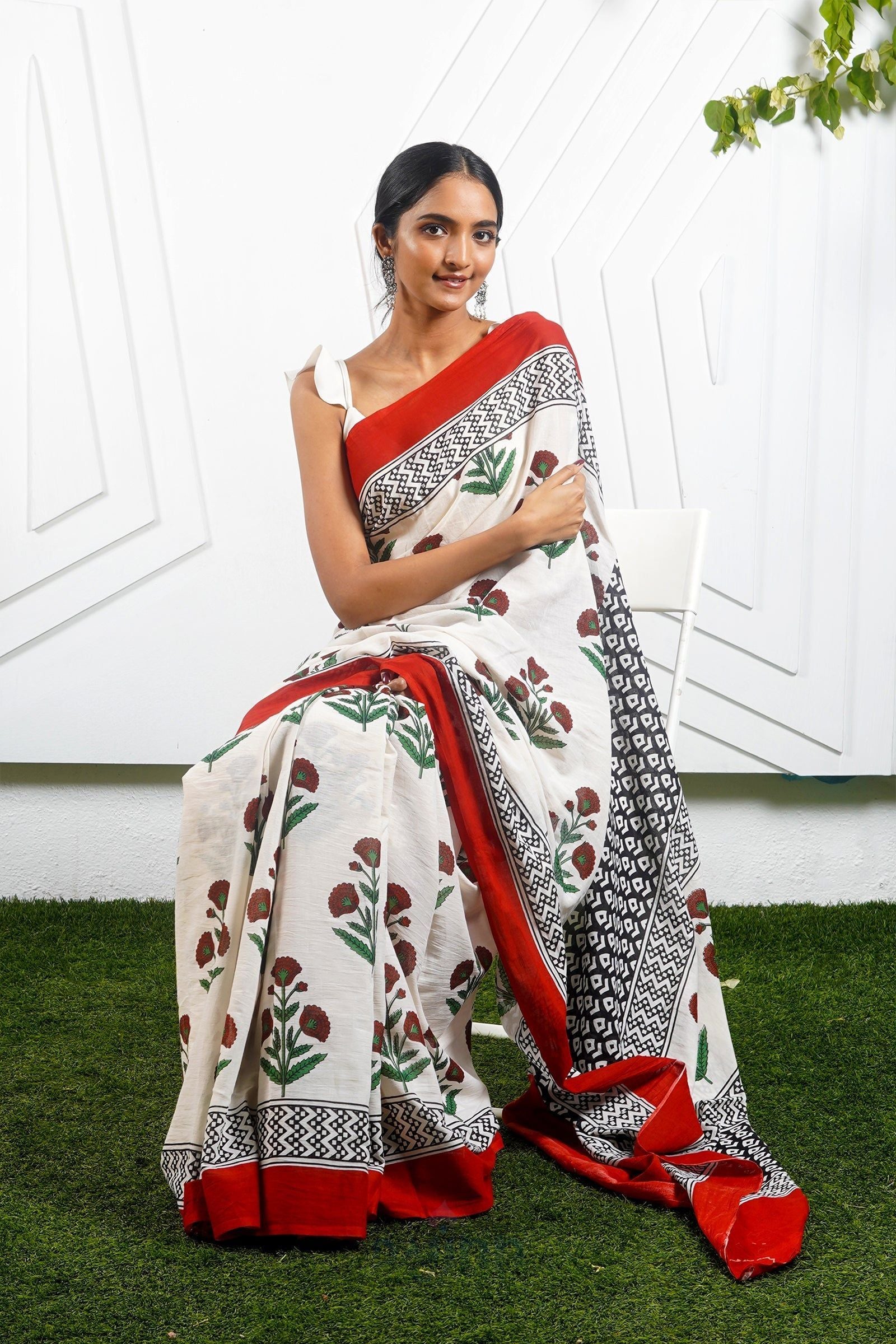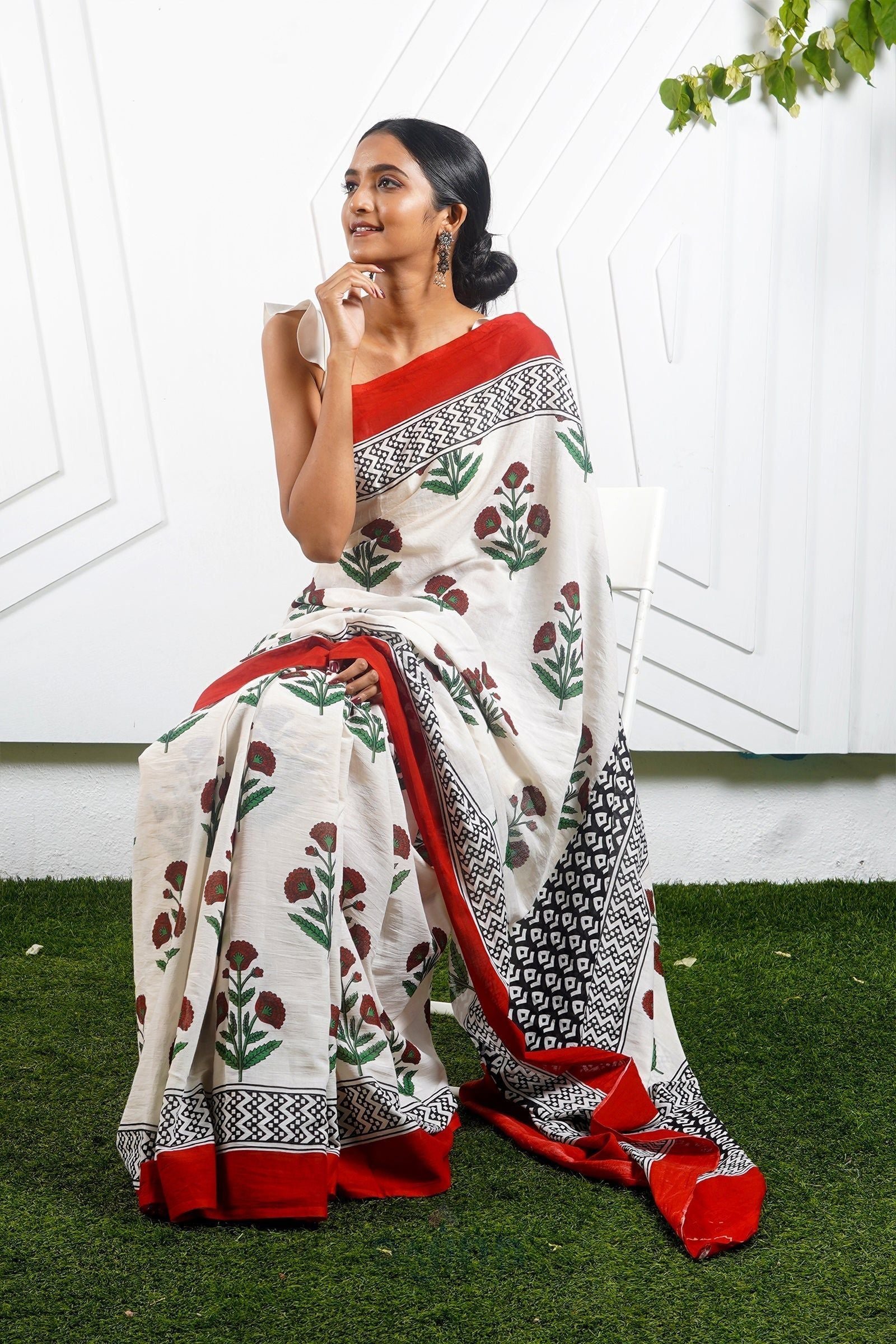 AYSR Boutique Poppy Beige and Red Hand Block Mulmul Cotton Saree