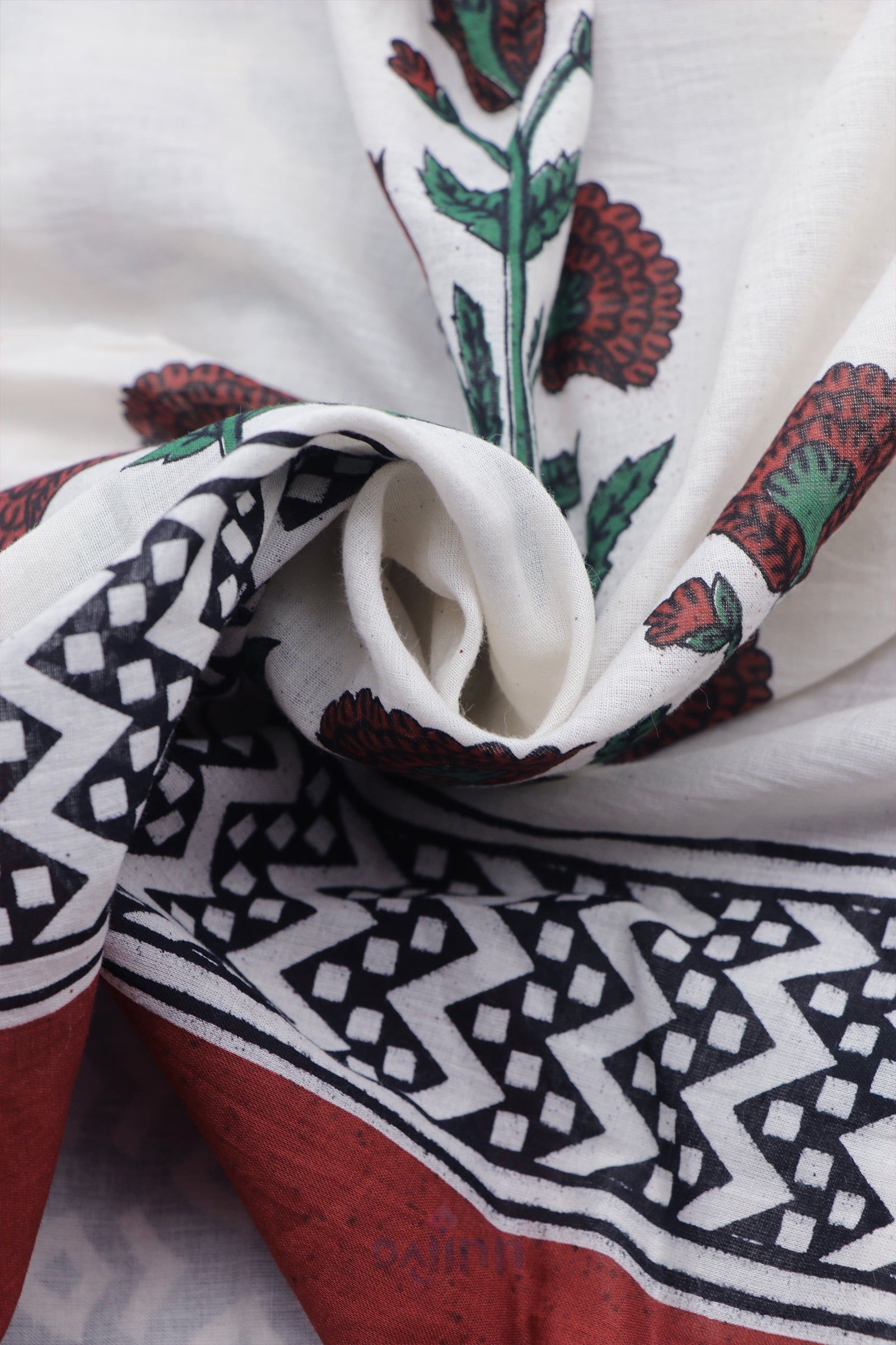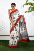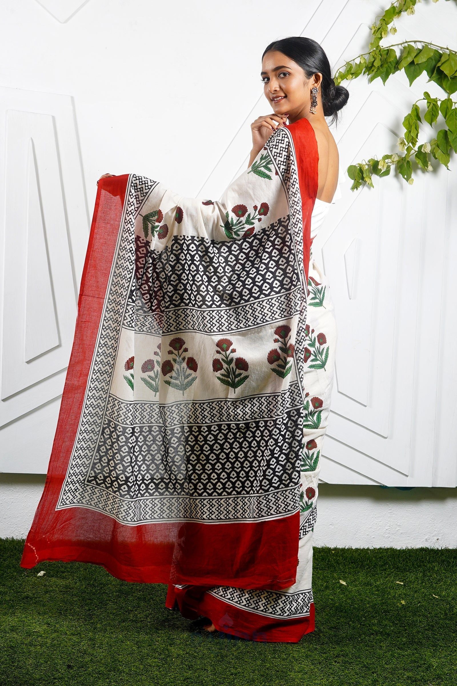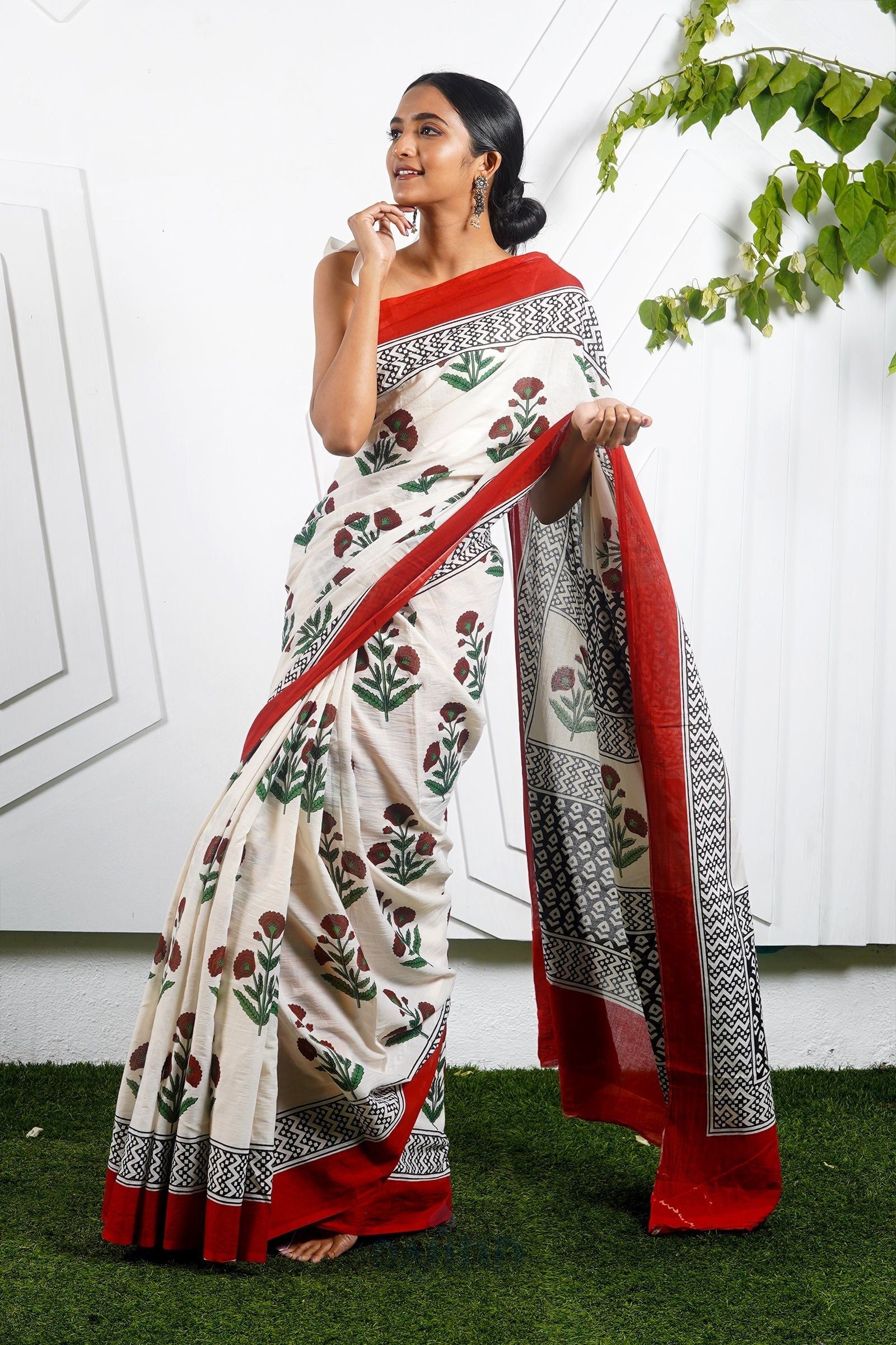 AYSR Boutique Poppy Beige and Red Hand Block Mulmul Cotton Saree