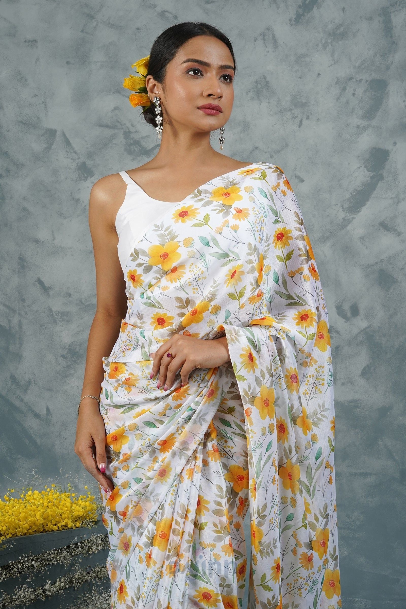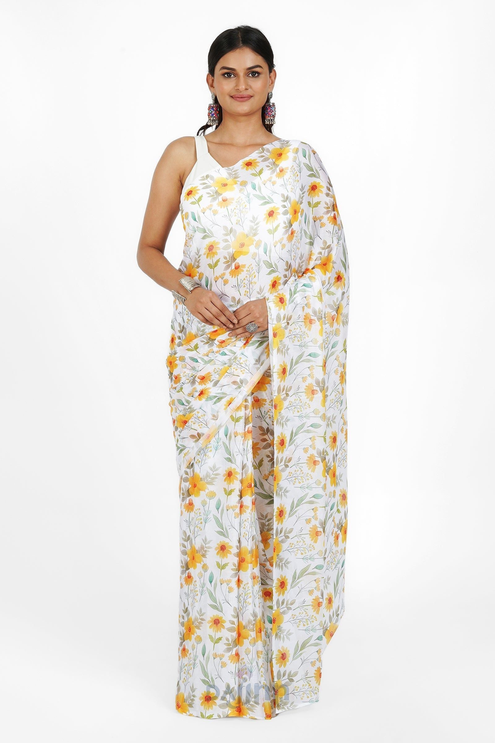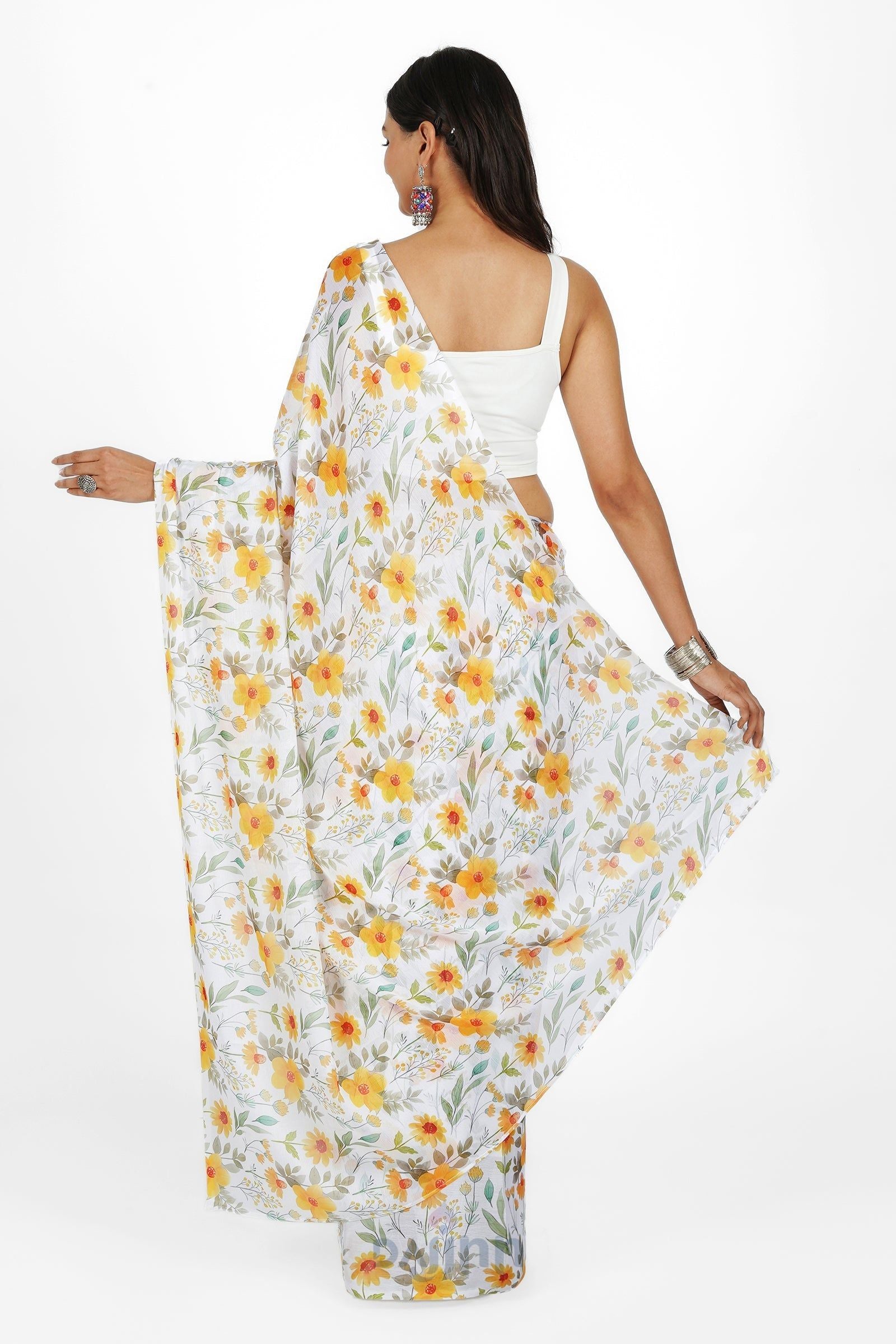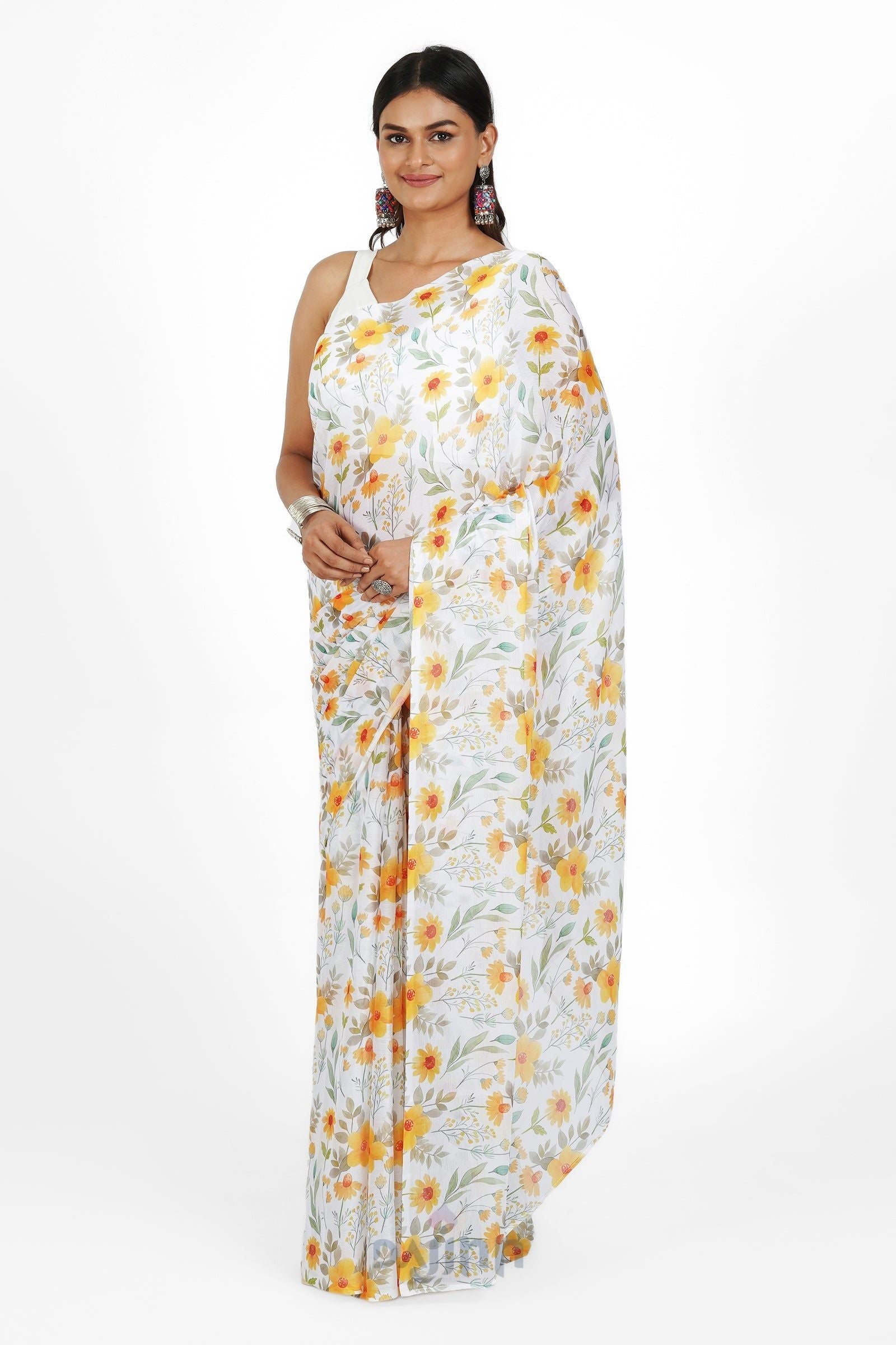 Let the sunshine in with this cheerful chiffon saree. This vibrant chiffon saree features a digital print that evokes the warmth and cheer of a sunlit day. The lightweight fabric dances with your every move, creating a look that is both radiant and captivating.