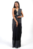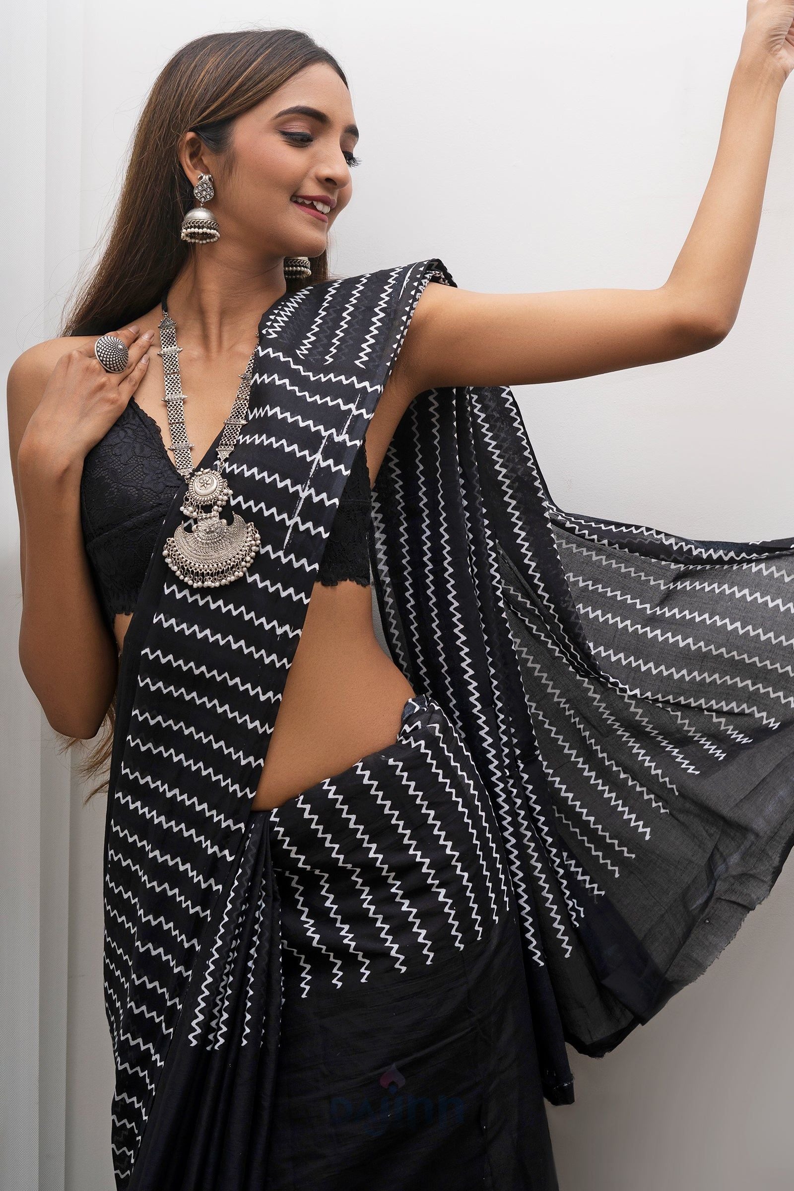 An elegant black saree that can never go wrong! Our AYSR Boutique Urmika Black Block Print Cotton Saree is hard to miss. Style this up with our silver jewelry for a bold look!