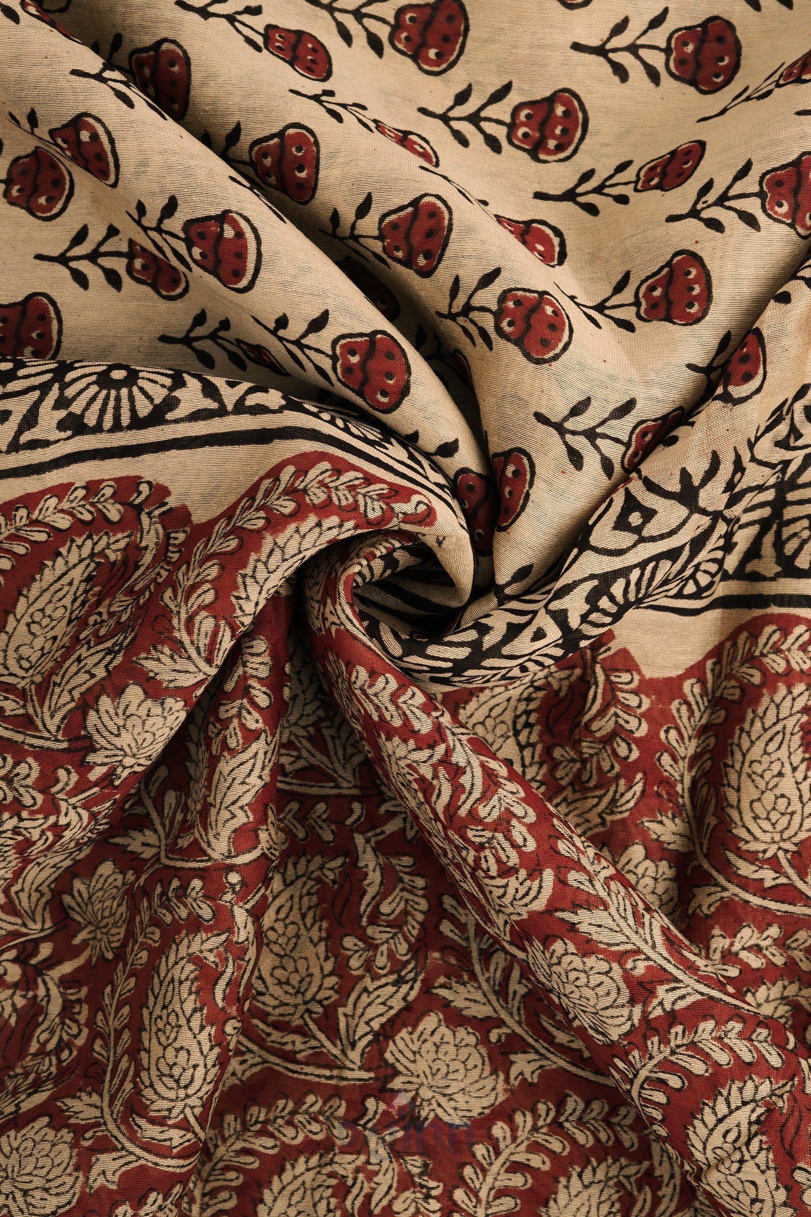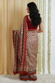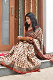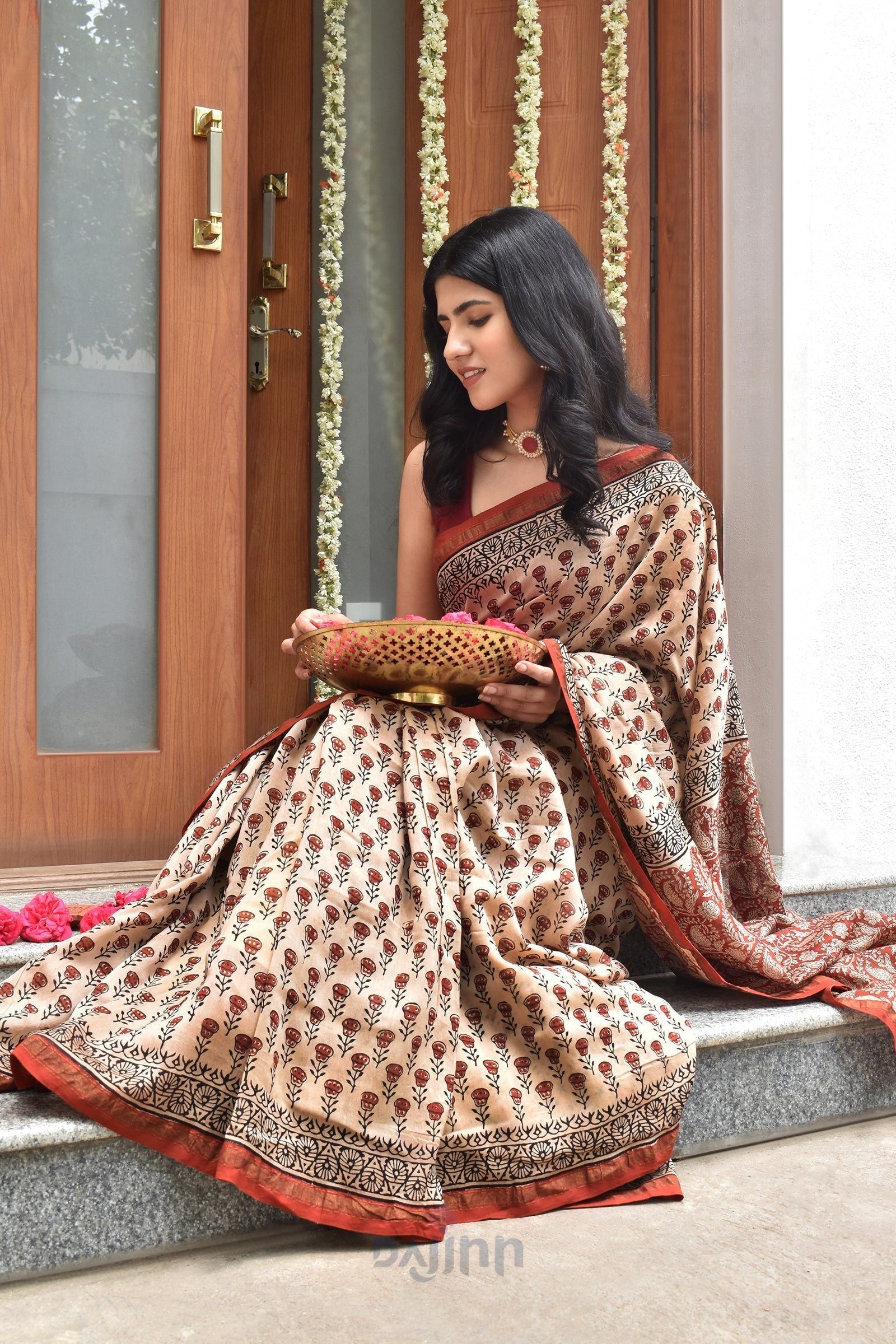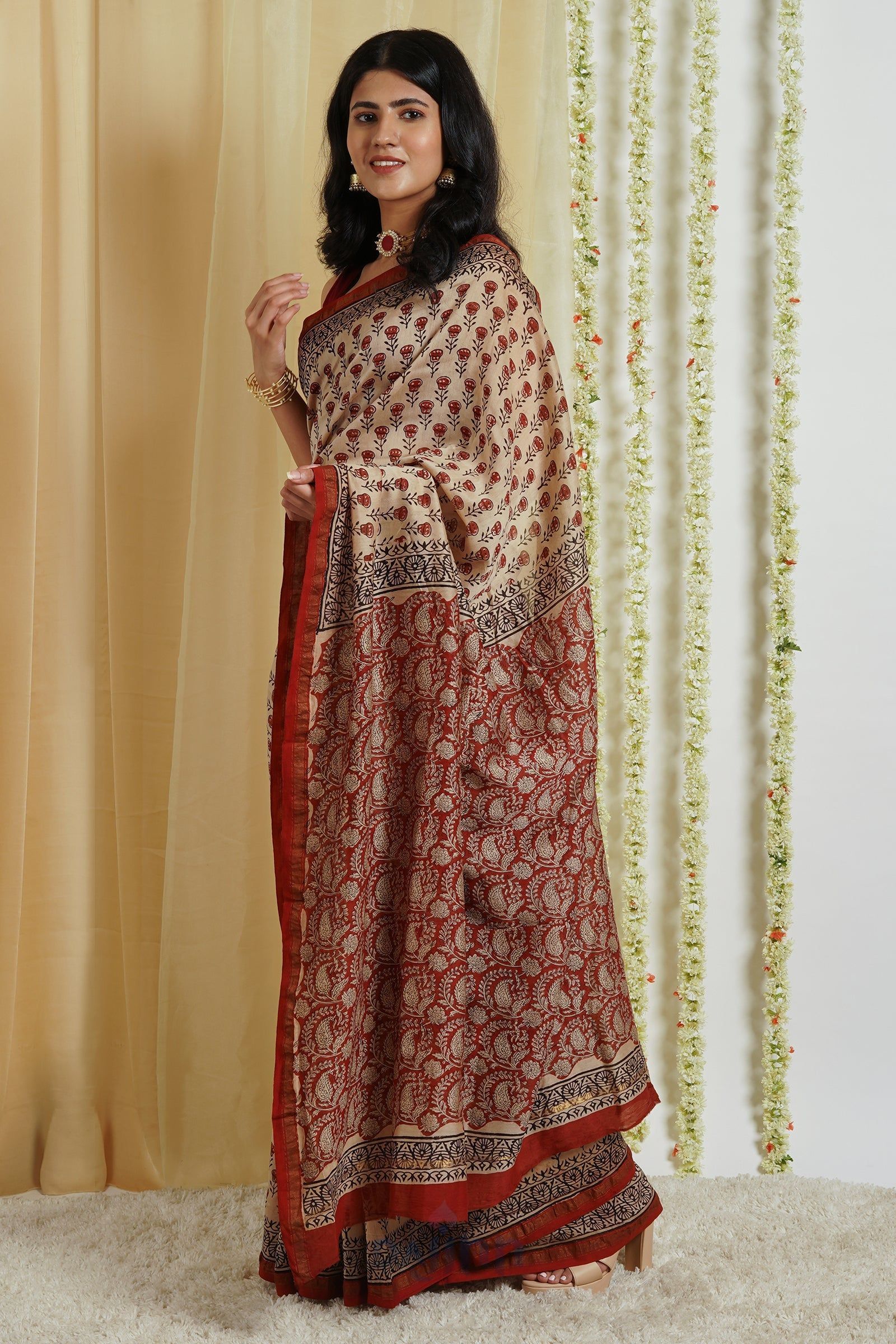AYSR Boutique Vaidehi Beige Block Print Chanderi Cotton Saree With Blouse Piece