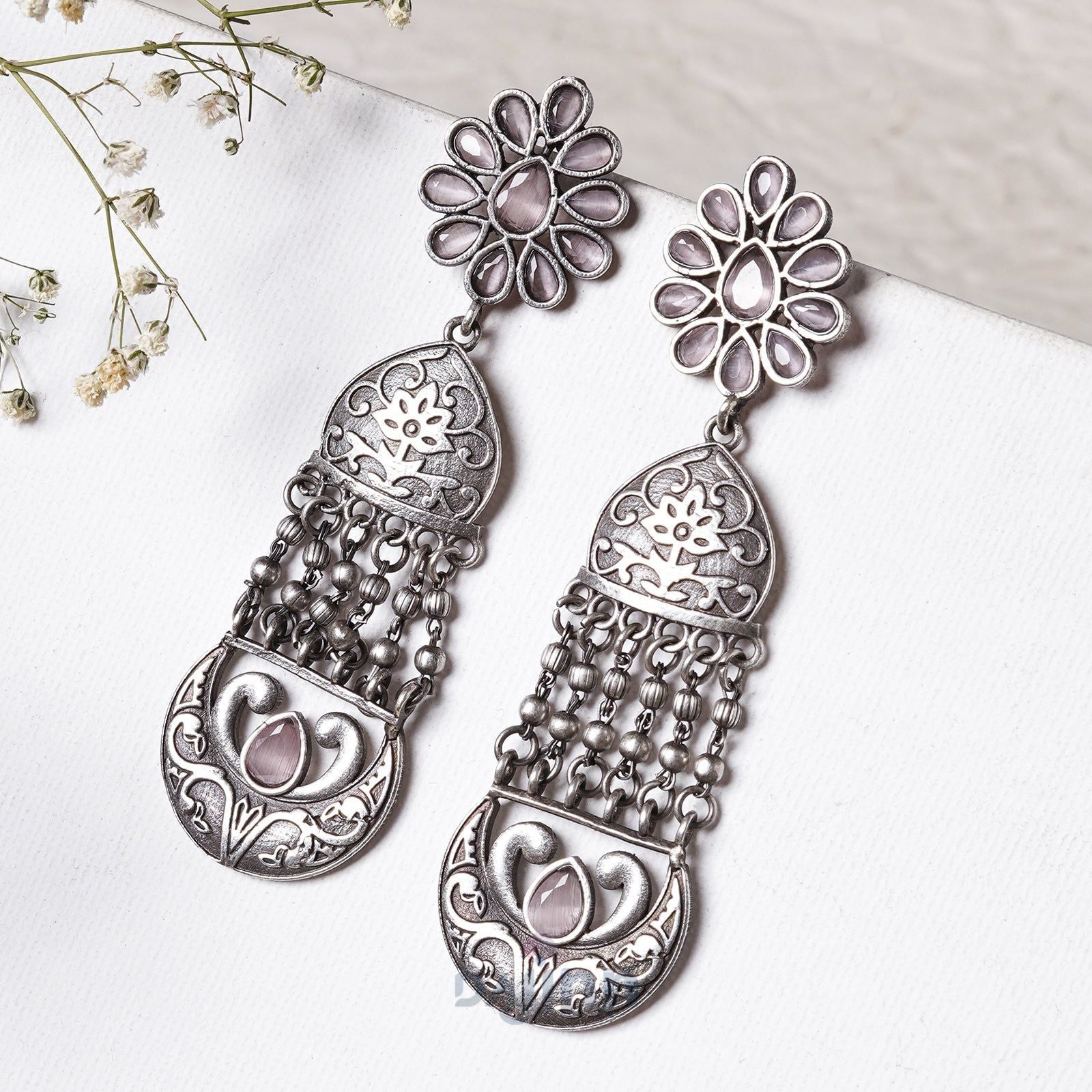 A stunning pair of earrings that feature a striking combination of Pink stones and intricate detailing. This earrings is crafted in oxidized silver, featuring delicate pastel designs. These earrings are sure to make all heads turn. Pair this up with your solid white kurtas or even your shiny tussar silk saree, these earrings are a keeper.