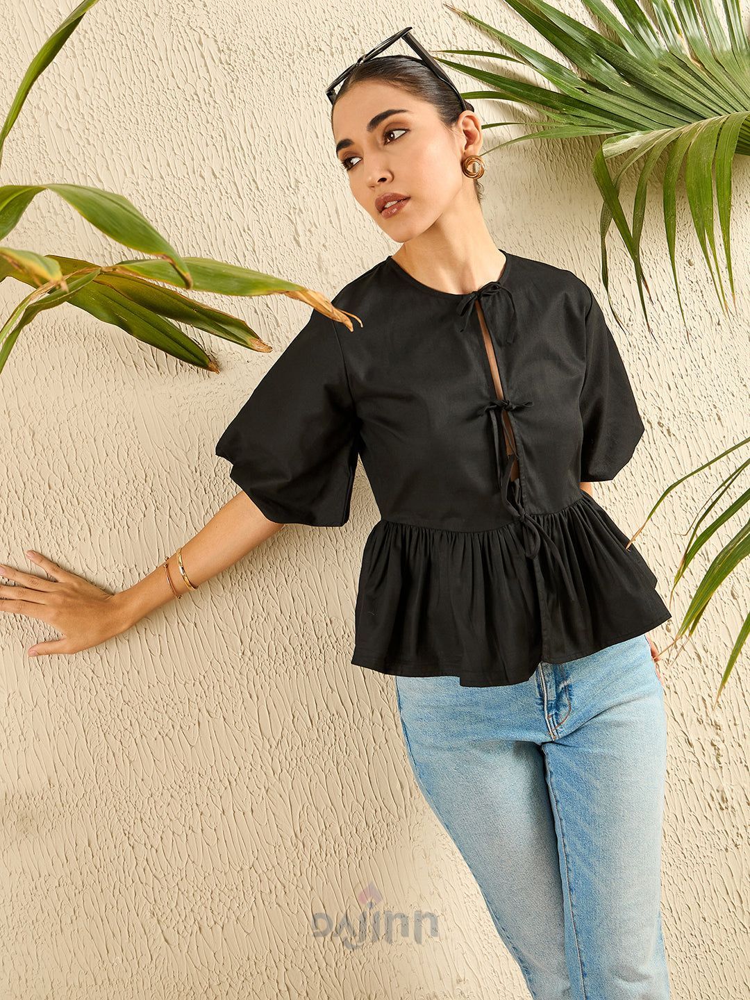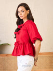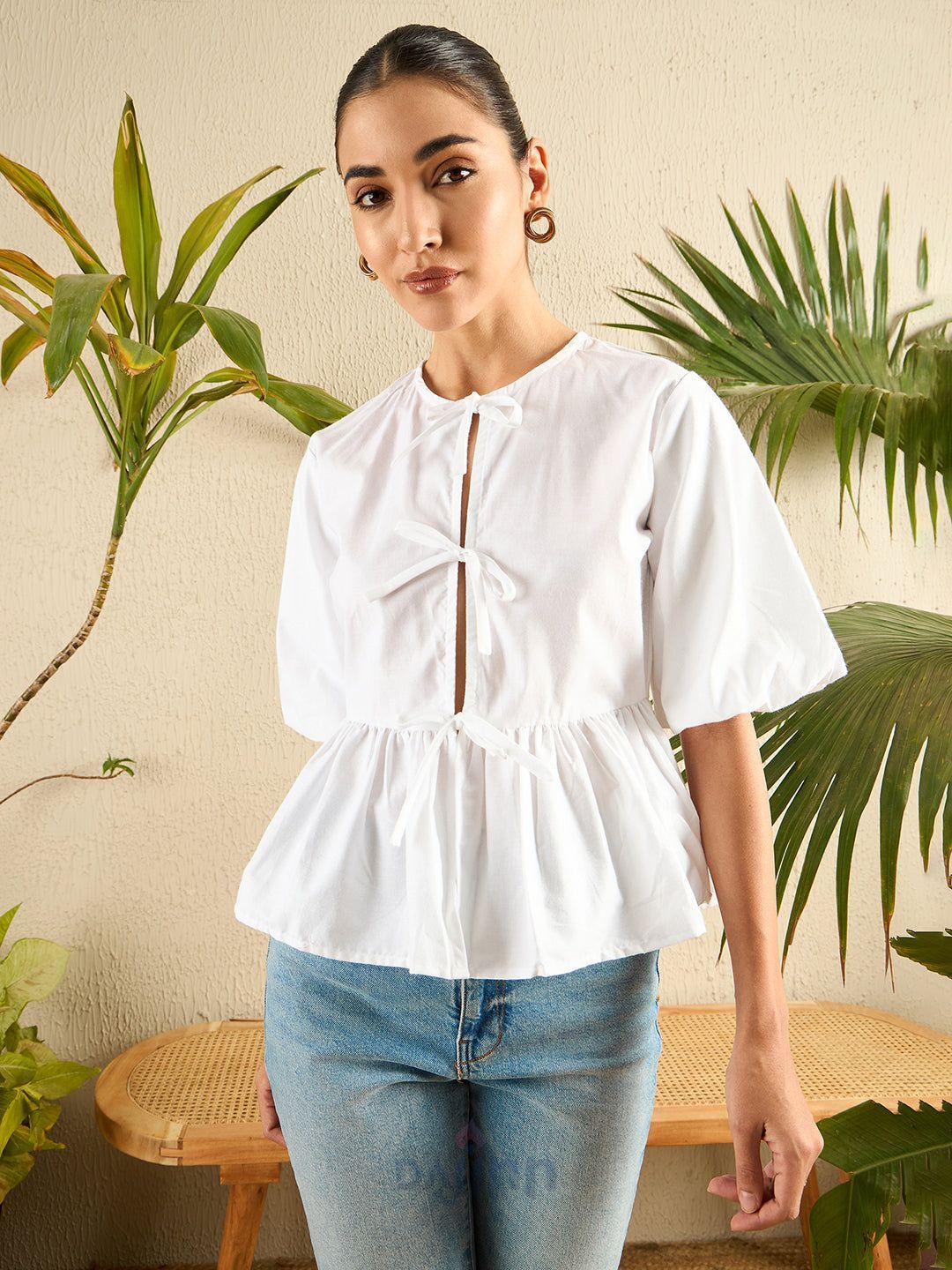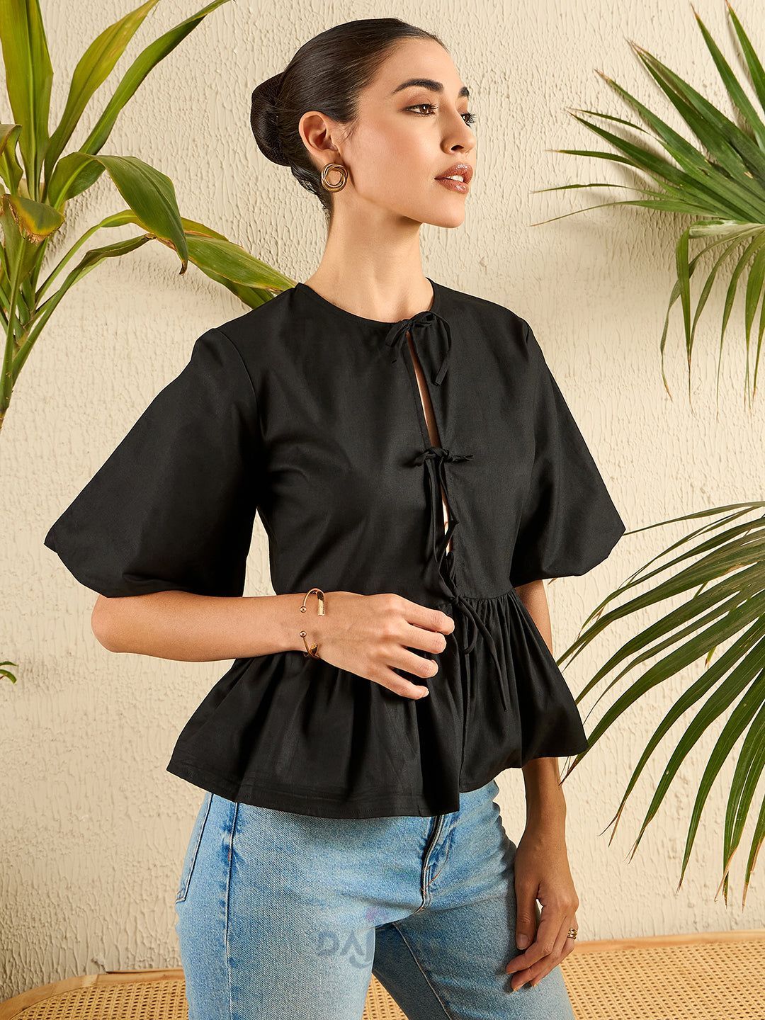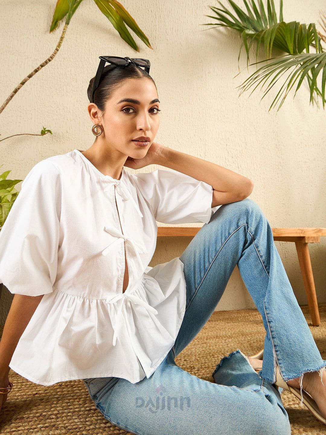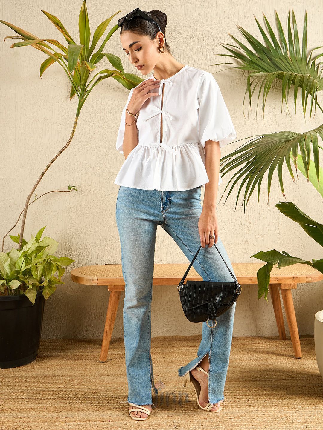 Level up your everyday looks with the Bow peplum top with puff sleeves! The top features an open peplum shirt with bows and tie-up detailing. It is the trendiest, most pinterest-y top ever and is the perfect accompaniment to your blue jeans for a look that's cute, girly and oh so instagrammable. The premium fabric is wrinkle-free and colour bleeding resistant and machine washable thereby making it long lasting and easy to maintain.