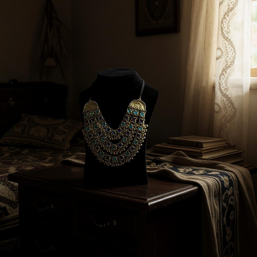 Step into timeless elegance with the Dajinn Meher Oxidized Brass Jewelry Set. Crafted with intricate detailing, this traditional Indian necklace with matching earrings adds a regal touch to your festive and ethnic look. The antique finish blends beautifully with traditional outfits like sarees, lehengas, salwar suits, and Indo-western wear. Lightweight yet eye-catching, this jewelry set is perfect for weddings, parties, festive occasions, or as a thoughtful gift for someone special.