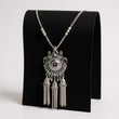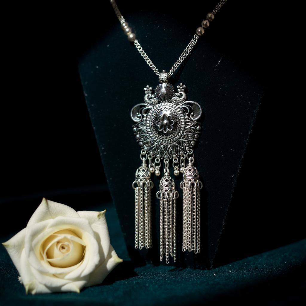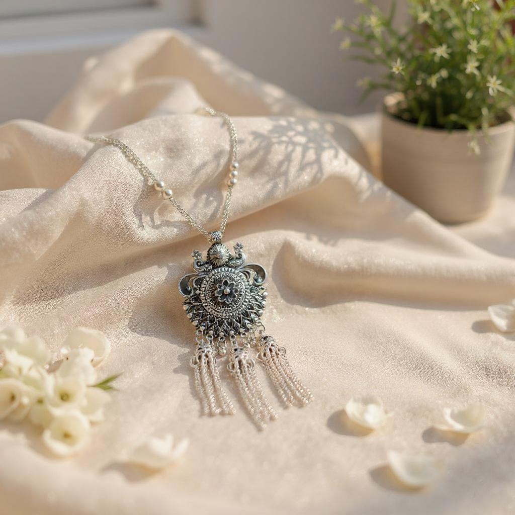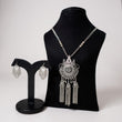 Make a statement with the Dajinn Mystic Bloom Necklace & Earrings Set, designed in antique silver finish with intricate detailing. The bold floral-inspired pendant features delicate tassel danglers, paired with matching ethnic earrings, making this set a perfect blend of tradition and modern fashion. Ideal for weddings, festive celebrations, Navratri, parties, or daily ethnic styling, this jewelry set is a timeless addition to your collection.