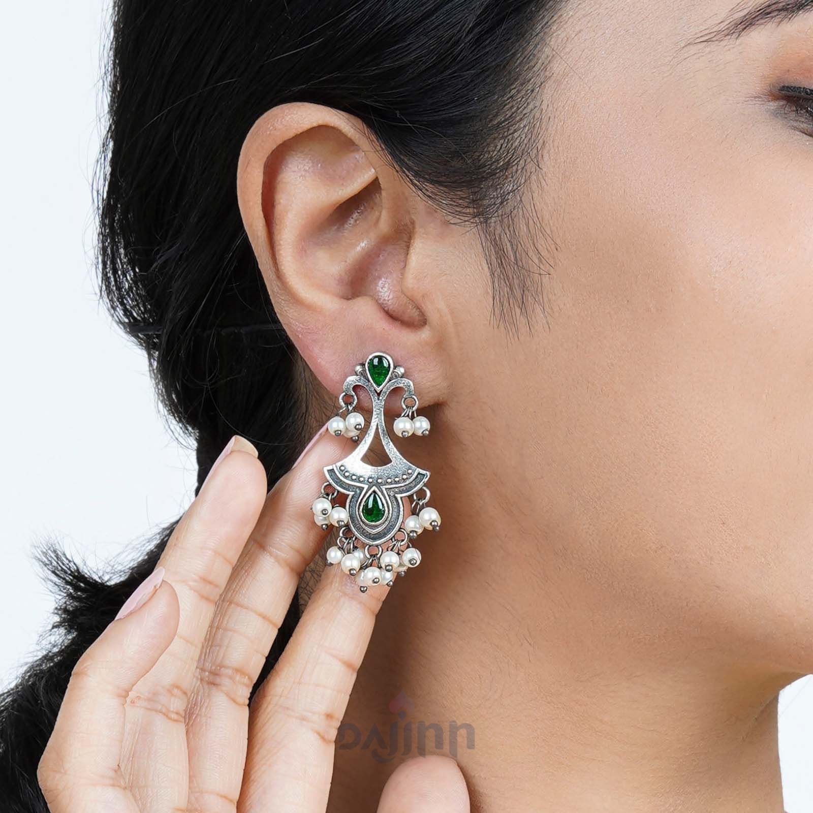 Hard to miss pair of earrings that will give you more reasons to dress up this season. Our Nilay Green Stone Oxidised Earrings features intricate floral motifs with tinkling pearl by the edge that adds its perky character to the look.