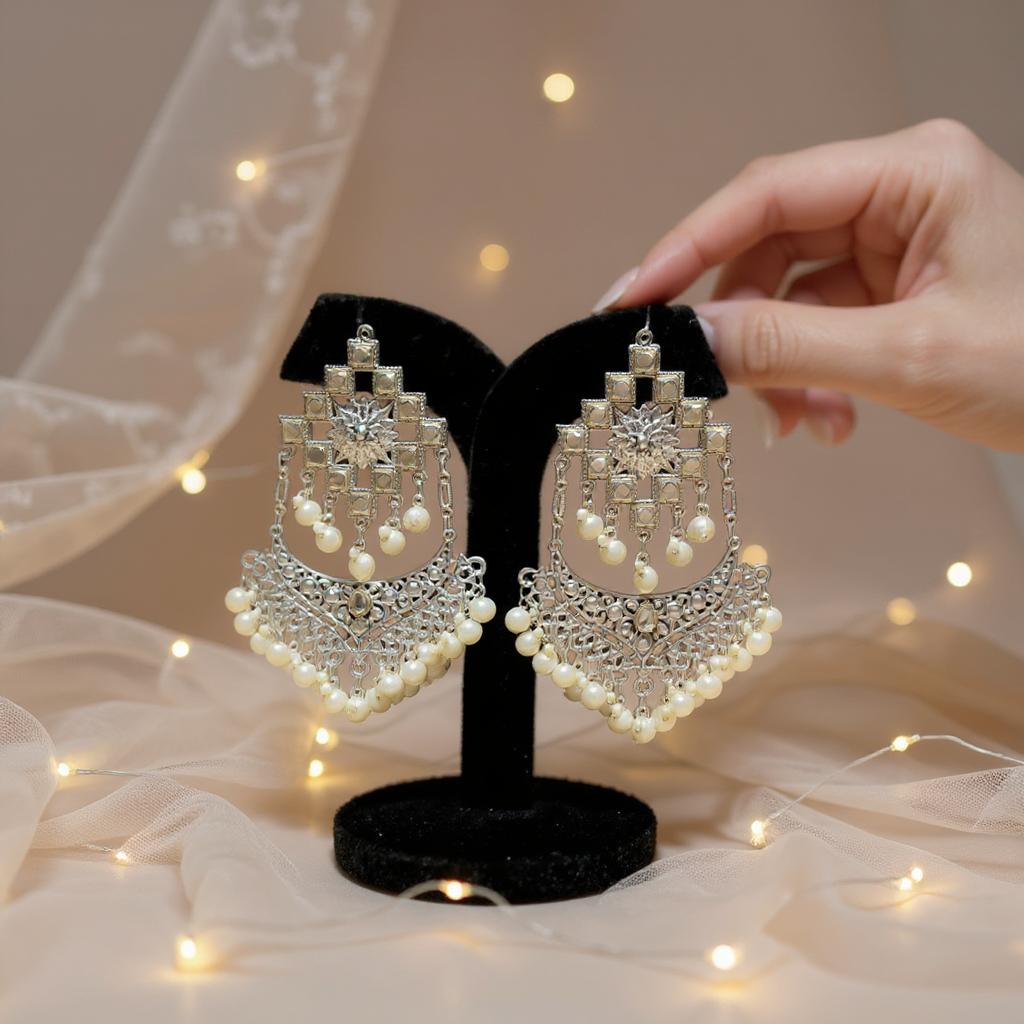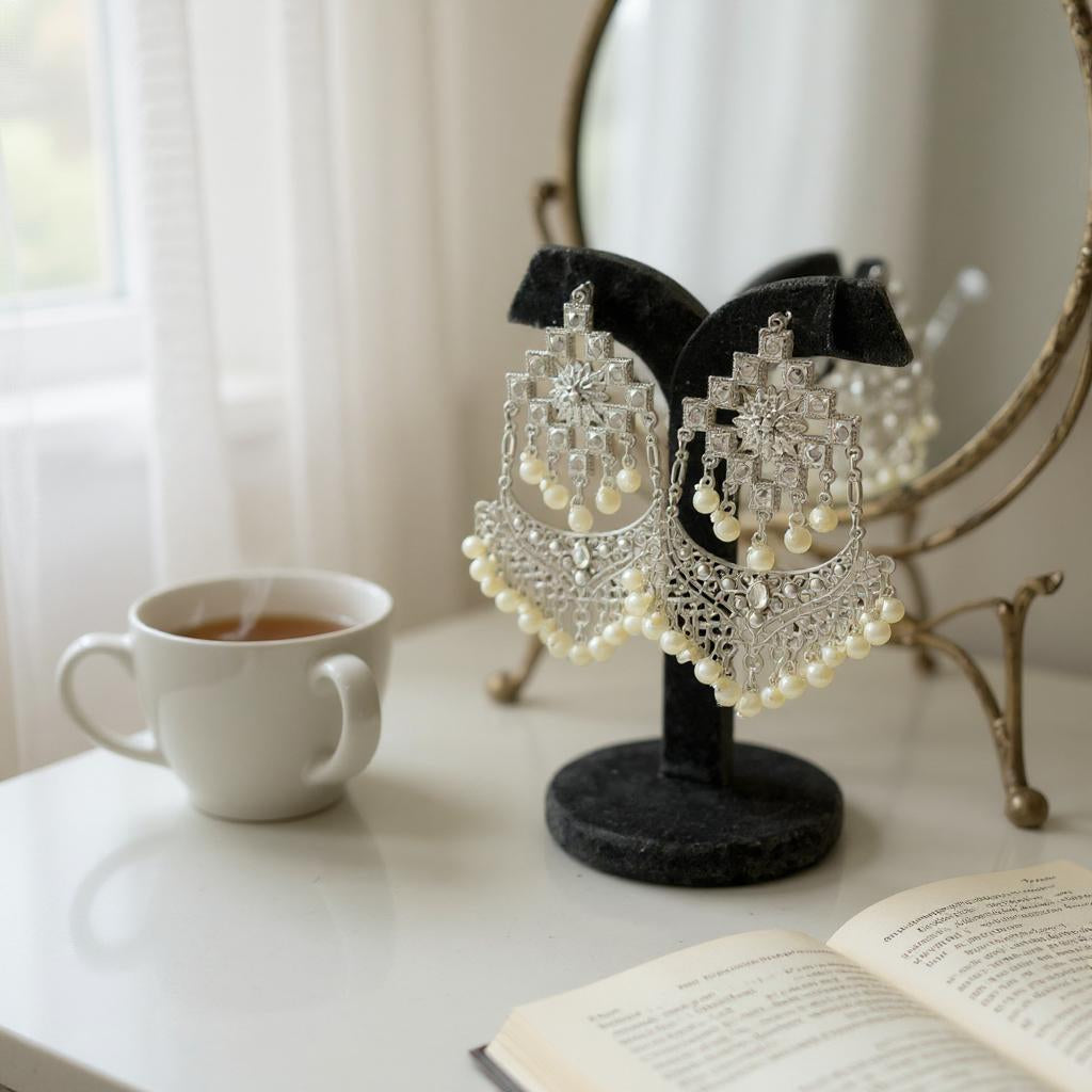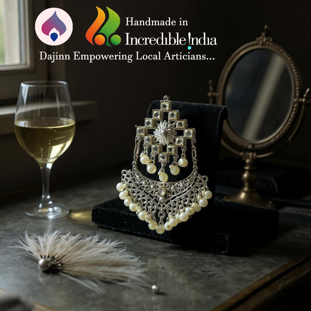 Enhance your ethnic charm with Dajinn’s Noor-E-Zaiba Collection, featuring exquisitely crafted oxidised silver-plated earrings adorned with delicate pearl drops. Designed for women who love traditional yet statement jewelry, these earrings pair perfectly with sarees, lehengas, anarkalis, and Indo-fusion outfits. Lightweight yet bold, they are ideal for weddings, festive occasions, parties, or as a thoughtful gift for loved ones. Handcrafted with intricate detailing, every pair reflects timeless Indian artistry blended with modern elegance – making them a must-have addition to your jewelry collection.