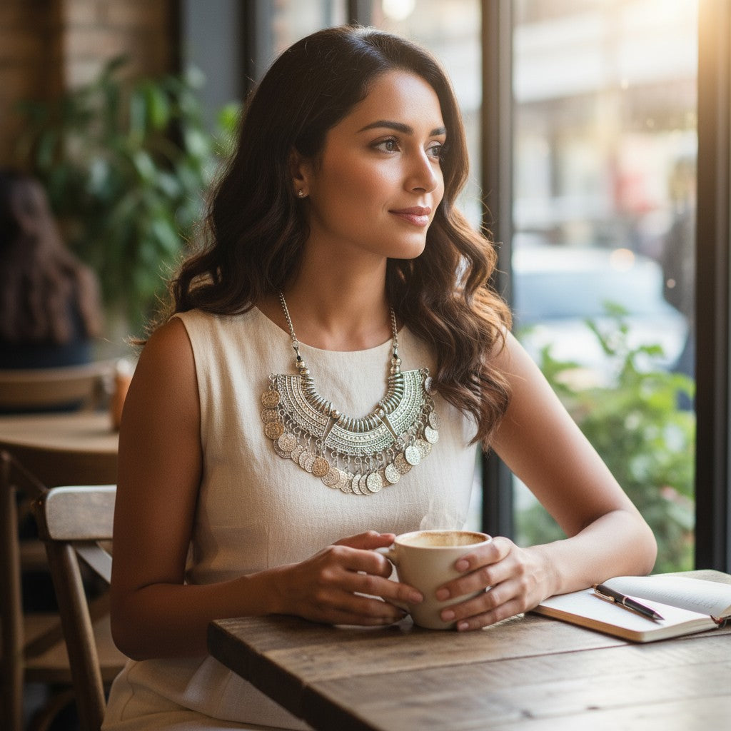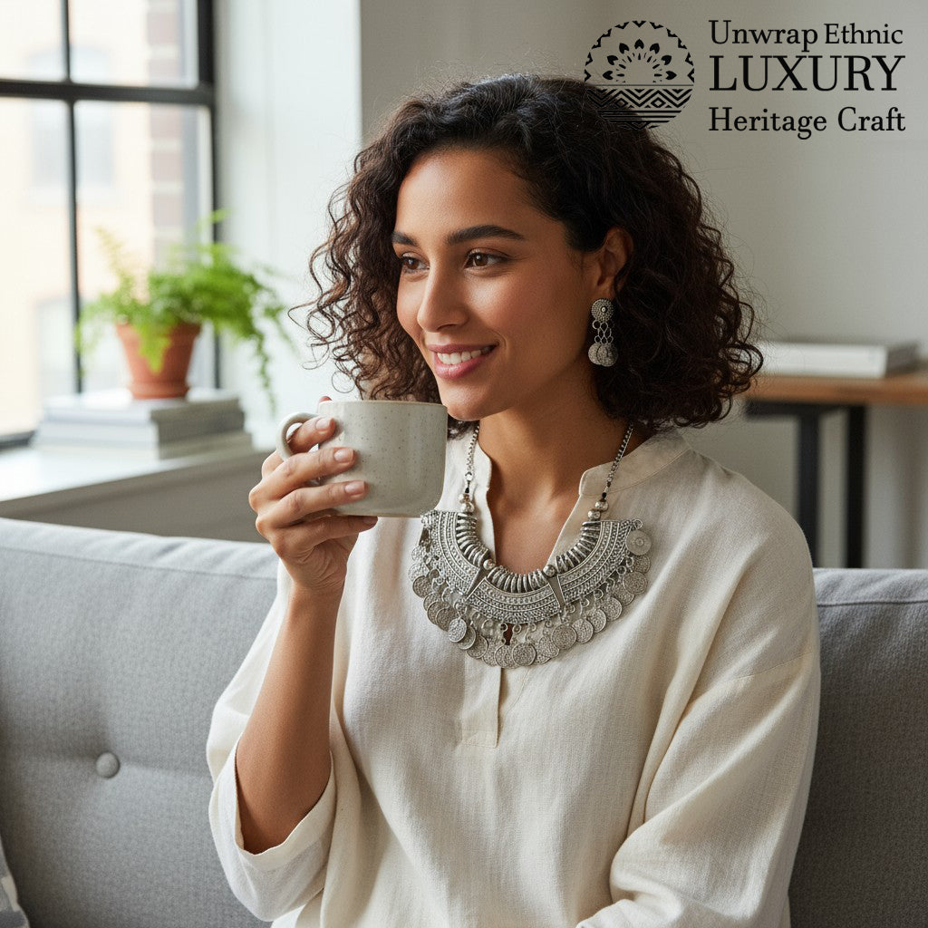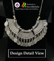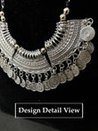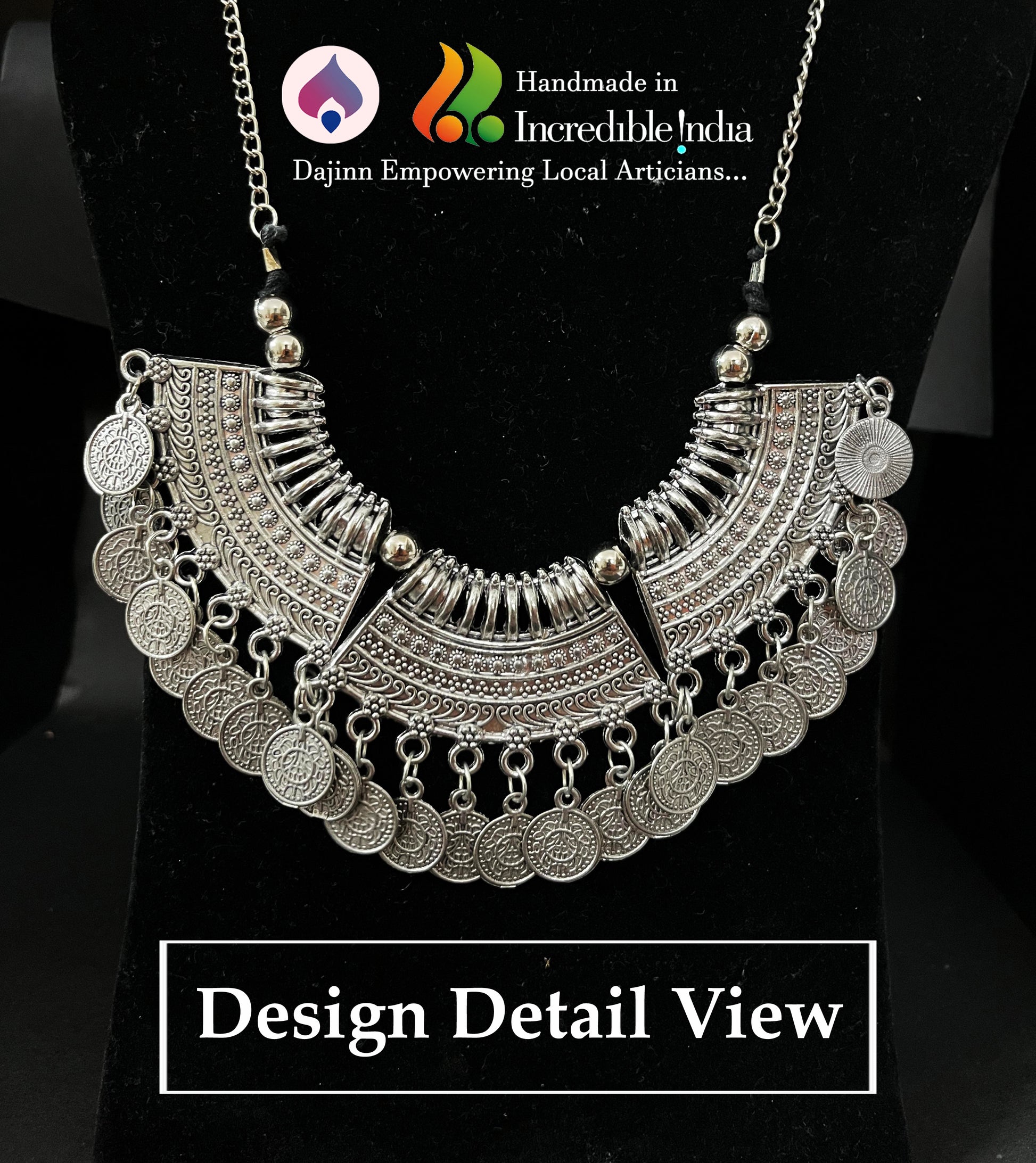 Discover bold elegance with the Dajinn Oxidized Silver Coin Necklace, skillfully handmade by talented artisans. This stunning statement piece features intricate oxidized silver plating, richly detailed textures, and layers of traditional coin-style charms. Its grand design and gorgeous embellishments evoke the splendor of Indian heritage, making it the perfect accessory for cultural festivities, special occasions, or elevating any look. Each necklace is beautifully packaged and supports the craft and livelihood of local Indian artisans.