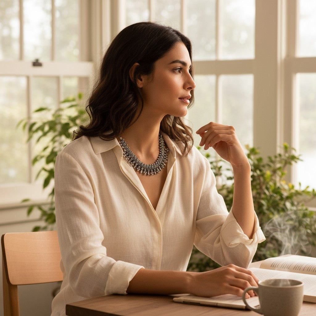 Discover classic charm with the Dajinn Oxidized Silver Dangling Bead Choker Necklace, beautifully handcrafted by expert artisans. Featuring a band of intricate ethnic motifs and delicate bead danglers, this minimal yet statement-making piece is perfect for layering or solo wear. Its premium oxidized silver finish and fine detailing ensure both tradition and versatility, making it ideal for daily style or special occasions. Each necklace is elegantly presented in a Dajinn Signature Gift Box.