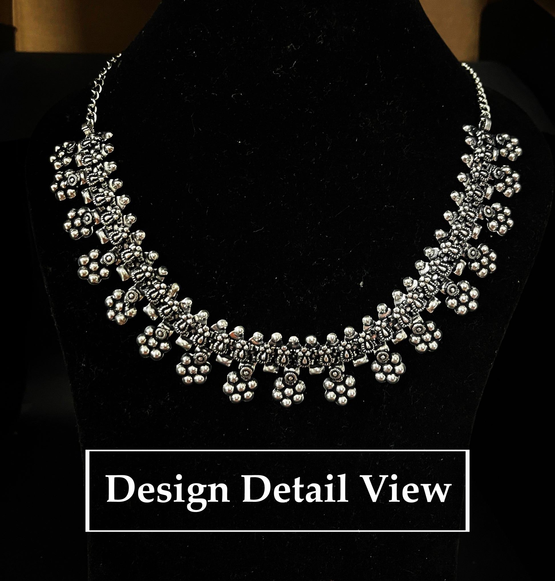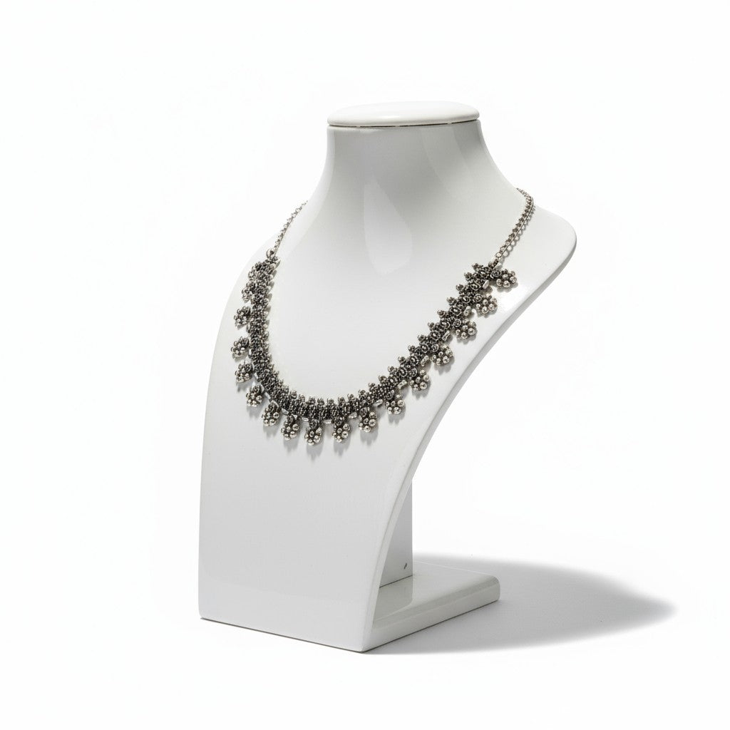 Dajinn Oxidized Silver Floral Cluster Choker Necklace – Handcrafted Minimal Ethnic Everyday Jewelry
