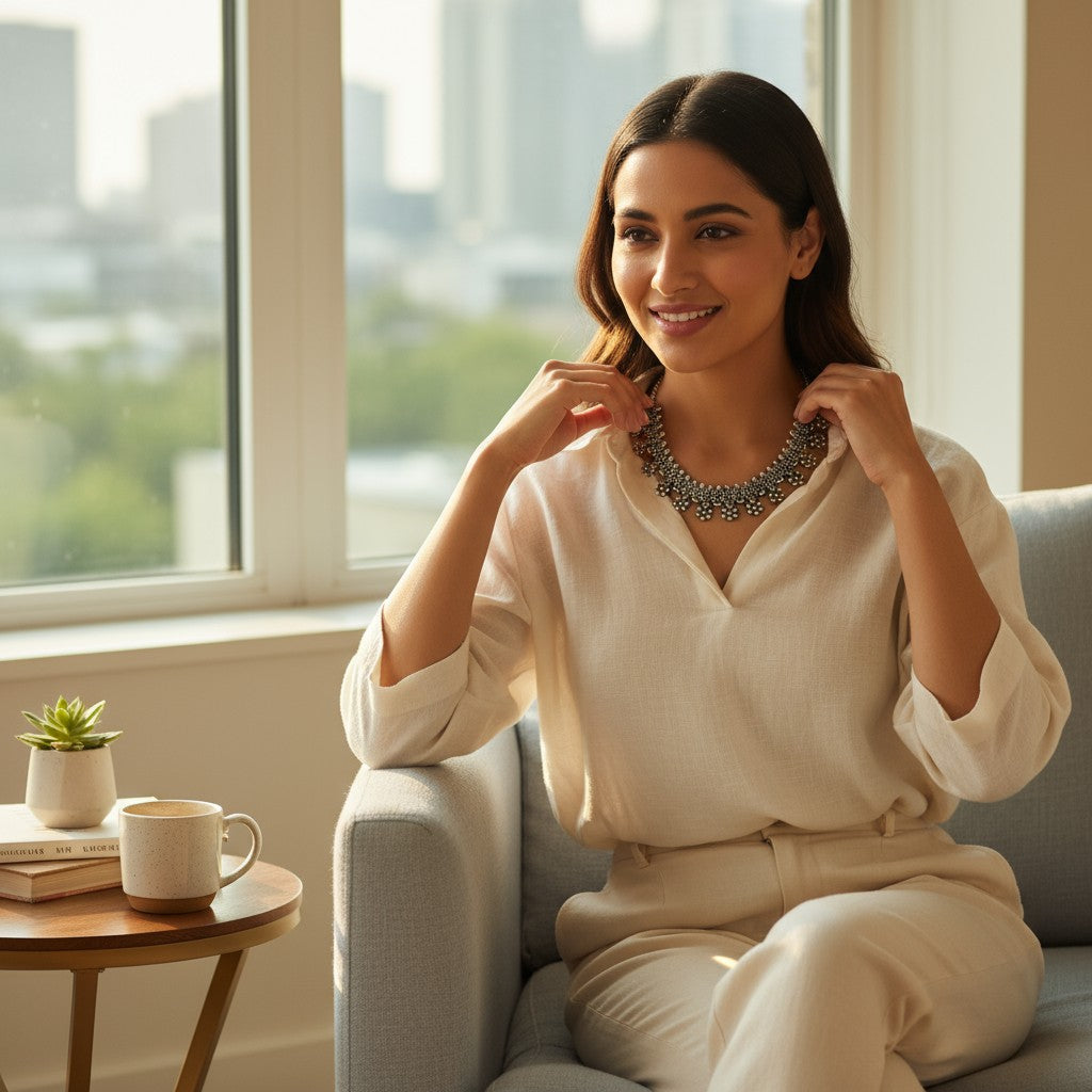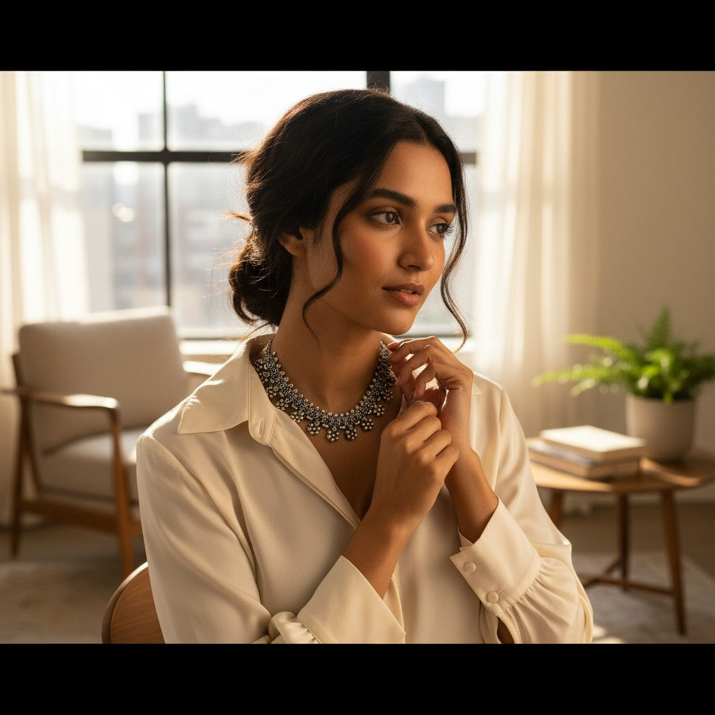 Add a touch of handcrafted heritage to your style with the Dajinn Oxidized Silver Floral Cluster Choker Necklace. Painstakingly handcrafted by skilled artisans, this necklace features intricate beaded strands accented by dainty, abstract floral clusters. The lightweight and minimal design is perfect for daily wear and layering, offering a blend of classic ethnic charm and contemporary elegance. Each piece is delivered in a delightful Dajinn Signature Gift Box.
