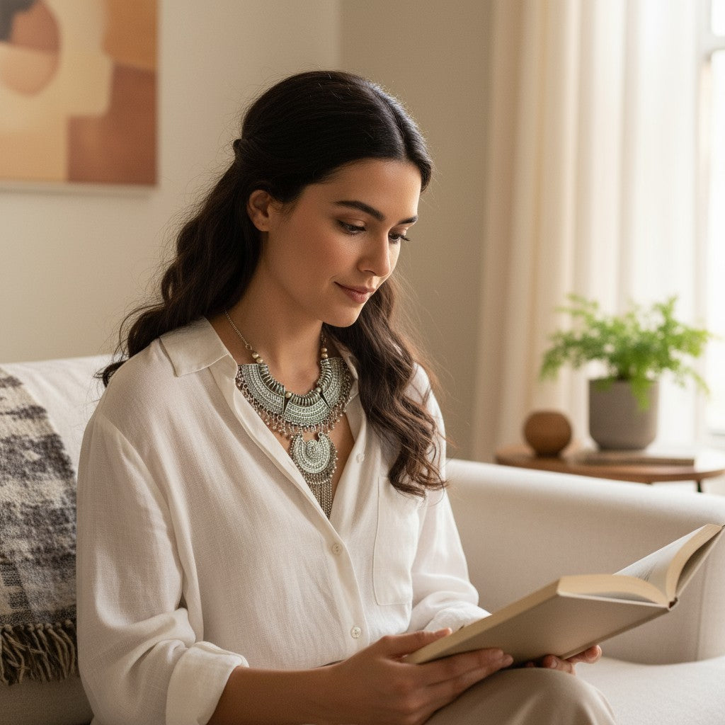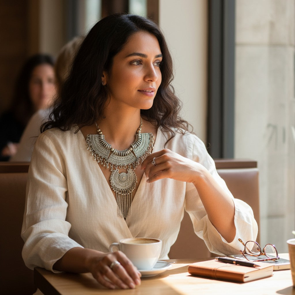 Step into heritage elegance with the Dajinn Oxidized Silver Necklace, exquisitely handcrafted by Indian artisans. This bold statement piece features layered crescent panels with rich ethnic textures, metallic bead accents, and a dramatic central pendant adorned with ornate chain fringe. Expertly finished for regal shine and captivating movement, it celebrates traditional artistry and modern statement style—making it ideal for festive, formal, or everyday ethnic wear. Each necklace arrives in a luxurious Dajinn Signature Gift Box.