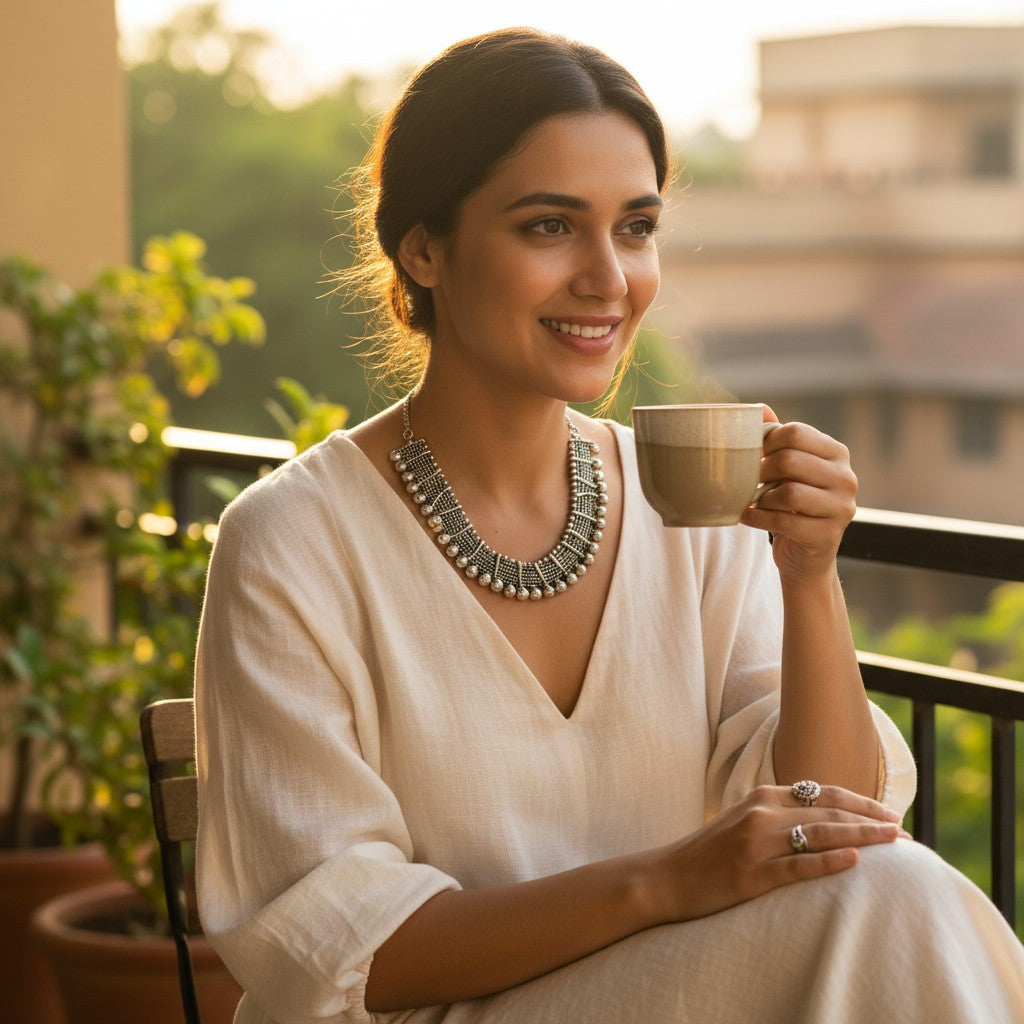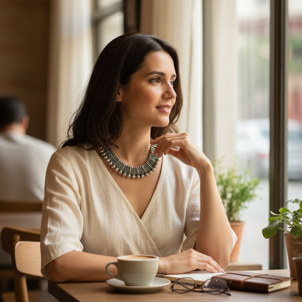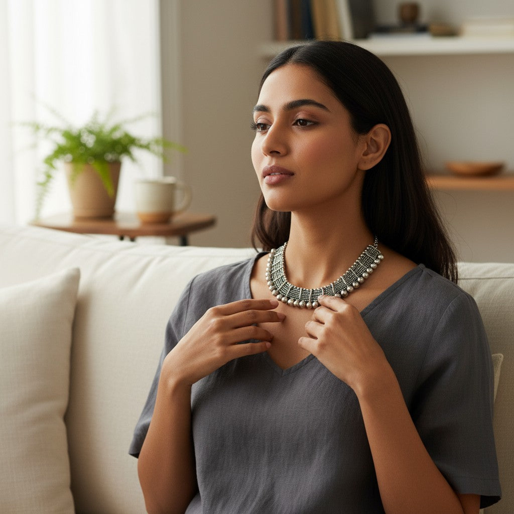 Capture understated elegance with the Dajinn Oxidized Silver Threadwork Choker Necklace, expertly handcrafted by Indian artisans. This distinctive piece highlights a panel of intricate thread-inspired designs bordered with polished silver beads. Its lightweight and minimal silhouette is perfect for daily wear, layering, or elevating both ethnic and contemporary fashion. All Dajinn jewelry arrives in beautiful Signature Gift Boxes.