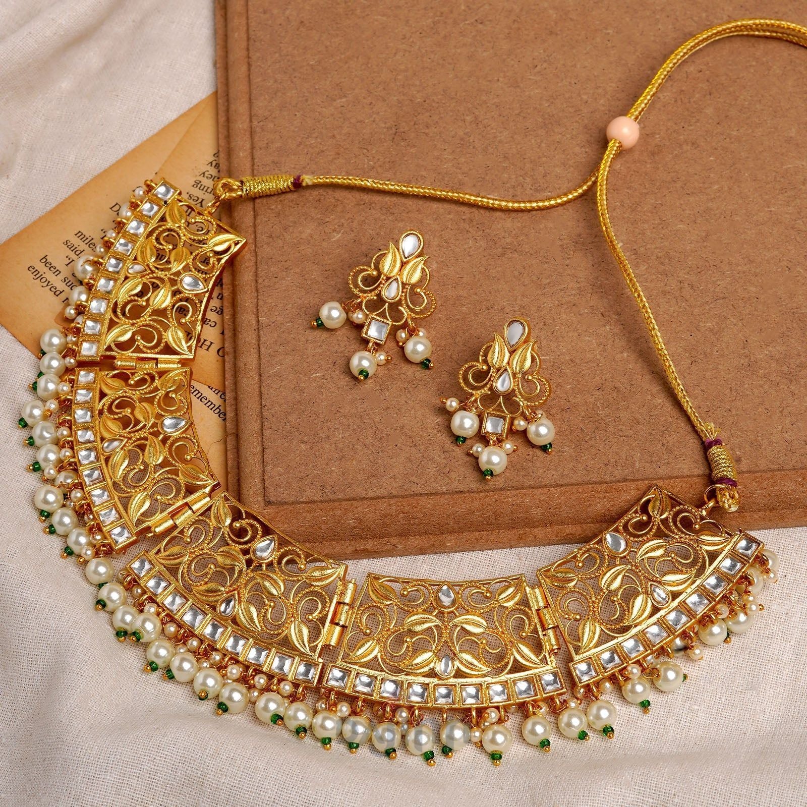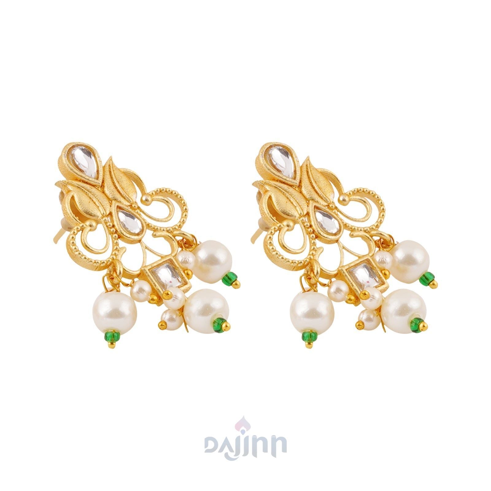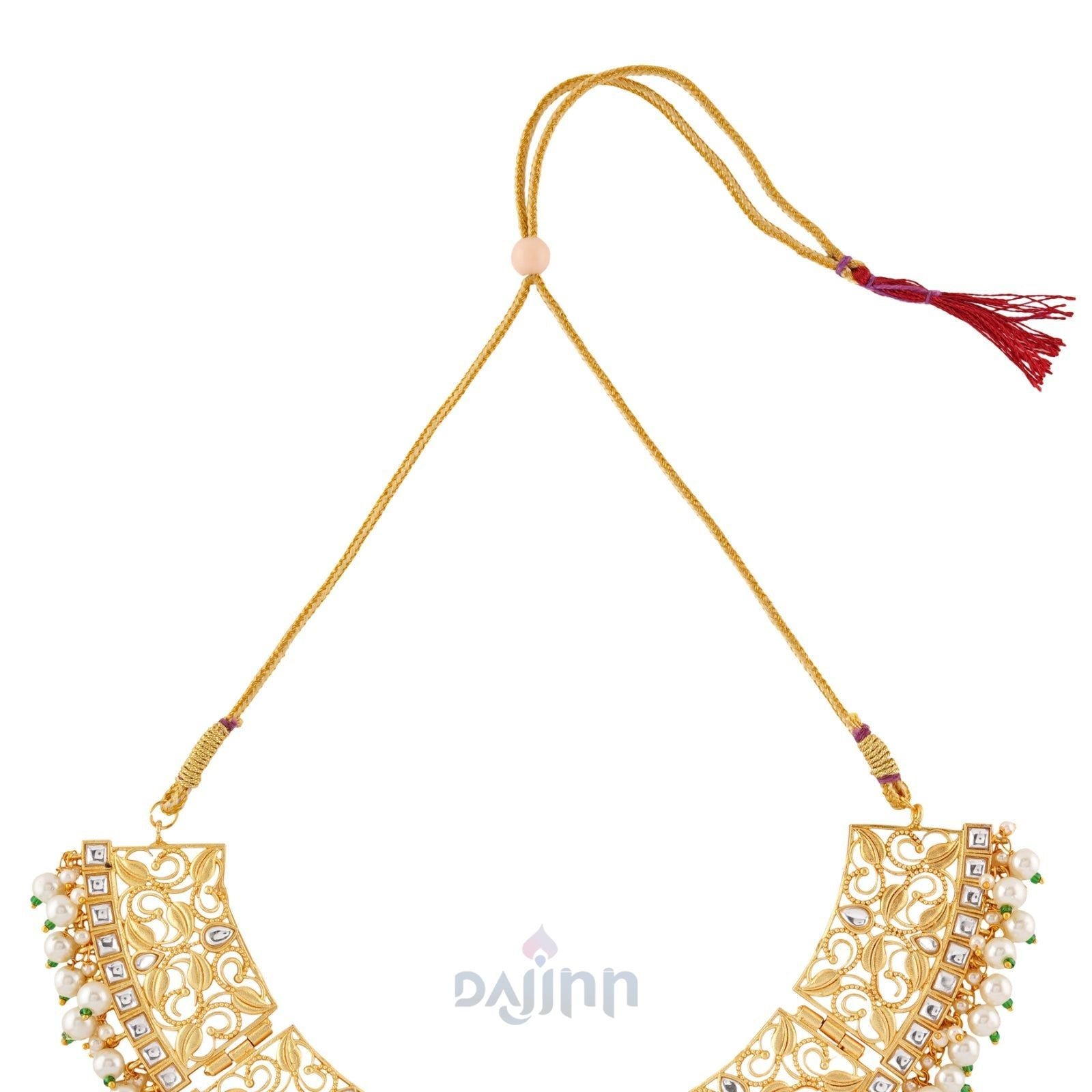 Step into your Desi Queen persona with our Dajinn Revika pearl and gold necklace and earring set, exuding regal charm with intricate detailing; a perfect gift to empower your fellow queen and embrace boho regency together.