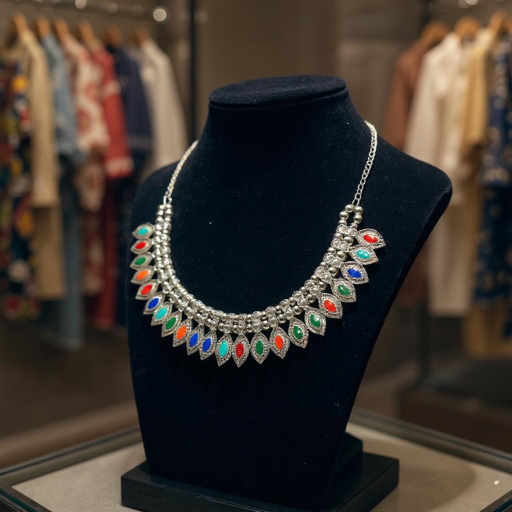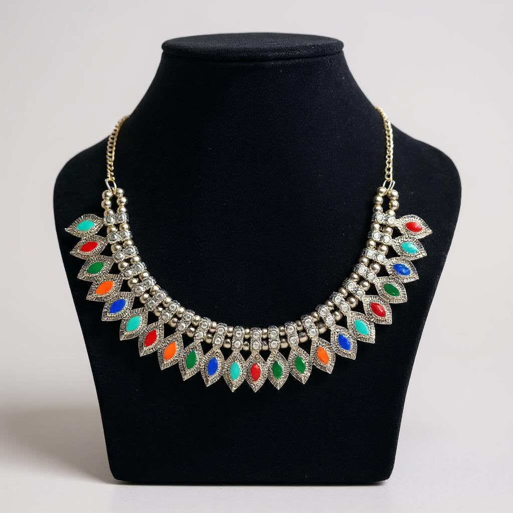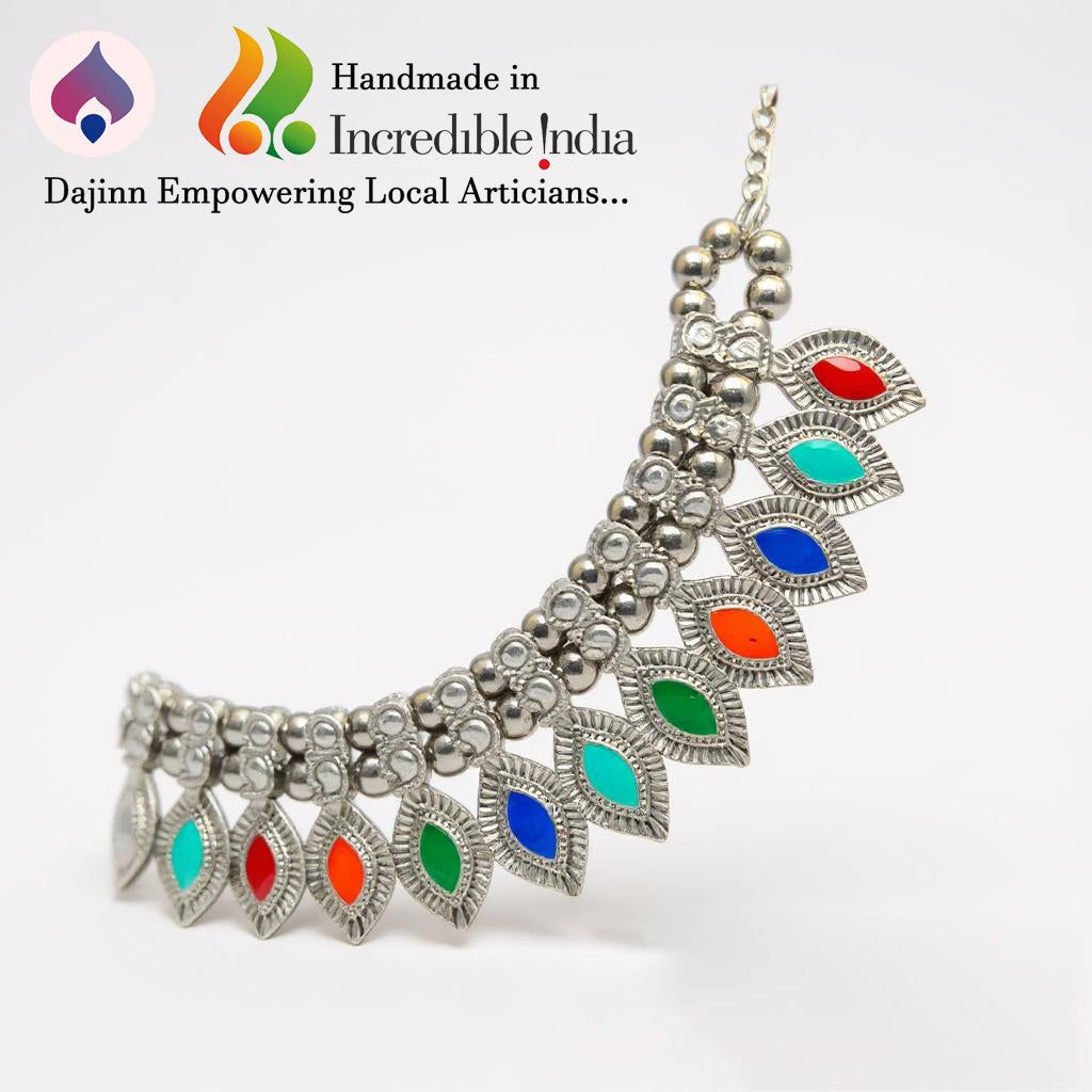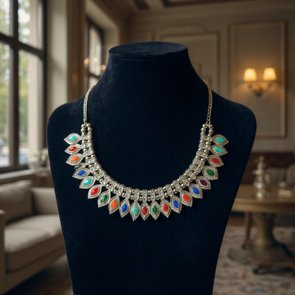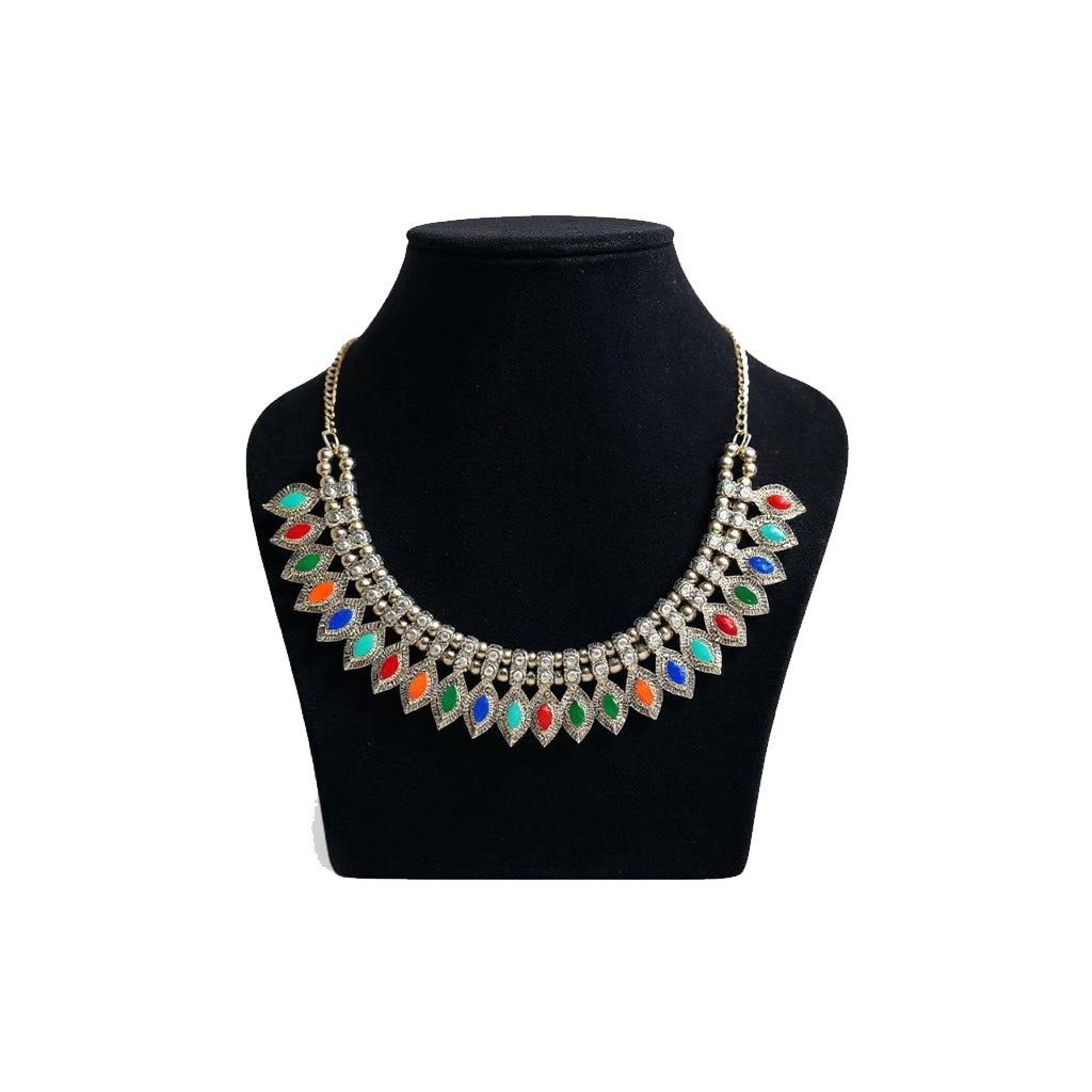 Add a touch of royal elegance to your ethnic look with the Dajinn Regal Leaf Oxidized Brass Necklace. Crafted with precision, this exquisite necklace features a elegant finish with intricate leaf motifs and delicate bead detailing. A perfect blend of traditional charm and contemporary style, this statement piece is ideal for weddings, festive occasions, cultural events, and parties. Designed to complement sarees, lehengas, and ethnic gowns, this timeless jewelry is a must-have addition to your collection.