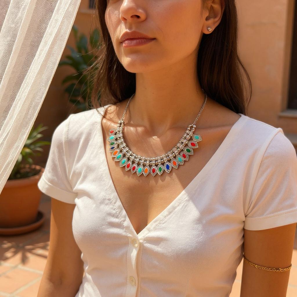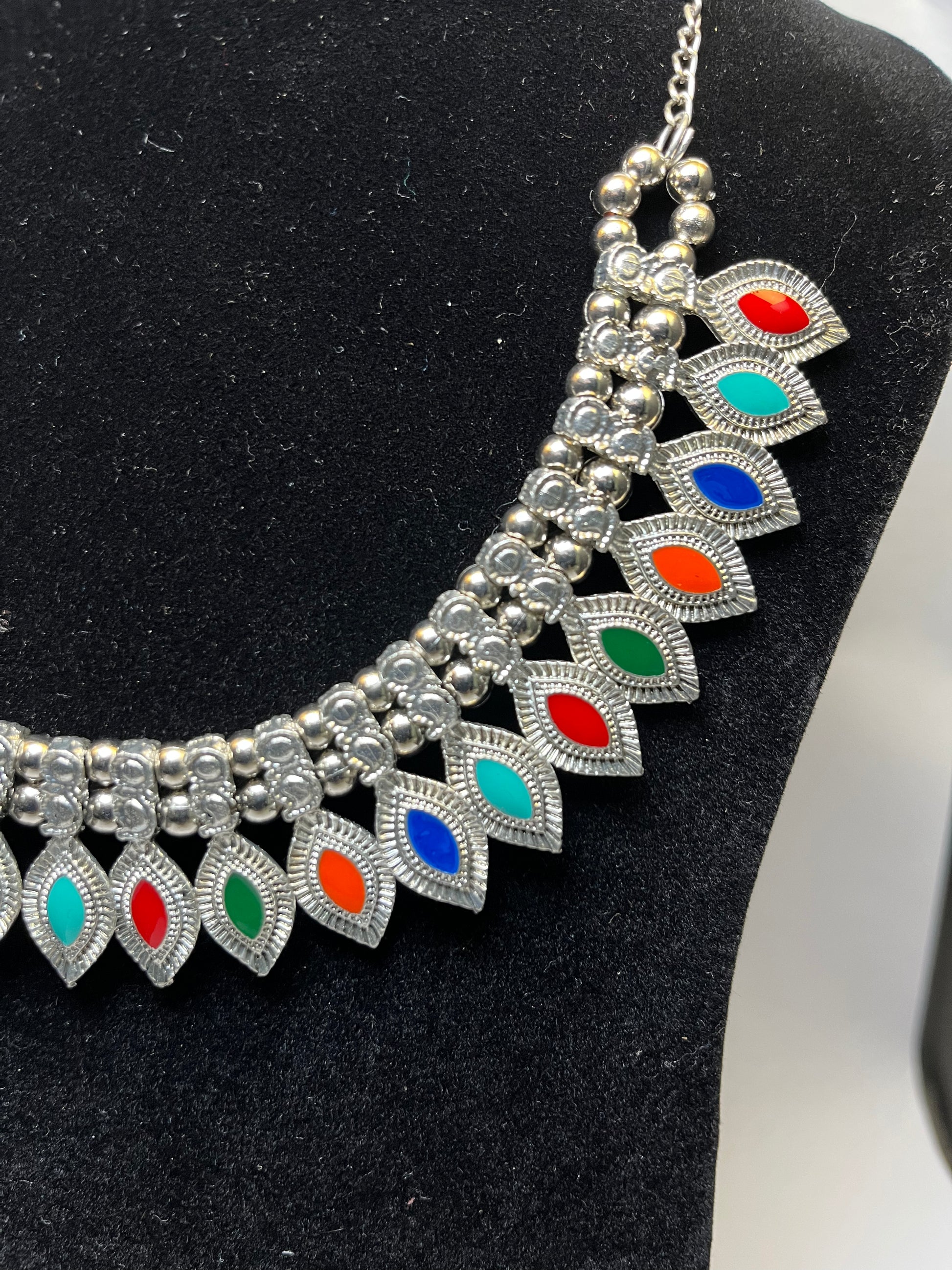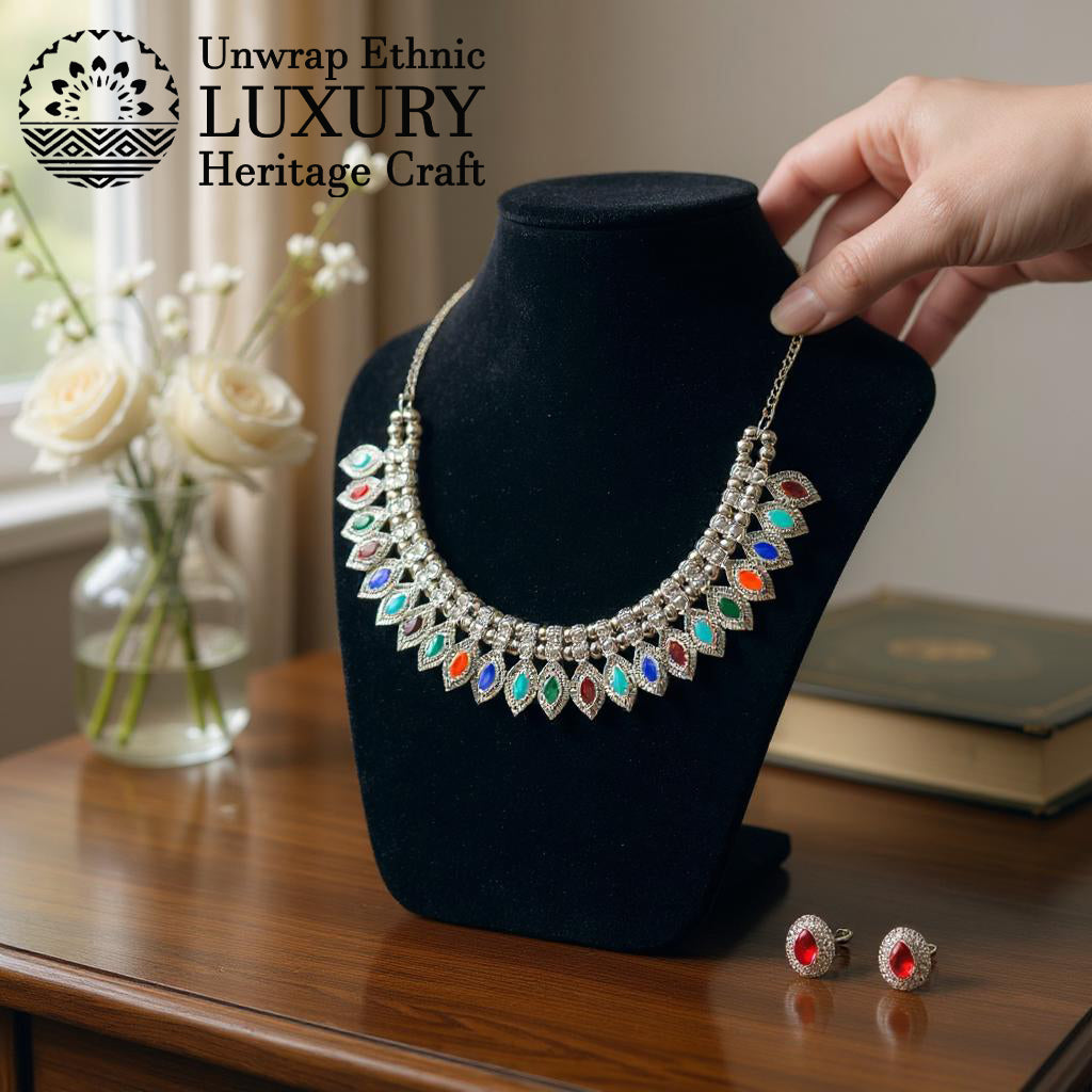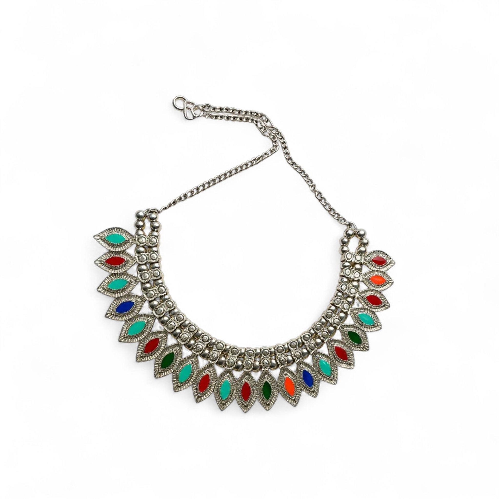 Add a touch of royal elegance to your ethnic look with the Dajinn Regal Leaf Oxidized Brass Necklace. Crafted with precision, this exquisite necklace features a elegant finish with intricate leaf motifs and delicate bead detailing. A perfect blend of traditional charm and contemporary style, this statement piece is ideal for weddings, festive occasions, cultural events, and parties. Designed to complement sarees, lehengas, and ethnic gowns, this timeless jewelry is a must-have addition to your collection.