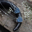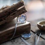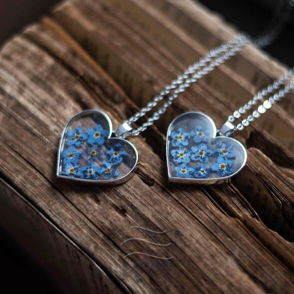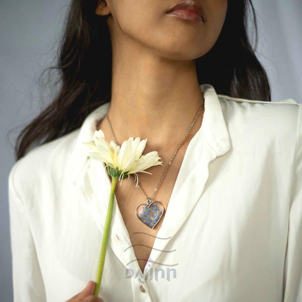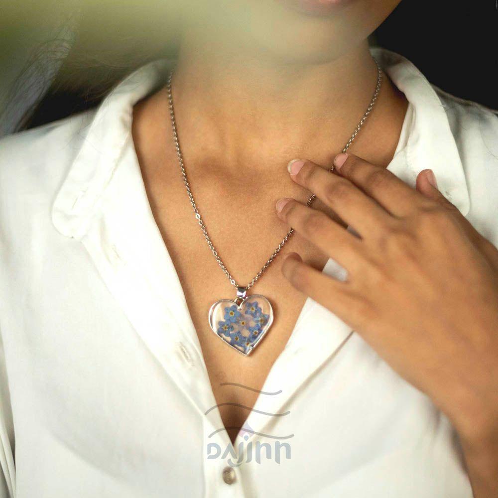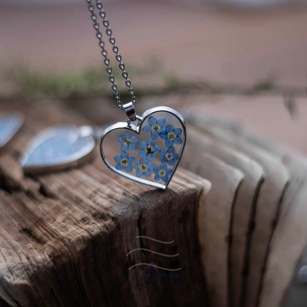 This piece was created with pressed Forget-me-not flower inside a heart shaped metal bezel with resin so that they can be preserved forever. It comes with a delicate silver coated alloy chain.