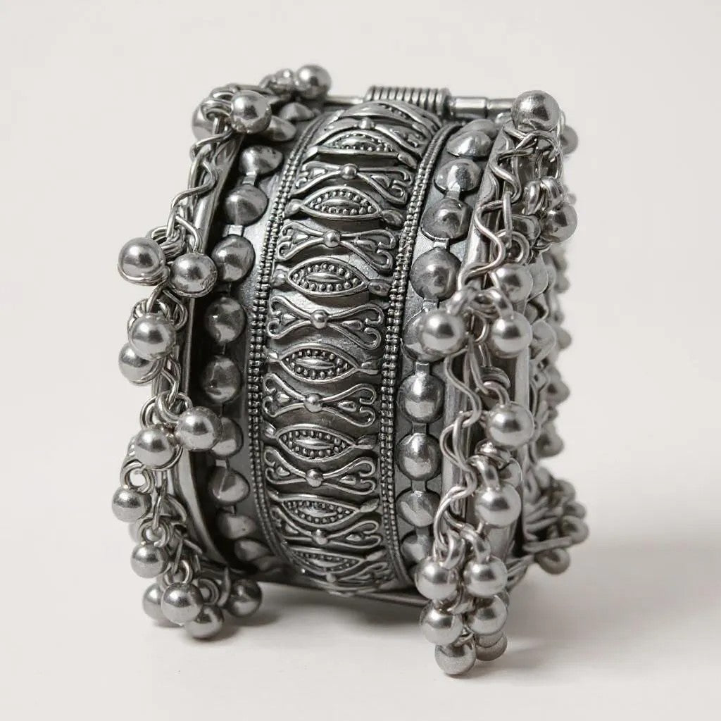 Embrace timeless tradition with the Dajinn Regal Harmony Bangles Collection, designed to add grace and elegance to every occasion. Crafted with exquisite detailing, these bangles combine antique gold and silver finishes, making them a perfect accessory for weddings, festivals, and special celebrations. The lightweight yet durable design ensures all-day comfort while keeping your ethnic look royal and stylish.