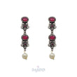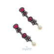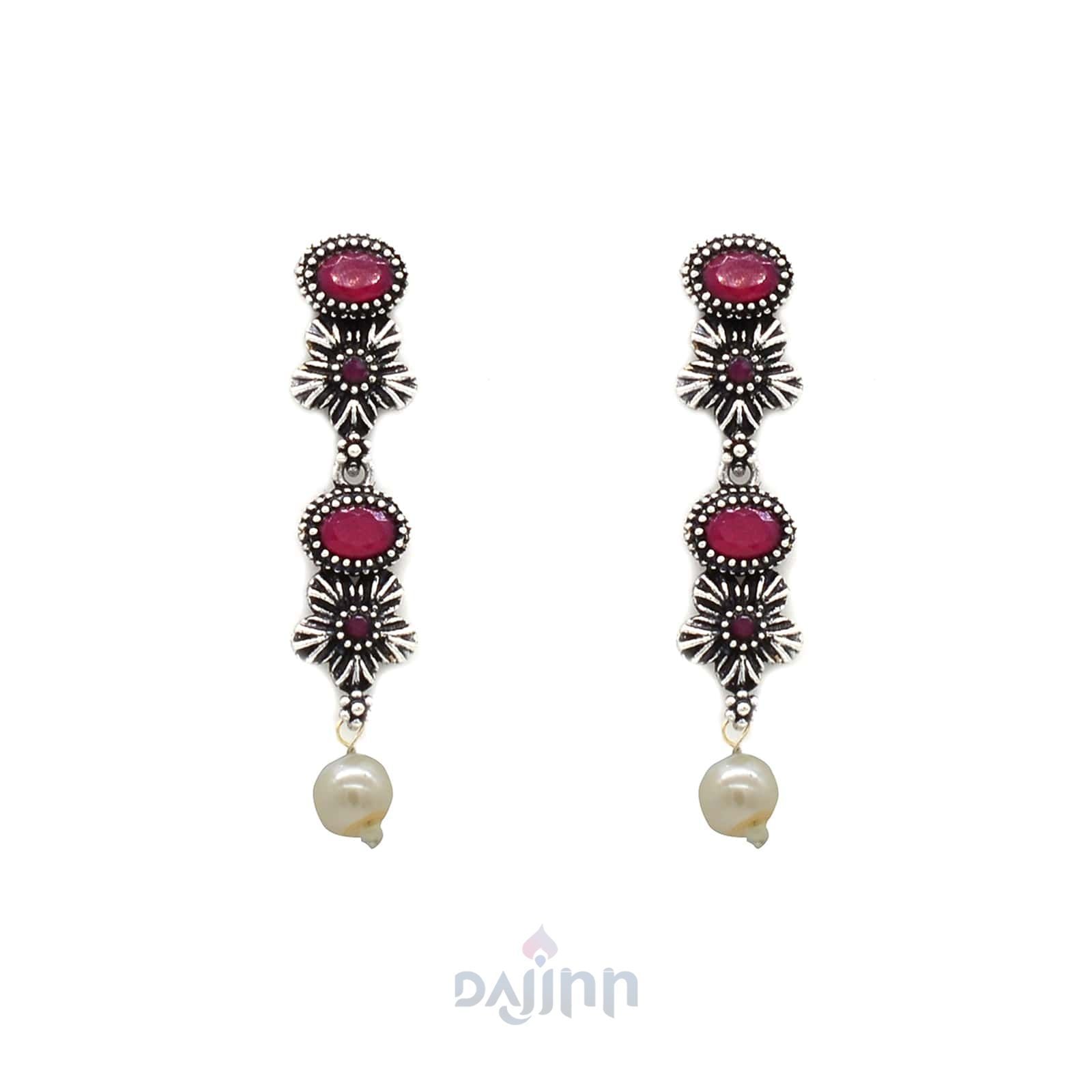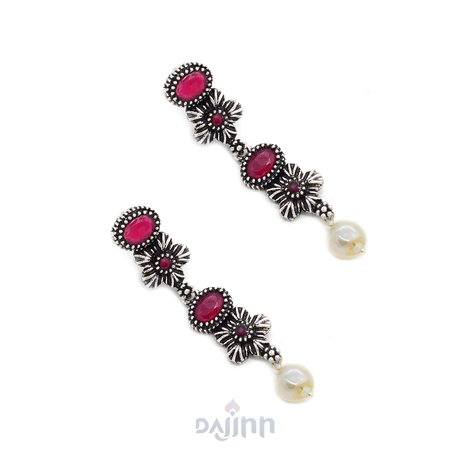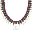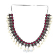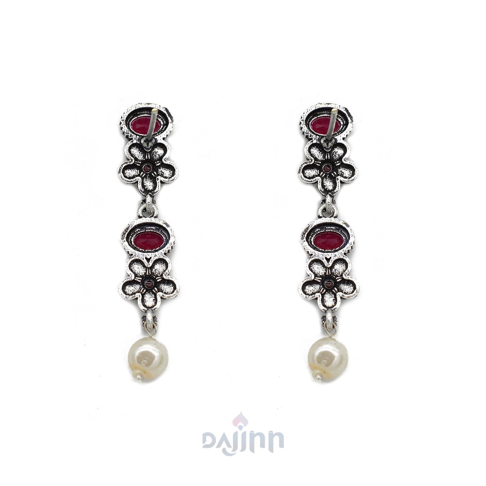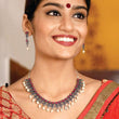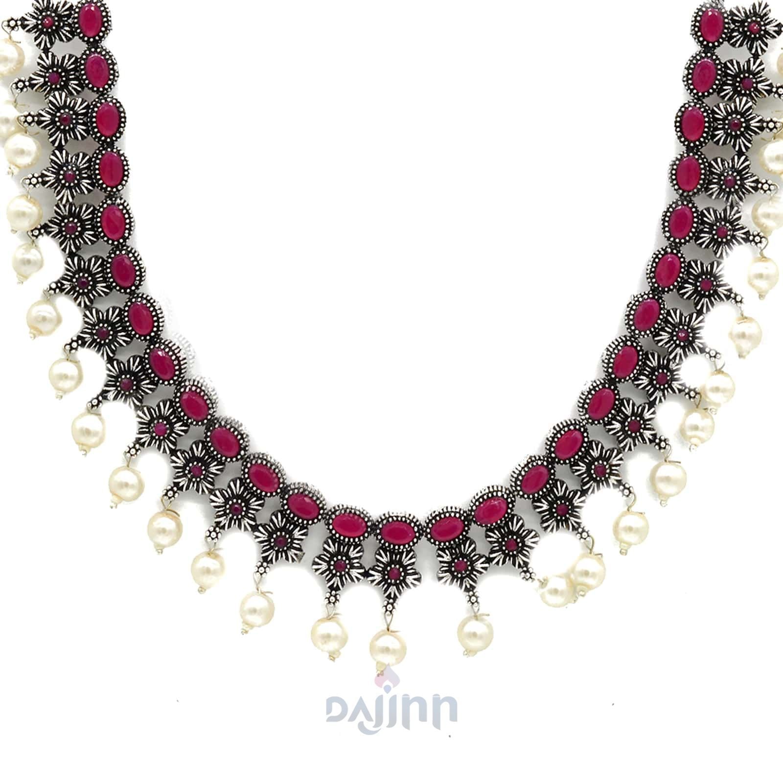 Grand and unapologetically statement-making, this beautiful handcrafted necklace lace your collar bones, and earrings to complement and amplify your look! Handcrafted in german silver with oxidized silver plating, this necklace set features beautiful faux stones, floral elements and hanging pearls that add the finishing touch. Both the pieces work beautifully together as a set and can amp up any outfit and dress it up in an instant.