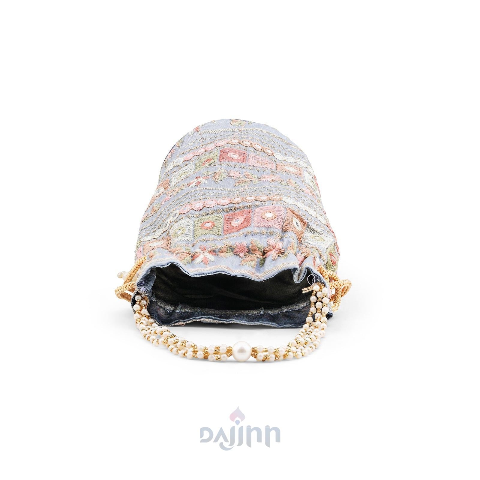 The Rangisari Grey Potli bag is a stunning accessory that combines elegance with craftsmanship. Its intricate embroidery and luxurious silver finish are perfect for adding grace to any traditional ensemble.
