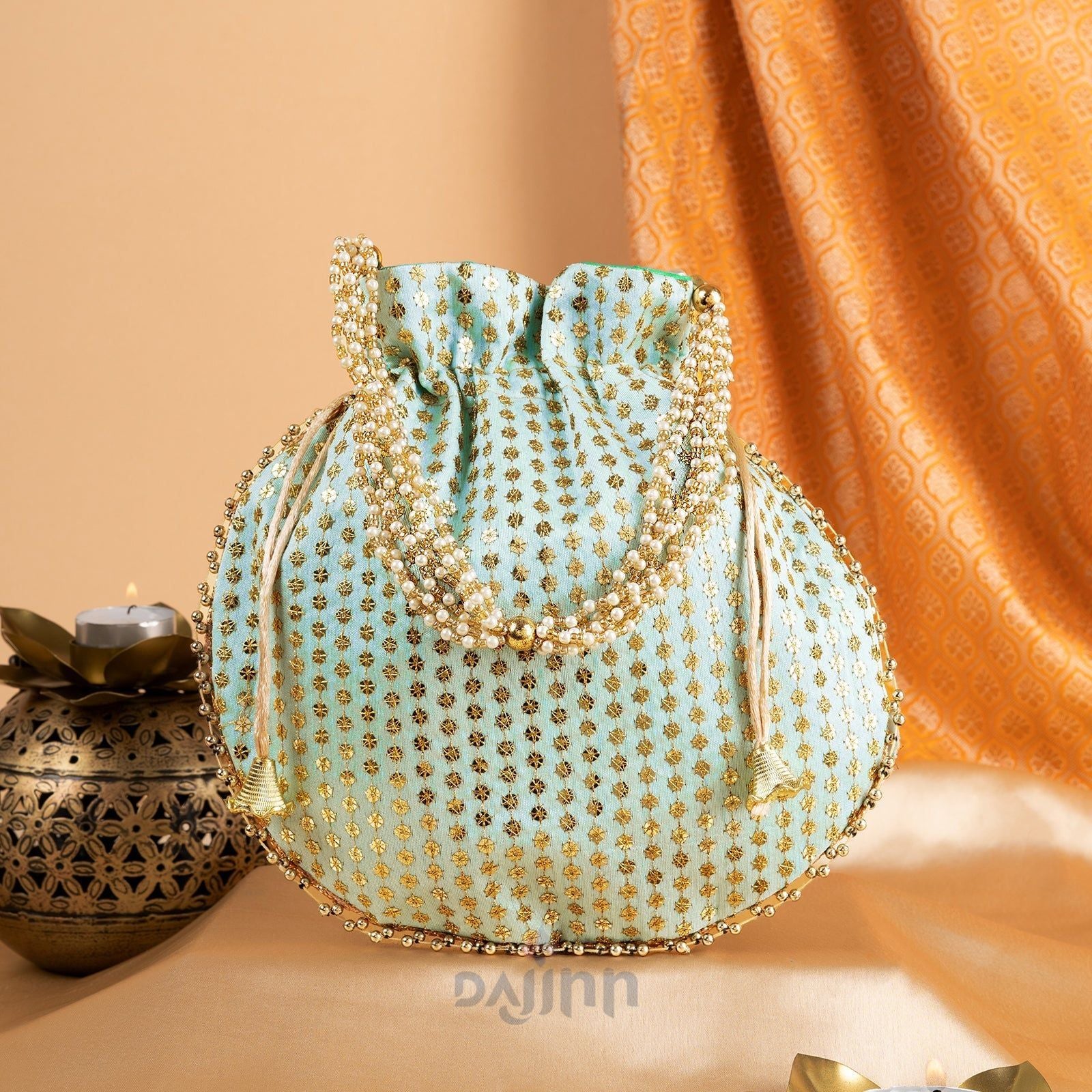 The Rimjhim Gire Saawan Sea Green Zari Embroidered Potli Bag embodies timeless elegance. Adorned with beautiful embroidery, it adds a touch of grace to any traditional outfit